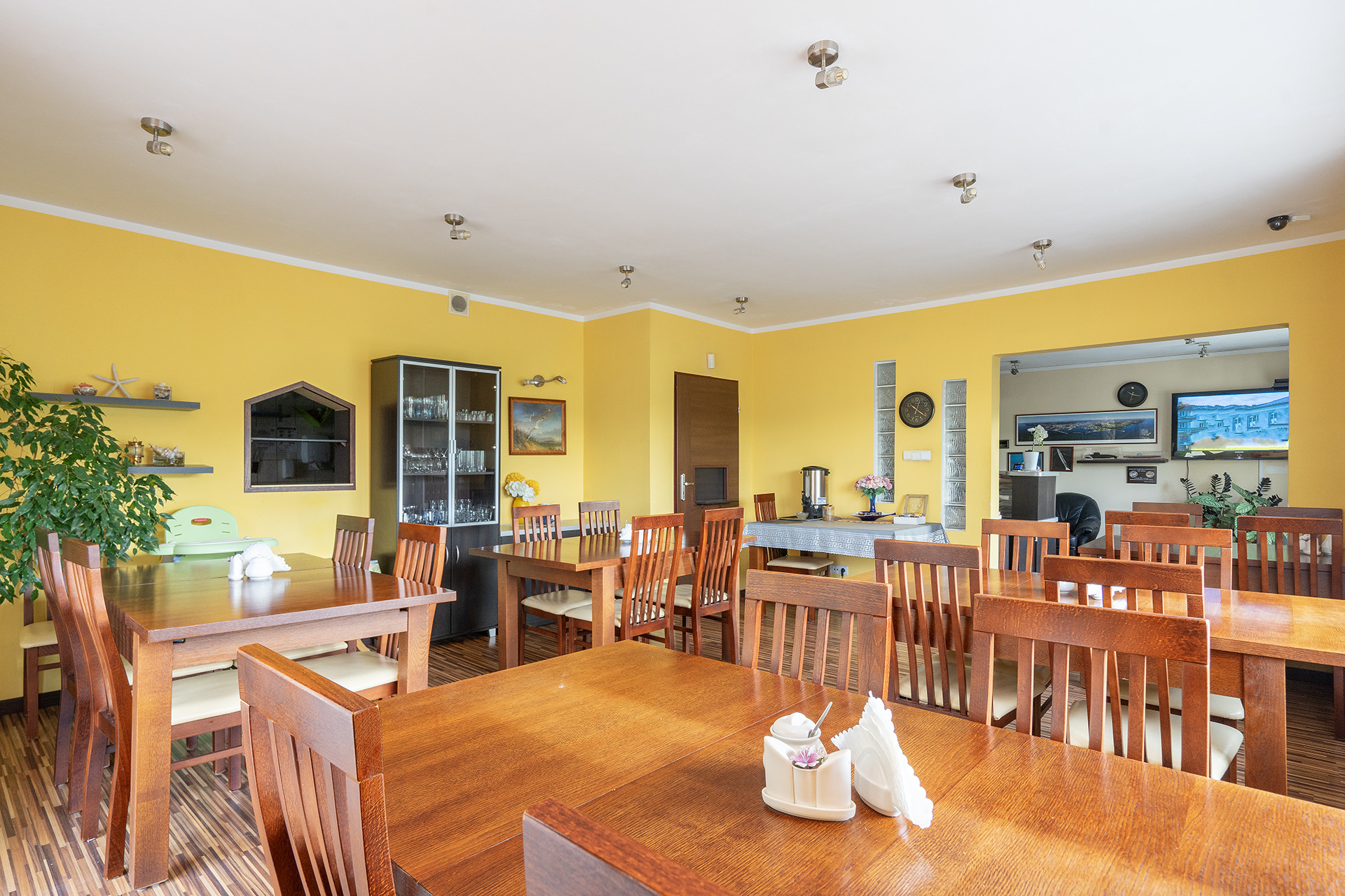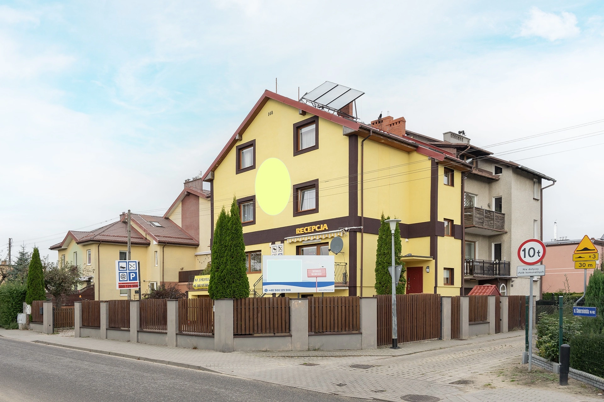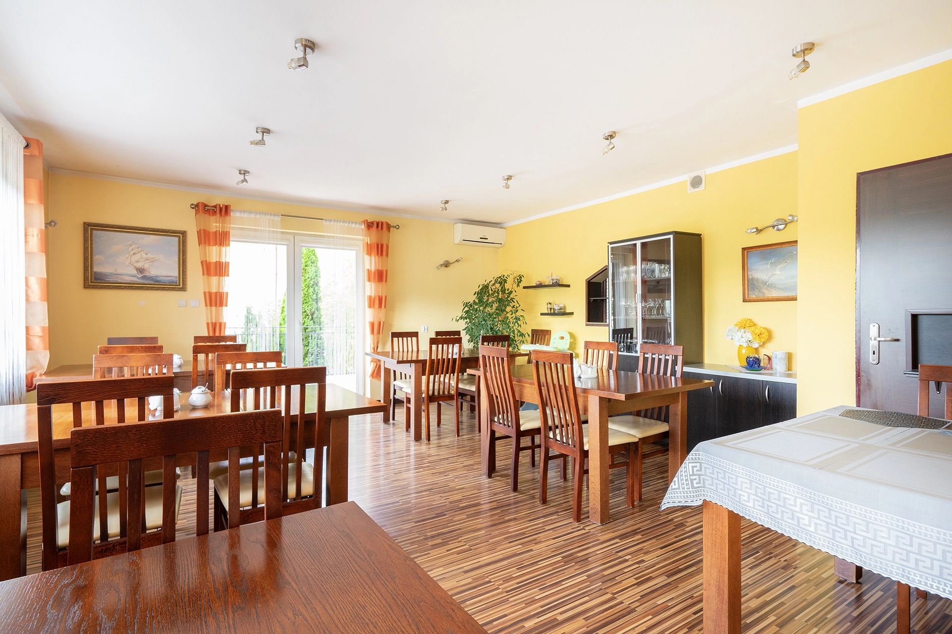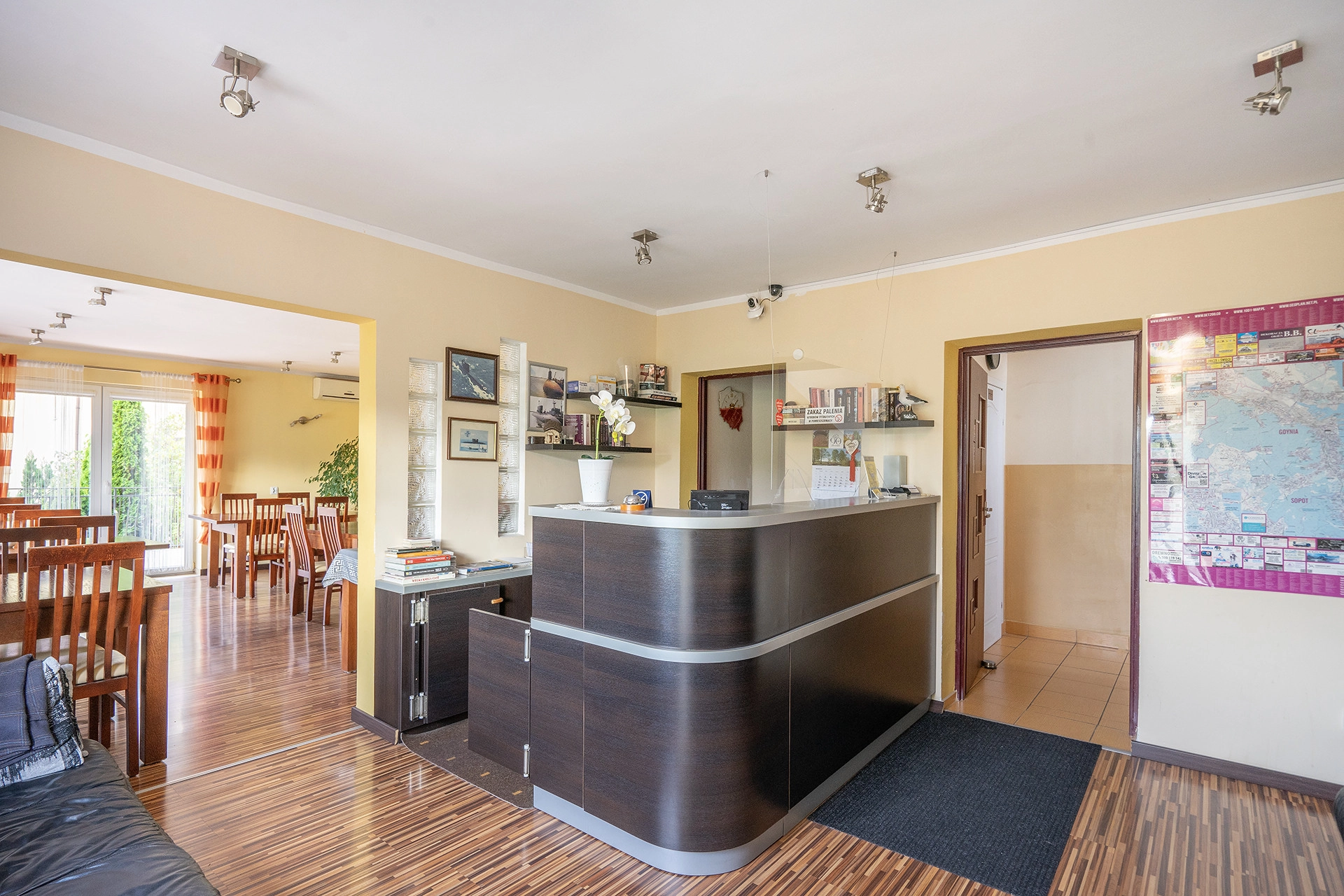 Składa się z 8 niezależnych pokoi z łazienkami, sali restauracyjnej, recepcji, zaplecza dla pracowników, kuchni, pralni i magazynu. Całkowita powierzchnia użytkowa to 350 m2. Nieruchomość jest bardzo ciekawie zaaranżowana. Dla gości wynajmujących pokoje, dwa niezależne wejścia do budynku. Pokoje o różnym poziomie wyposażenia, dostosowane do różnych potrzeb klientów. Znajdziemy tu apartament dla pary, czy też pokoje z pojedynczymi łóżkami. Dom ma w pełni wyposażoną kuchnie i zaplecze gospodarcze spełniające wymogi sanitarne i wszystkie standardy.