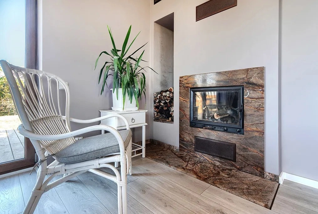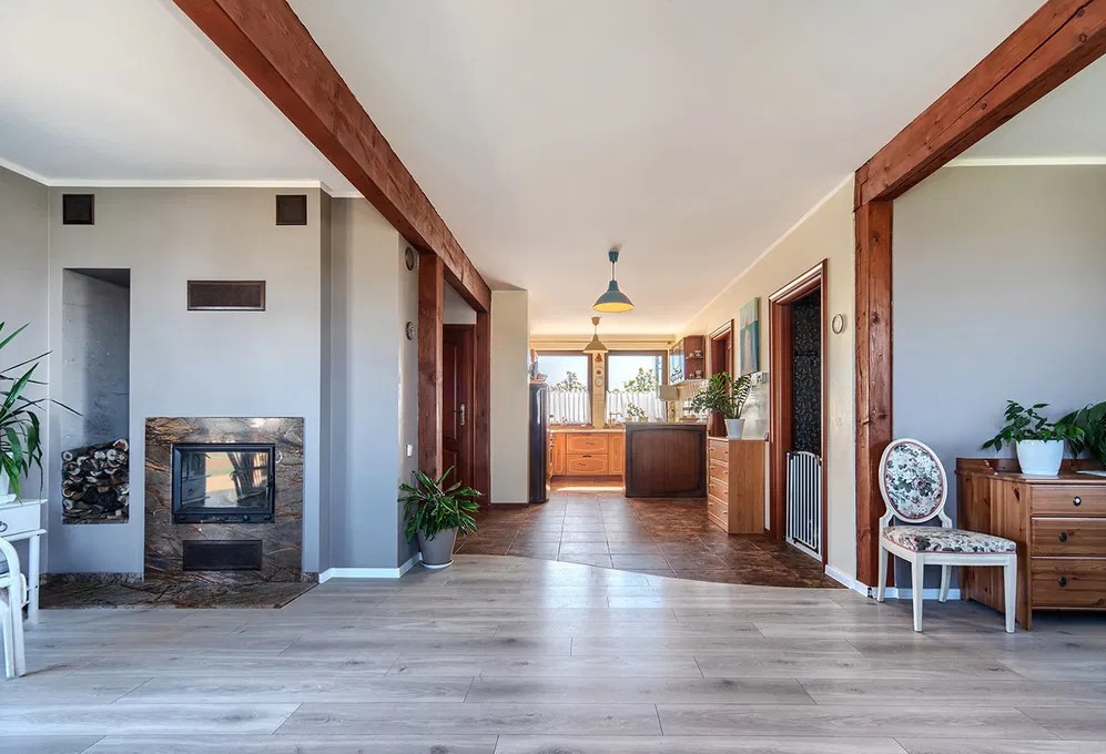 – salon z jadalnią i kominkiem ( 33,5 m2); stąd wyjście na taras oraz bardzo starannie utrzymany ogród (o wystawie południowo-zachodniej),
