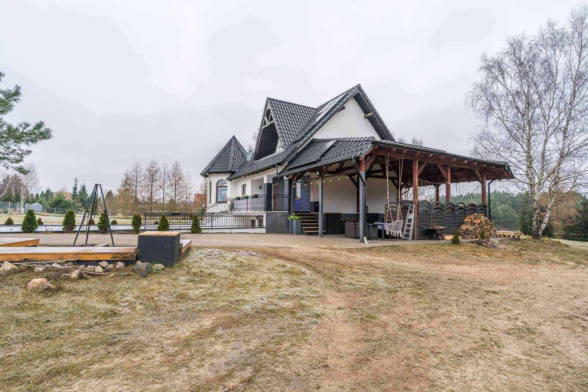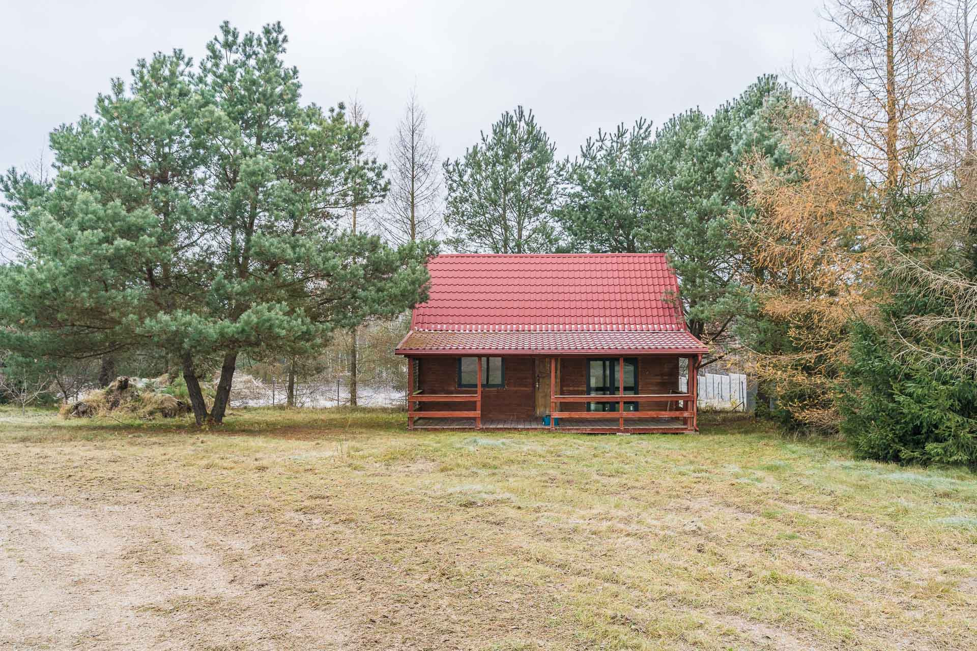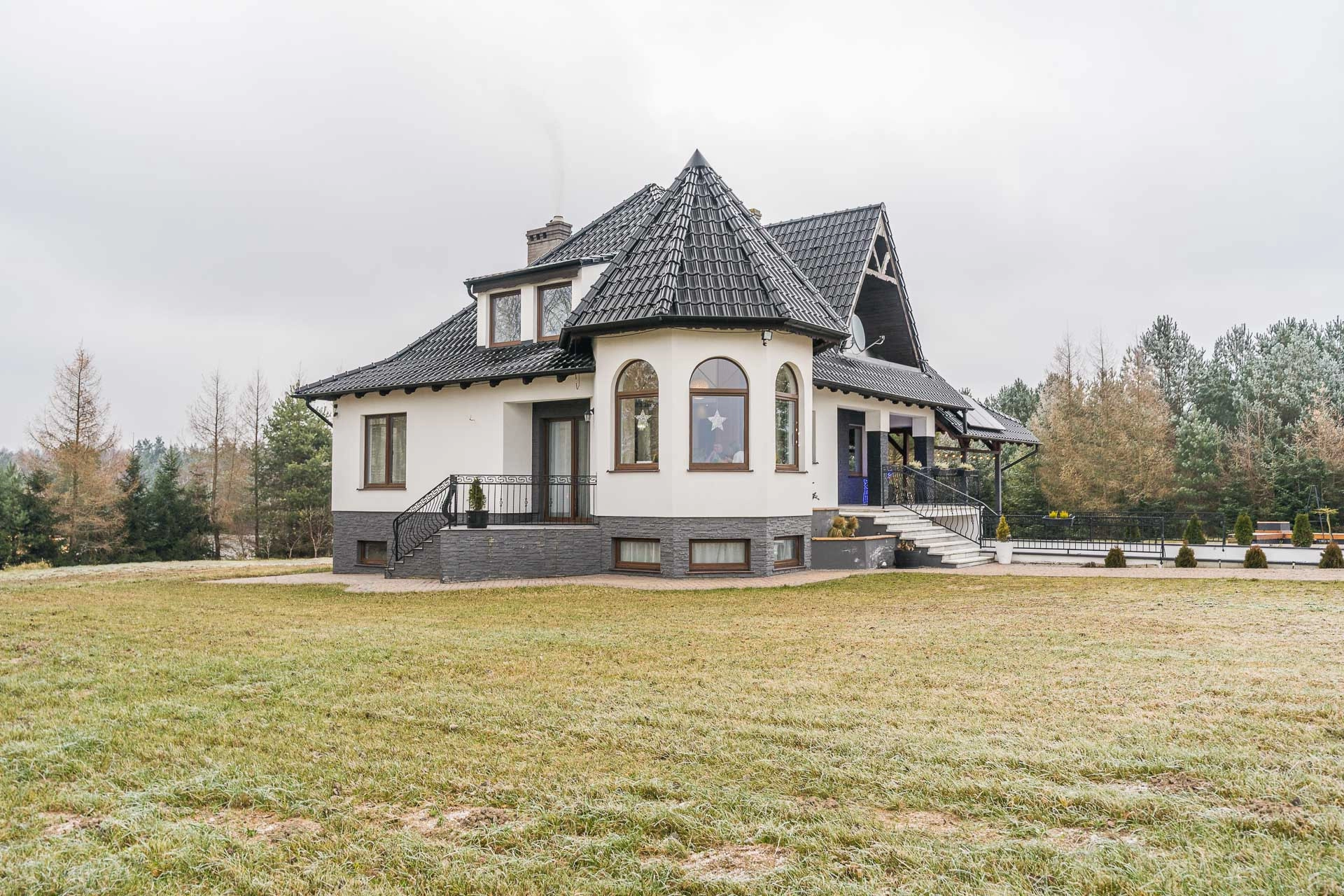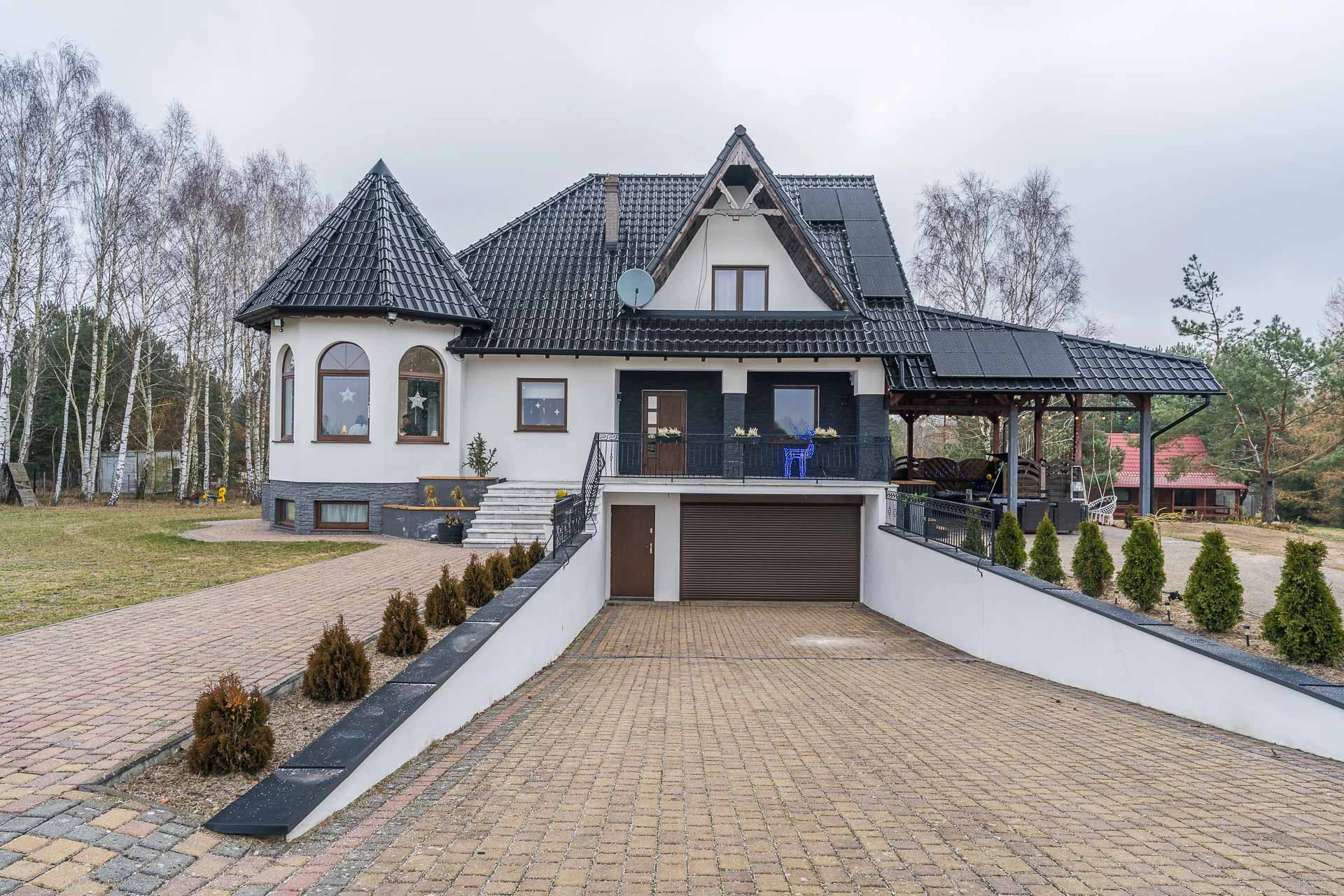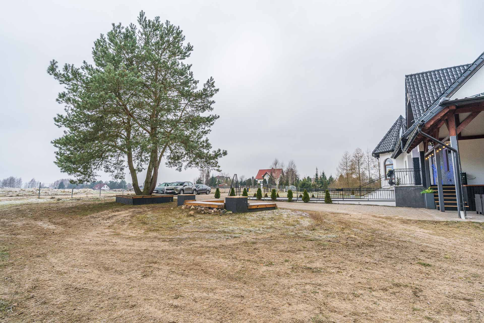 Działka o powierzchni 5073 m² ma regularny kształt i zapewnia wygodny dojazd drogą gminną z płyt betonowych. Na posesję prowadzą dwa wjazdy, a bramy – zarówno wjazdowa, jak i do garażu – sterowane są pilotem. Na terenie działki znajduje się wydzielone miejsce na grilla. Nieruchomość jest wyposażona w szambo o pojemności 1000 l oraz podłączona do gminnej sieci wodociągowej. Teren porastają malownicze sosny i brzozy, a całość ogrodzona jest metalową siatką na solidnym fundamencie. Dodatkowym atutem jest domek letniskowy o powierzchni 35 m², idealny pod wynajem lub dla gości. Na parterze znajduje się taras, salon z aneksem kuchennym oraz łazienka, natomiast na piętrze – dwie przytulne sypialnie. Cały podjazd przed domem został wyłożony kostką brukową.