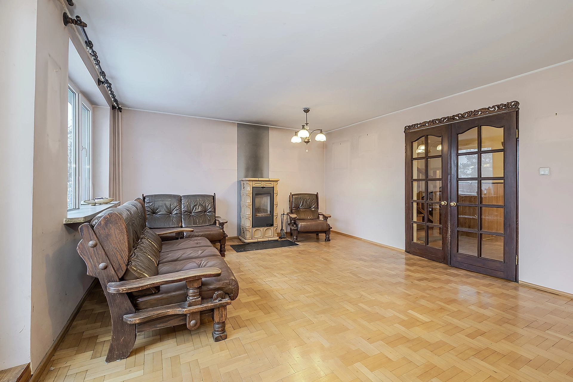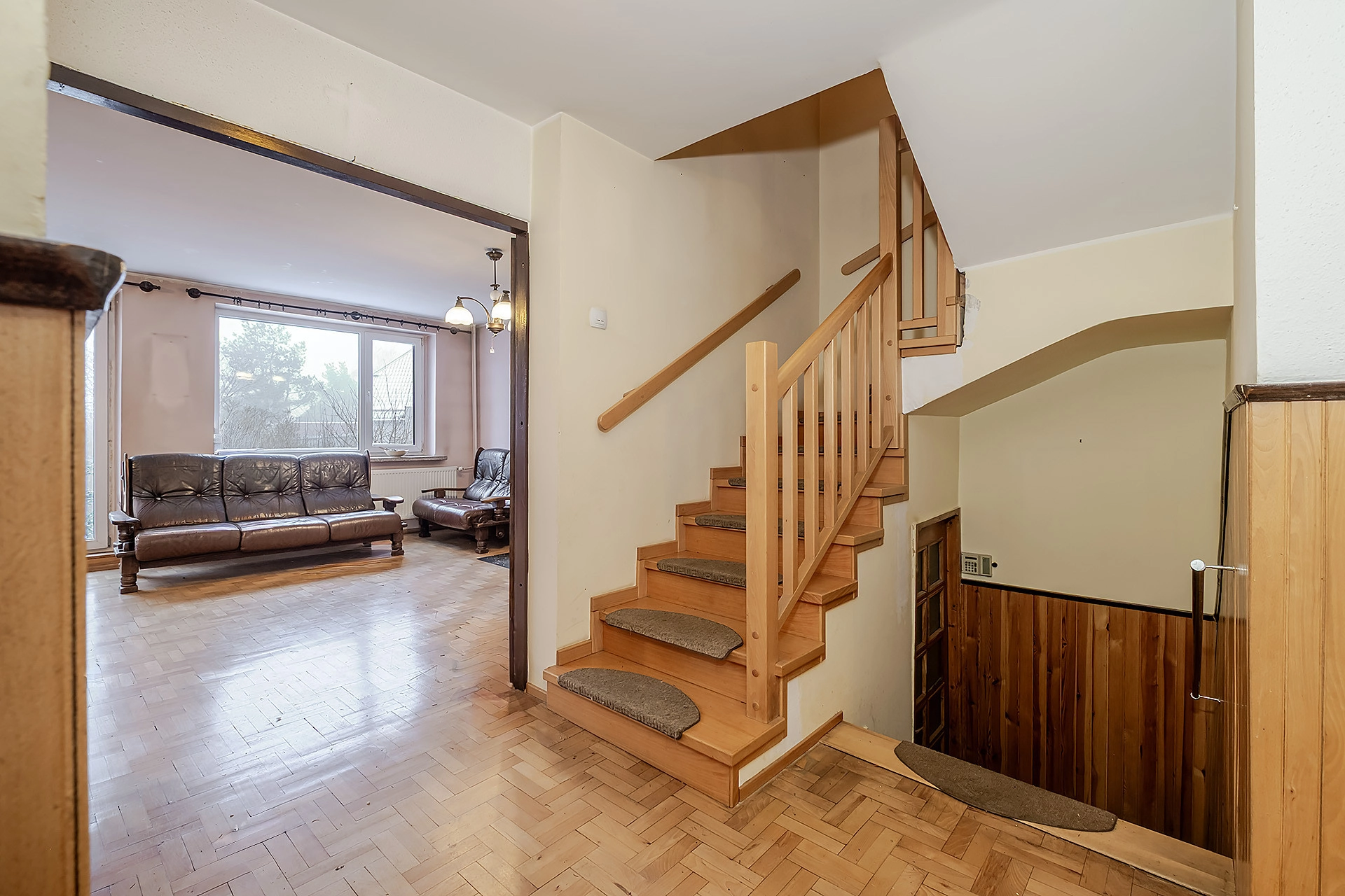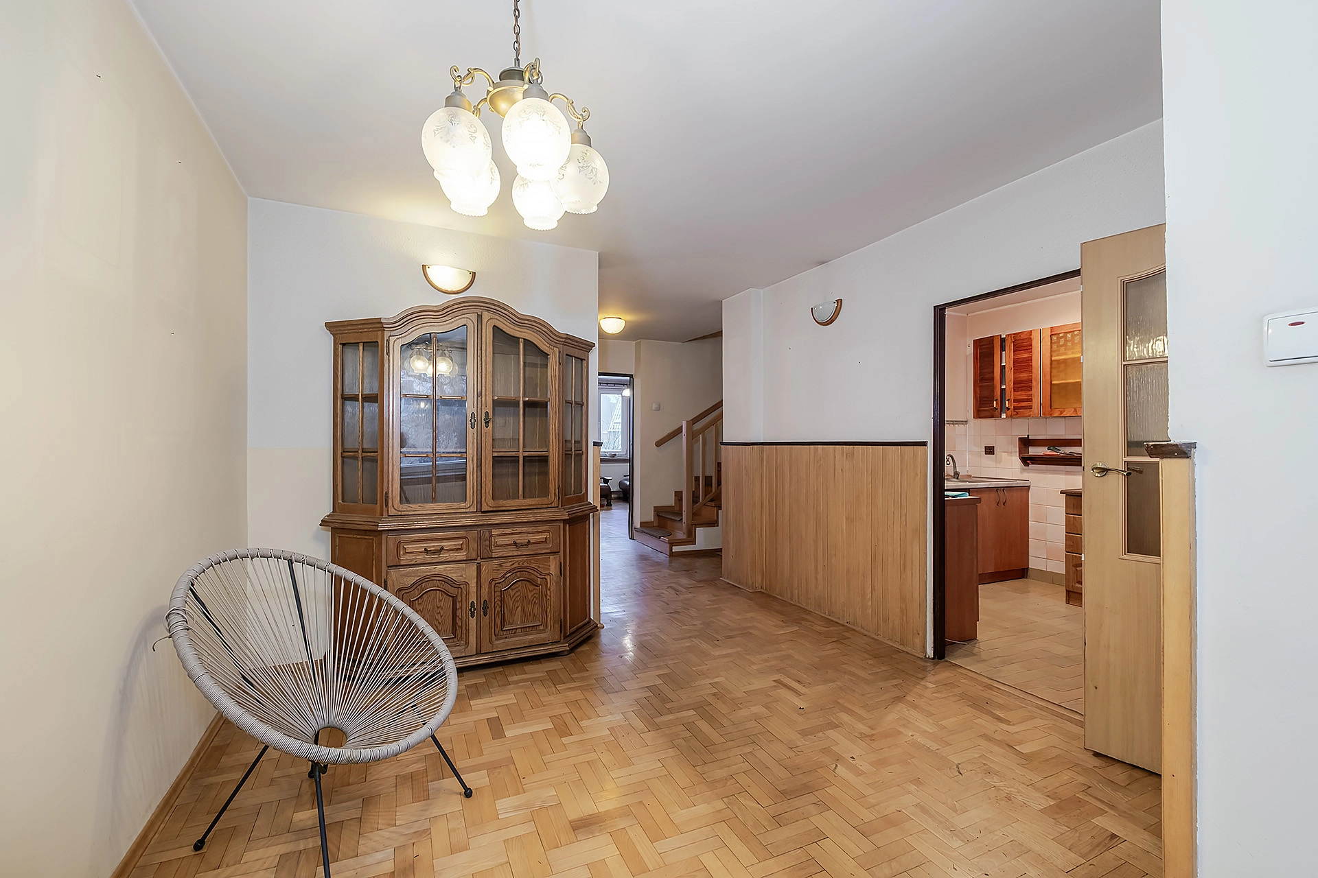 Dom jest dwustronny północ – południe. Układ pomieszczeń jest funkcjonalny, a pokoje mają regularne kształty, co ułatwia aranżację wnętrz. Okna PCV, na podłodze położony został drewniany parkiet, który utrzymany jest w bardzo dobrym stanie. Do domu doprowadzone ogrzewanie i woda miejska. W zabudowie budynku znajduję się garaż 1 – stanowiskowy. Dach pokryty papą – po remoncie, instalacja elektryczna miedziana. Istnieje możliwość przejścia na ogrzewanie gazowe, obecne opłaty (zimą) 1200 zł GPEC i 97 zł śmieci.