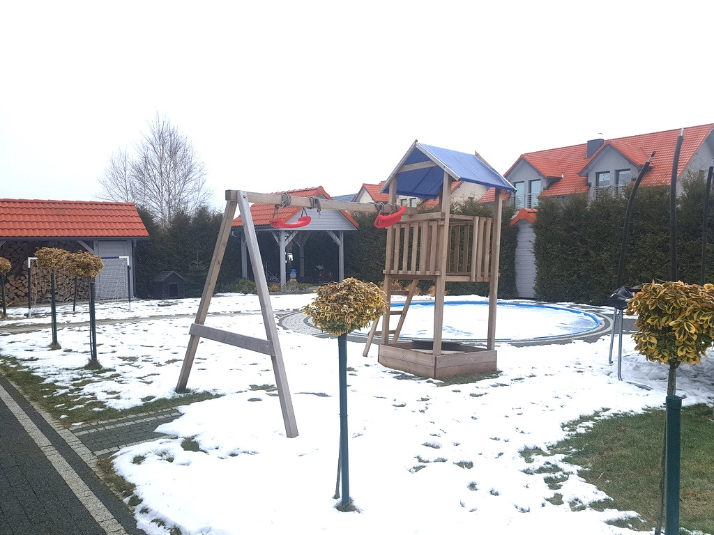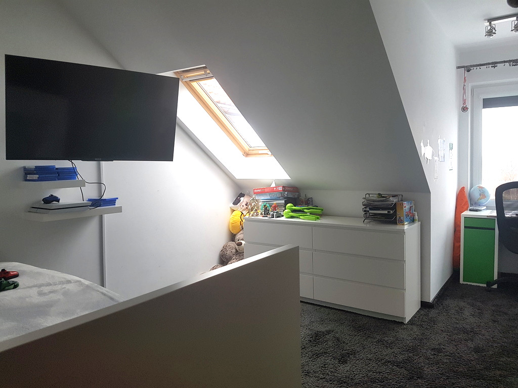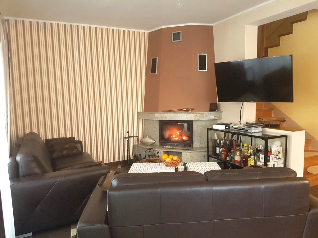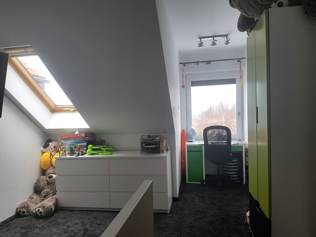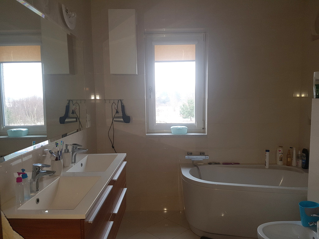 Na parterze znajduje się salon z kominkiem z aneksem kuchennym, łazienka i wiatrołap. Z wiatrołapu bezpośrednie wejście do garażu jednostanowiskowego. Na piętrze znajdują się 4 sypialnie oraz przestronna łazienka. Z salonu wyjście do ogrodu zimowego. Dom został zbudowany i wykończony wysokiej klasy materiałami. Zastosowane zostały nowoczesne rozwiązania wpływające na energooszczędność – pompa ciepła, rekuperacja, instalacja solarna. Posesja ogrodzona, ładnie zagospodarowany ogród z basenem. Przed domem wiata na drugie auto. Dodatkowo nieruchomość posiada klimatyzację.