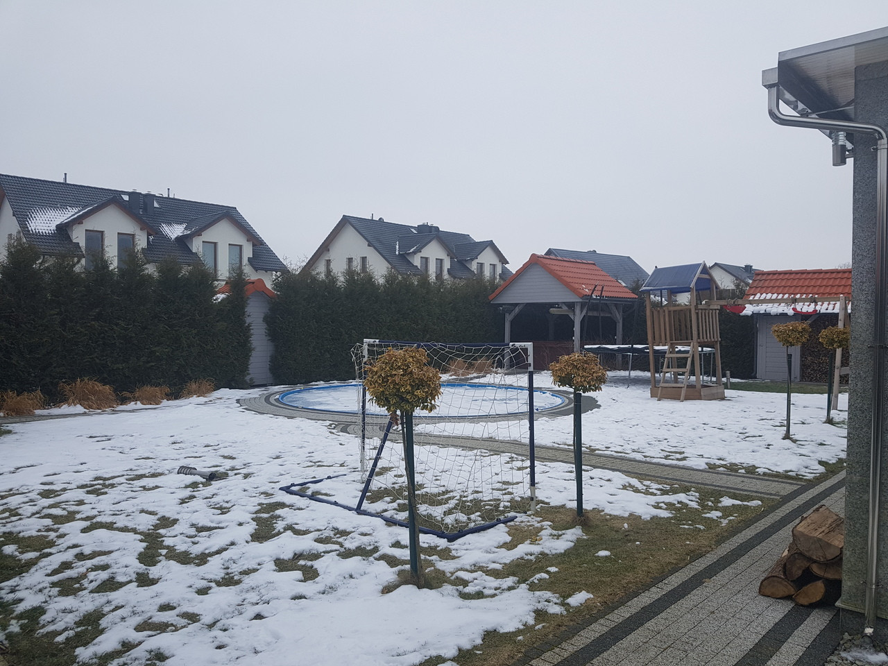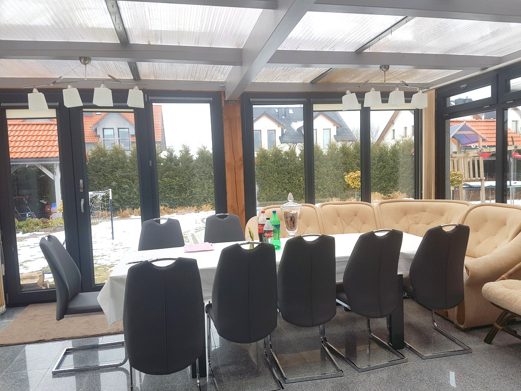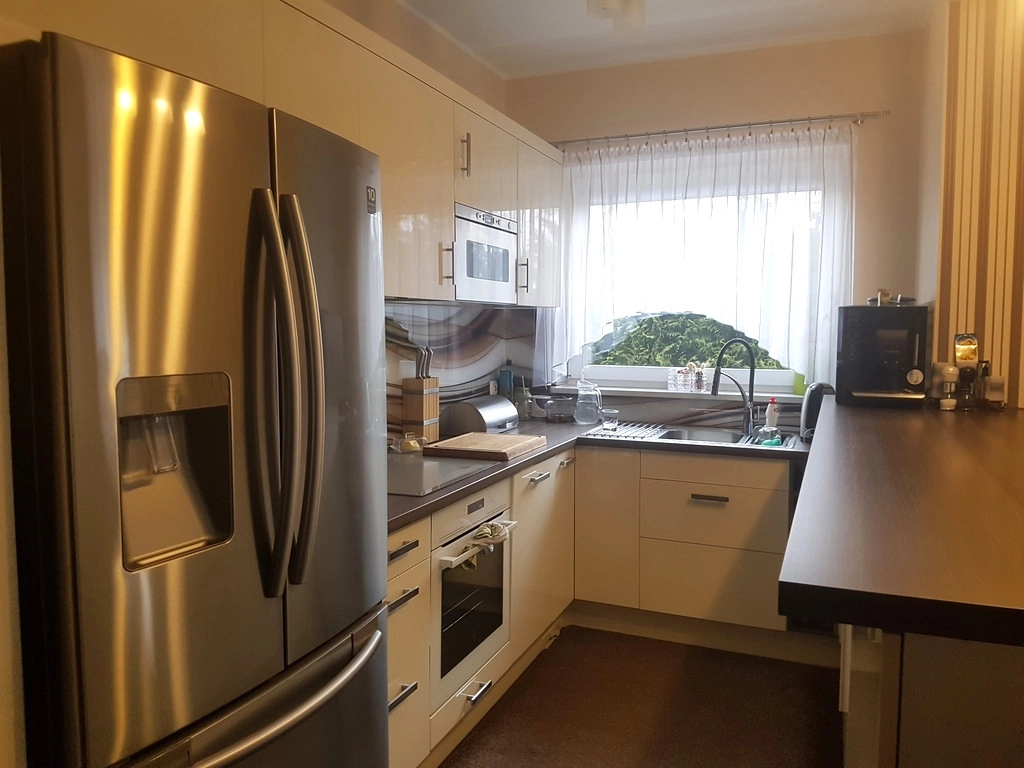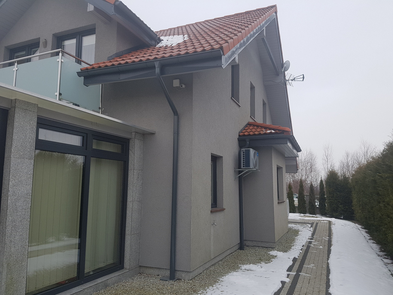 Na parterze znajduje się salon z kominkiem z aneksem kuchennym, łazienka i wiatrołap. Z wiatrołapu bezpośrednie wejście do garażu jednostanowiskowego. Na piętrze znajdują się 4 sypialnie oraz przestronna łazienka. Z salonu wyjście do ogrodu zimowego. Dom został zbudowany i wykończony wysokiej klasy materiałami. Zastosowane zostały nowoczesne rozwiązania wpływające na energooszczędność – pompa ciepła, rekuperacja, instalacja solarna. Posesja ogrodzona, ładnie zagospodarowany ogród z basenem. Przed domem wiata na drugie auto. Dodatkowo nieruchomość posiada klimatyzację.