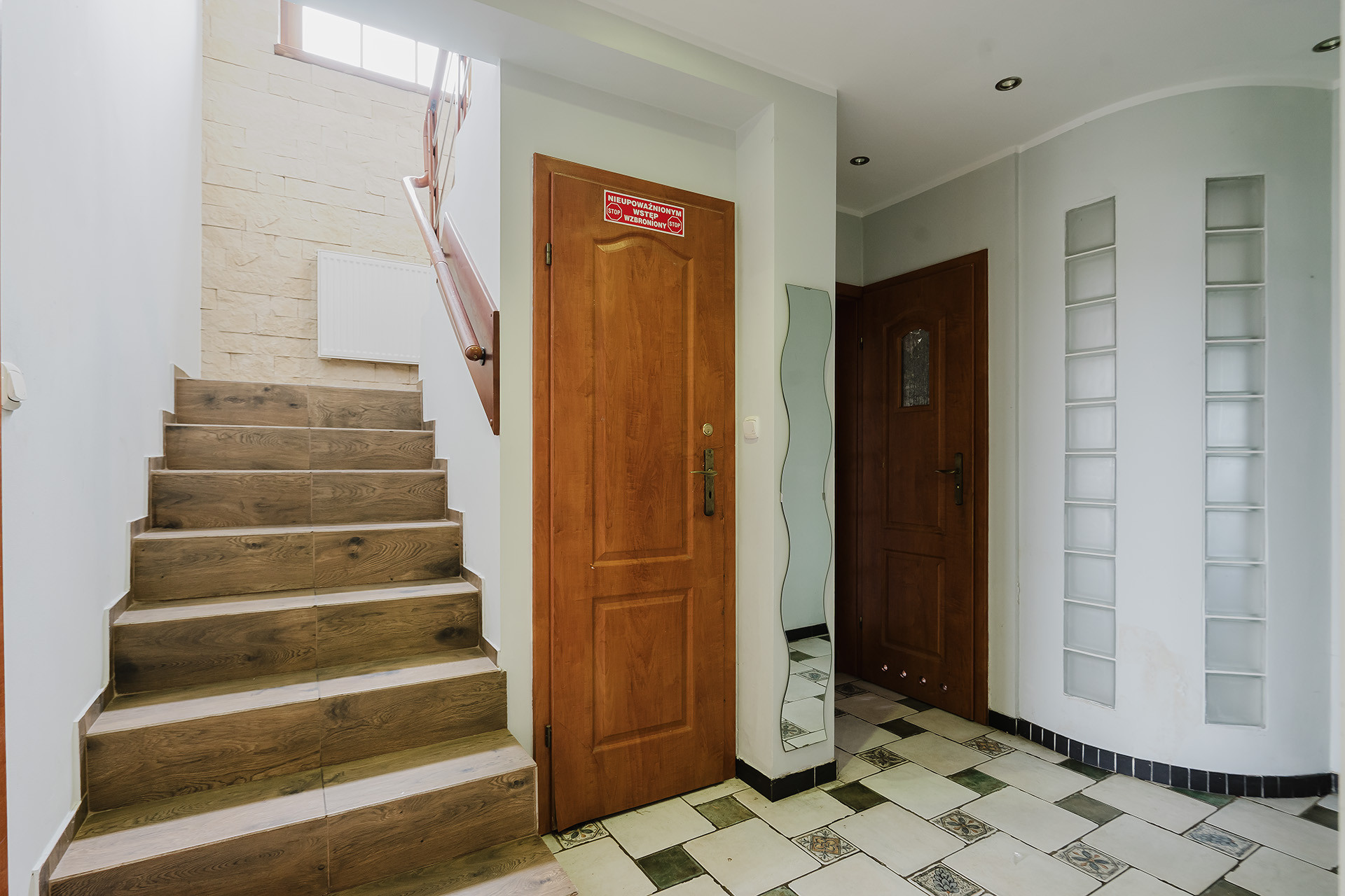 DZIAŁKA: O powierzchni 916 m2 o kształcie nieforemnym, ogrodzona siatką stalową, a od frontu cegłą klinkierową z elementami stalowymi kutymi. Nieruchomość uzbrojona: energia, kanalizacja, wodociąg. Ogród zadbany, z trawą oraz drzewami, krzewami. Taras wokół domu wykafelkowany płytkami. Całość roślinności tworzy uczucie, że jesteśmy w własnej zielonej enklawie blisko miasta. Swobodnie będziemy mogli w nim odpoczywać na co dzień jak również zaprosić rodzinę czy znajomych – miejsca będzie wystarczająco.