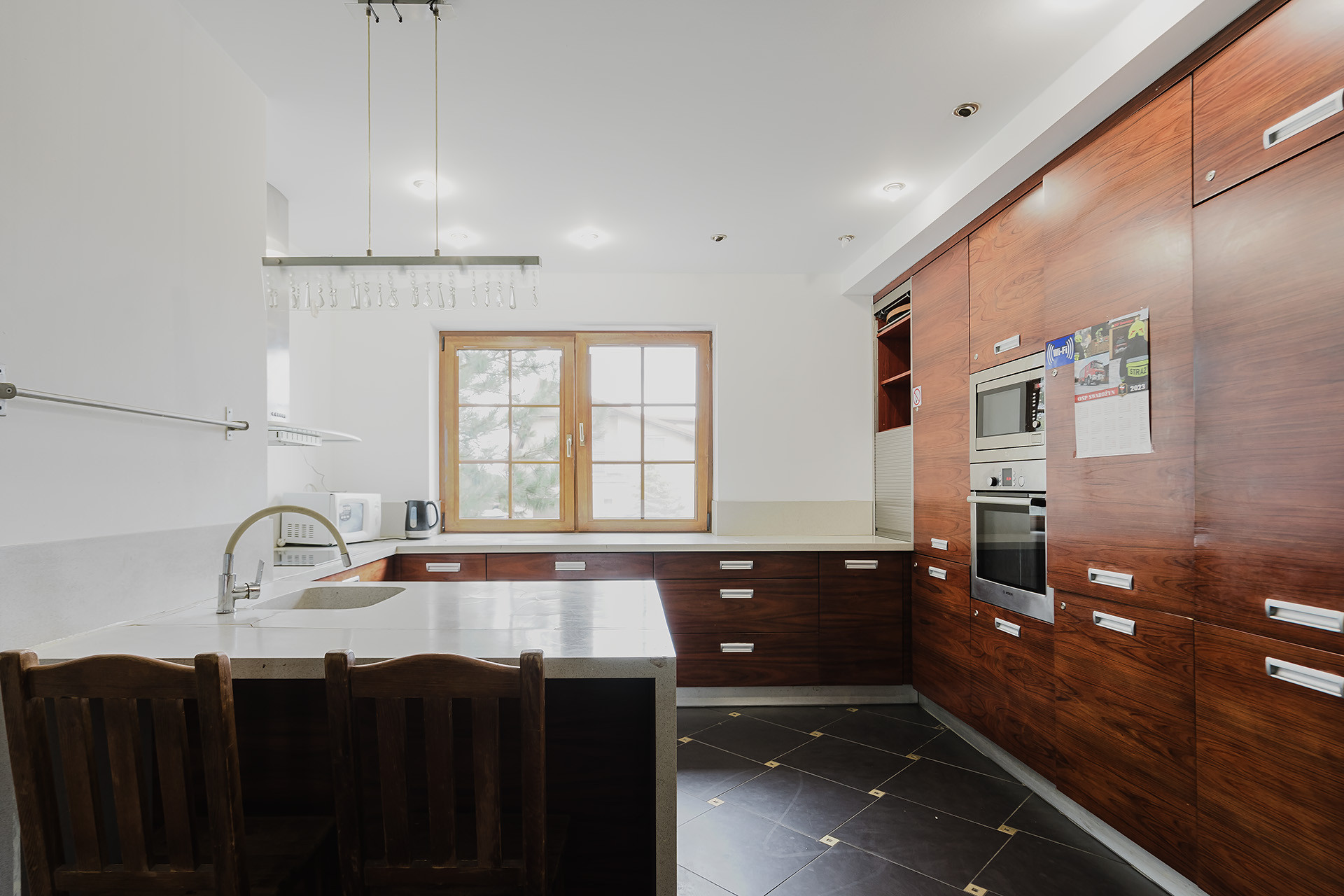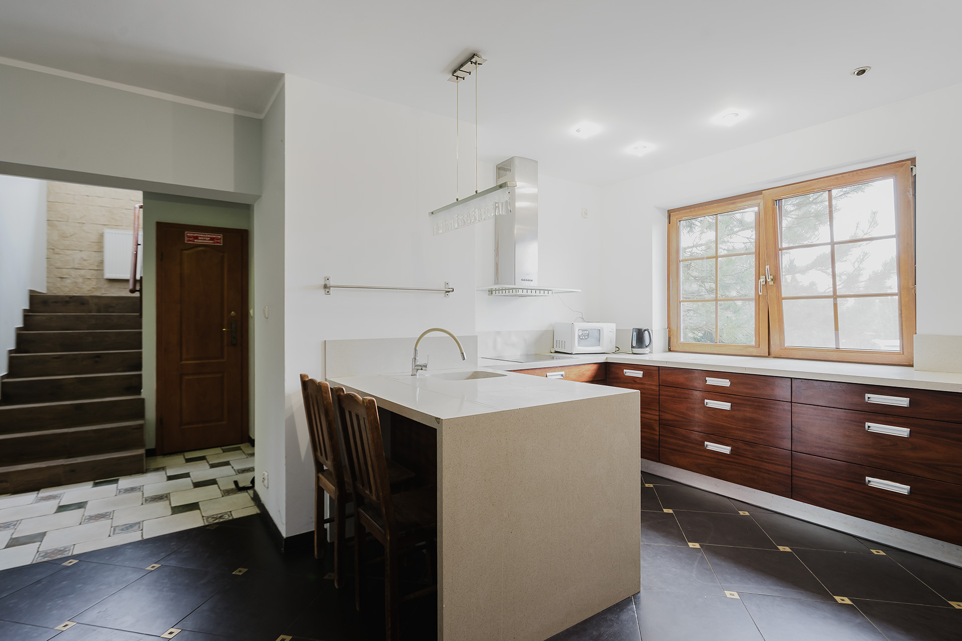 Dom jest ciepły i przytulny, a duże okna doskonale doświetlają wnętrze. Na podłogach panele oraz kafle.