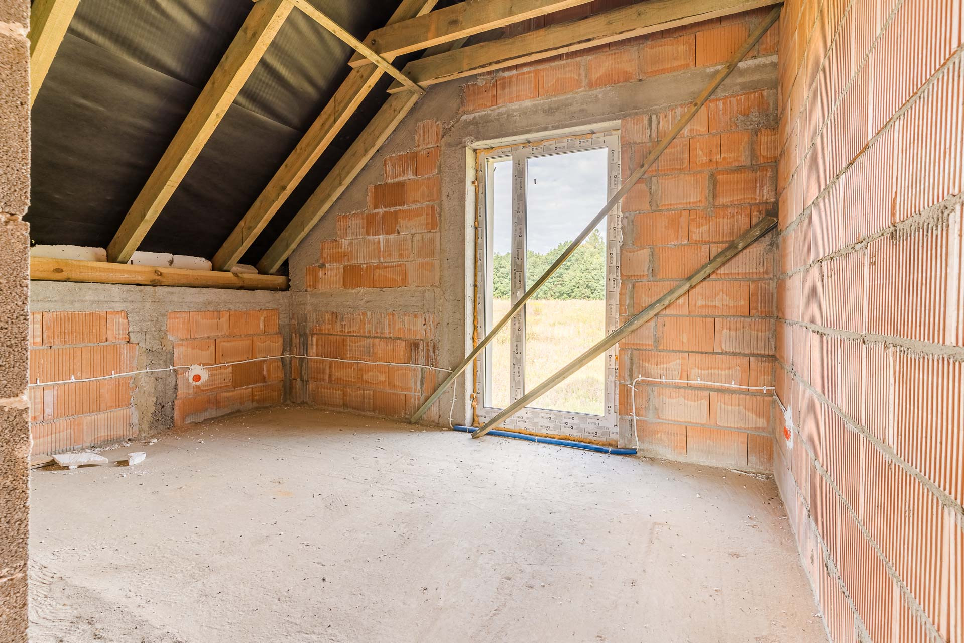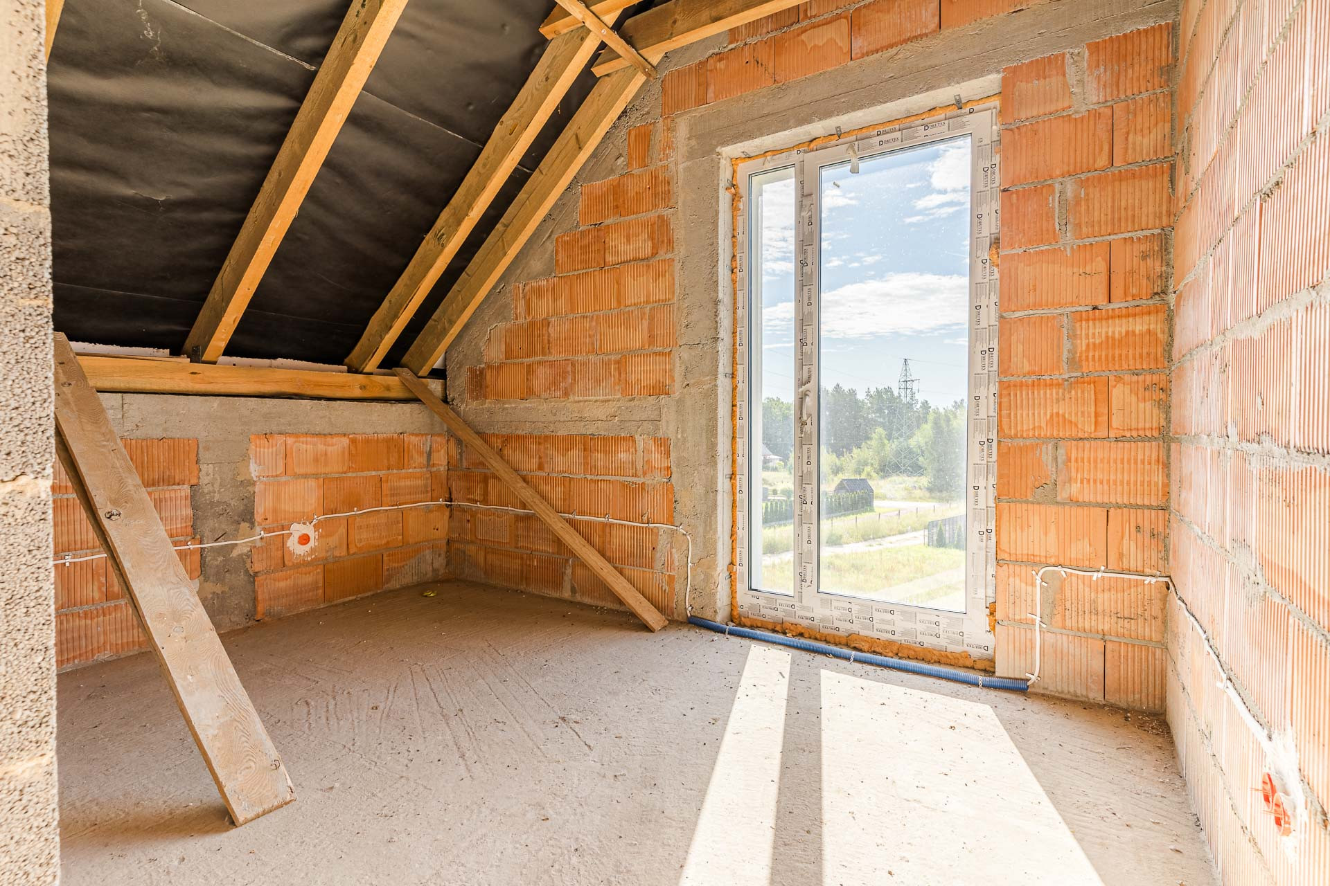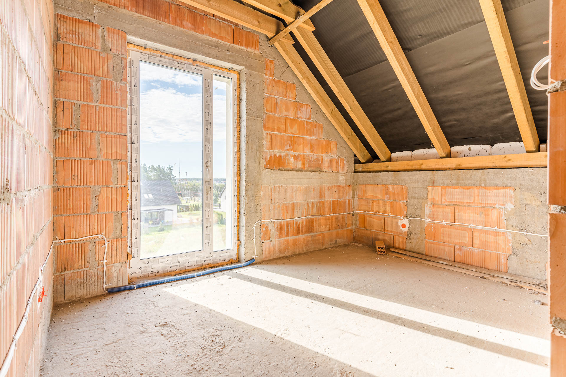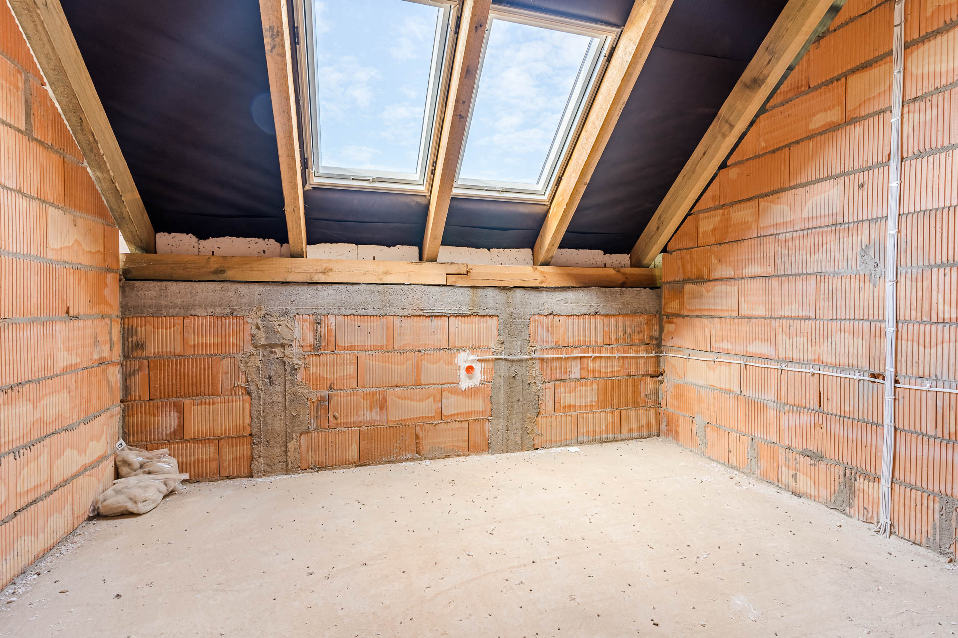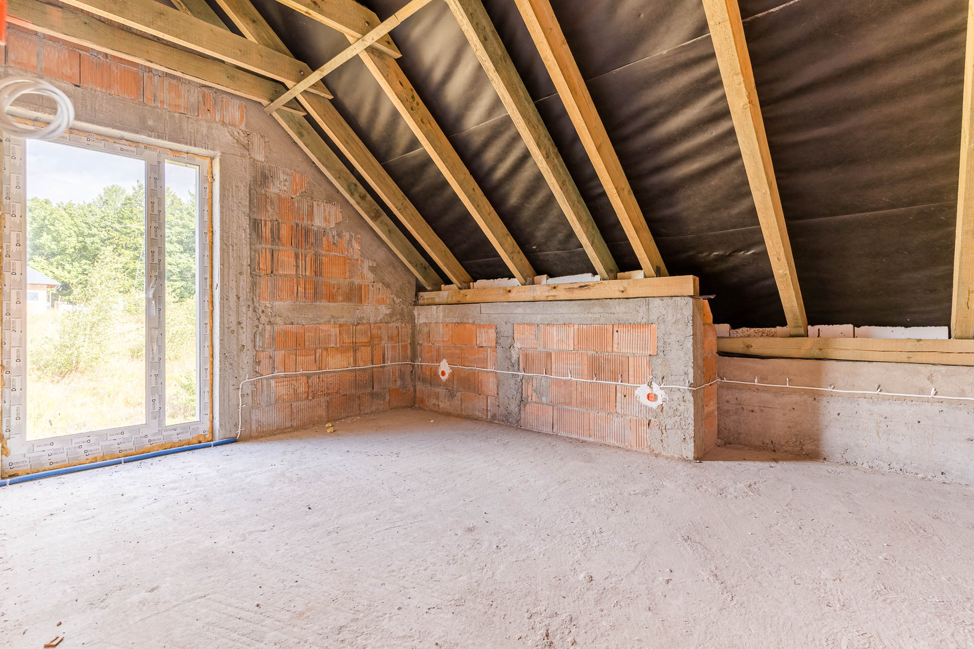 * okna: pionowe PCV, połaciowe w łazience dedykowane do łazienek