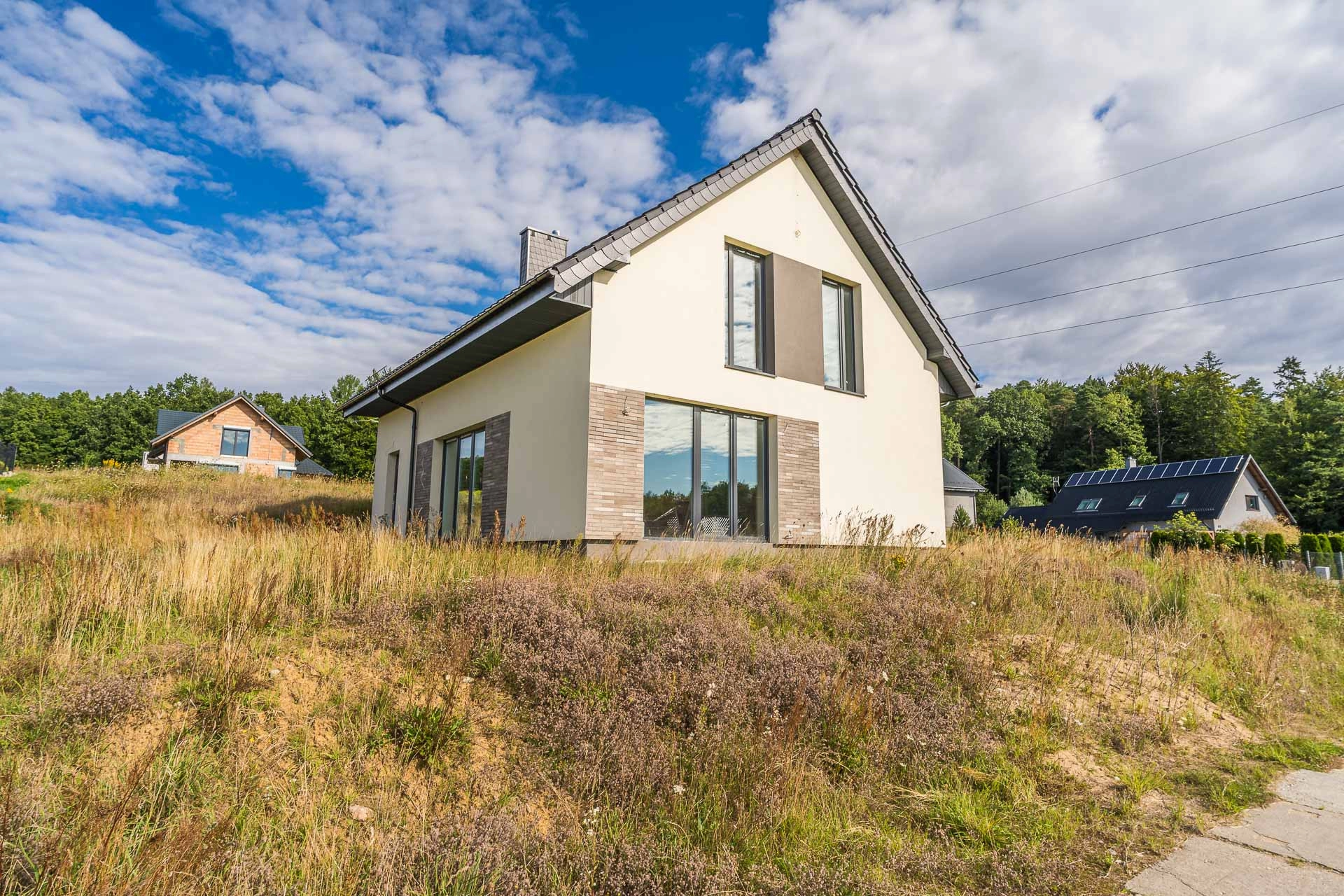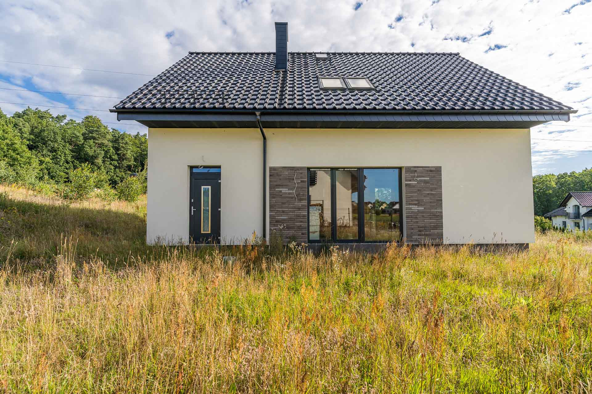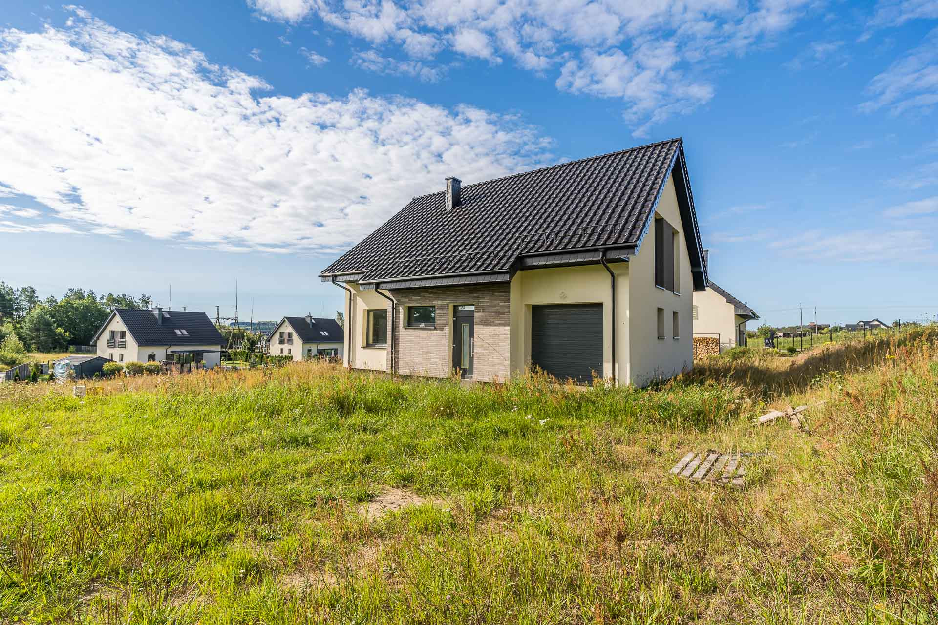 Dom jednorodzinny w zabudowie wolnostojącej o powierzchni całkowitej 143,38 m2 w miejscowości Kiełpino k. Kartuz. Powierzchnia użytkowa domu wynosi 118,78 m2. Dom w stanie surowym zamkniętym, ocieplony styropianem i wykonaną elewacją. Rozprowadzona instalacja elektryczna, alarmowa i monitoringu. Budowa rozpoczęta została w 2019 roku, a ostatni wpis w dzienniku budowy jest z 2024 roku. Powierzchnia działki wynosi 727 m2. Ekspozycja salonu i ogrodu od strony południowo-zachodniej oraz południowo-wschodniej. Wjazd na działkę od strony północno-wschodniej. Garaż jednostanowiskowy w bryle budynku o powierzchni 17,20 m2.