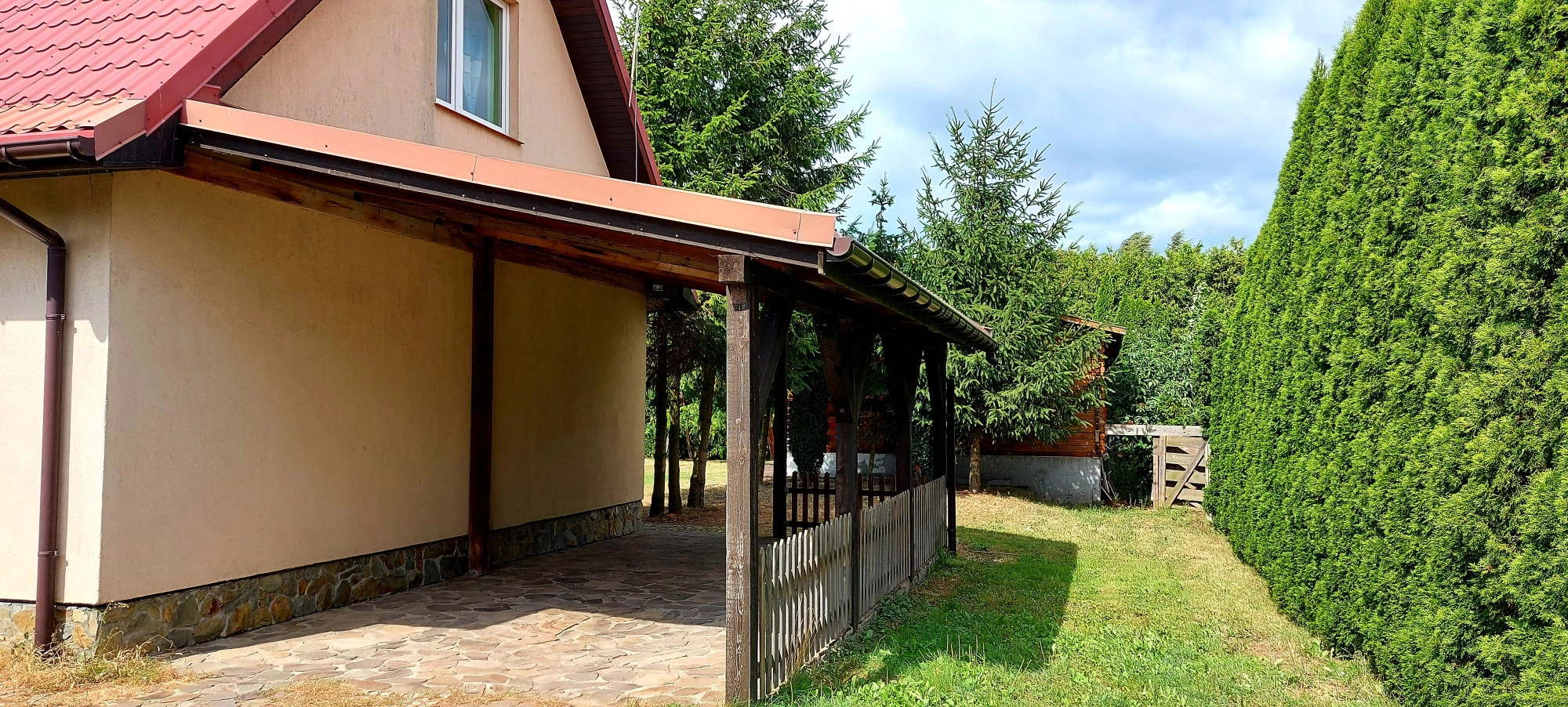 Posesja z każdej ze stron ogrodzona i osłonięta wysokimi tujami.