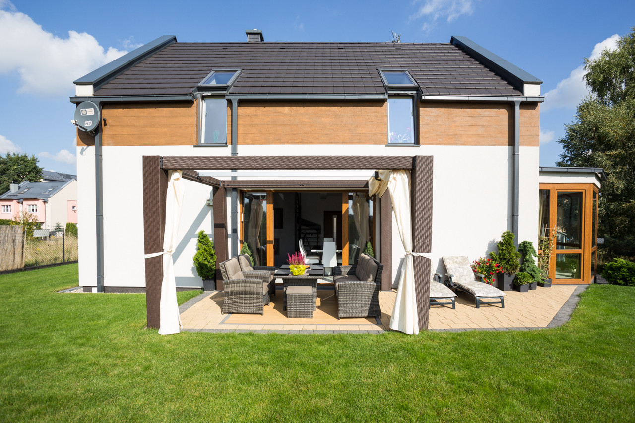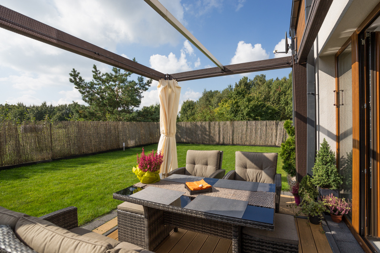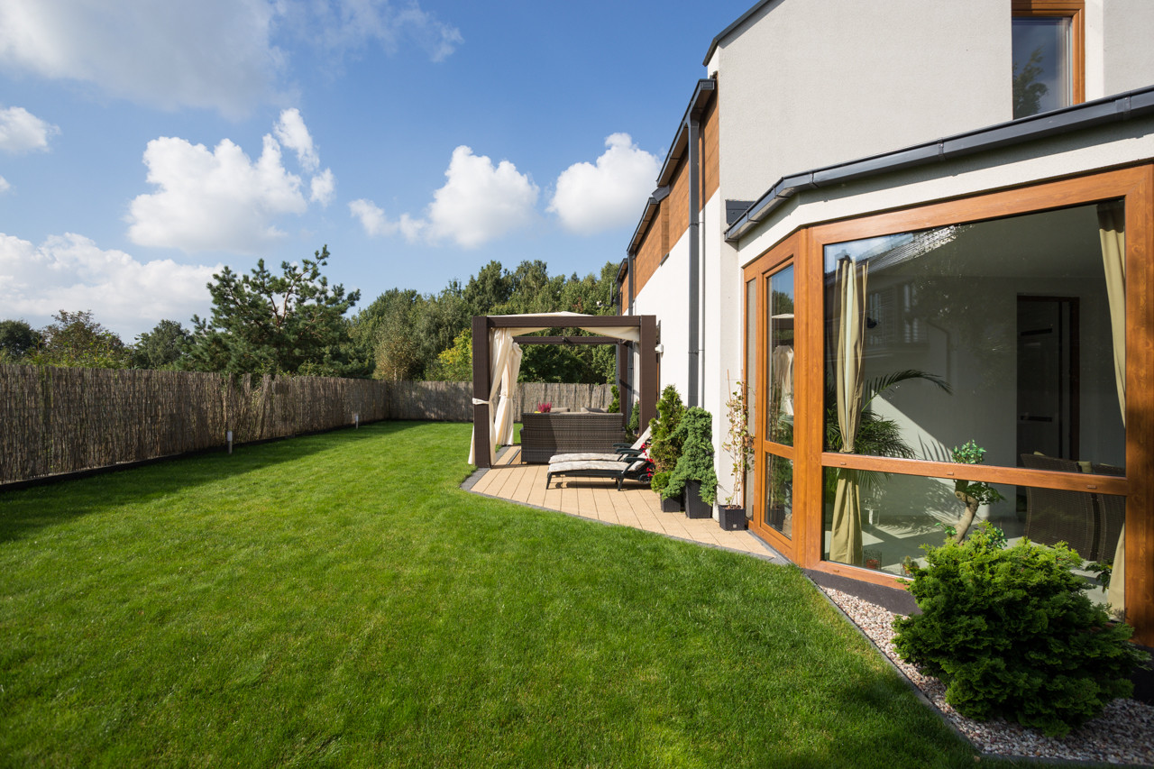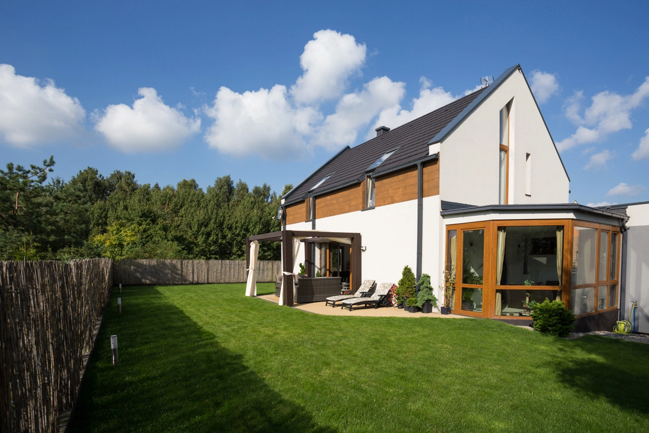 Z salonu mamy bezpośrednie wyjście do ogrodu z ekspozycją południową, który jest wyposażony w system nawadniania trawy firmy Hunter – 3 sekcje po 5 zraszaczy + dodatkowa sekcja dla nawadniania roślin od frontu domu. Wszystkim zarządza sterownik z czujnikiem deszczu. Ogród dzięki regularnemu kształtowi pozwala na sprawne koszenie trawnika a istniejące nasadzenia nie wymagają ciągłej uwagi dzięki zautomatyzowanemu systemowi nawadniania.