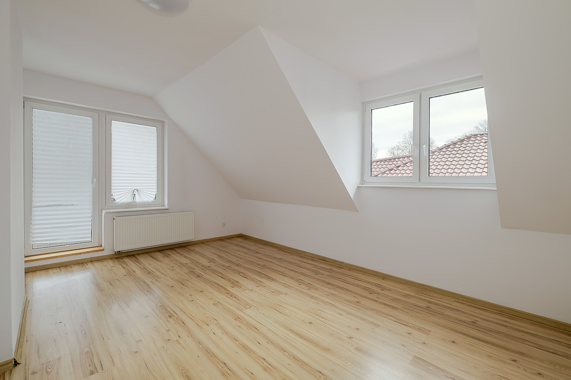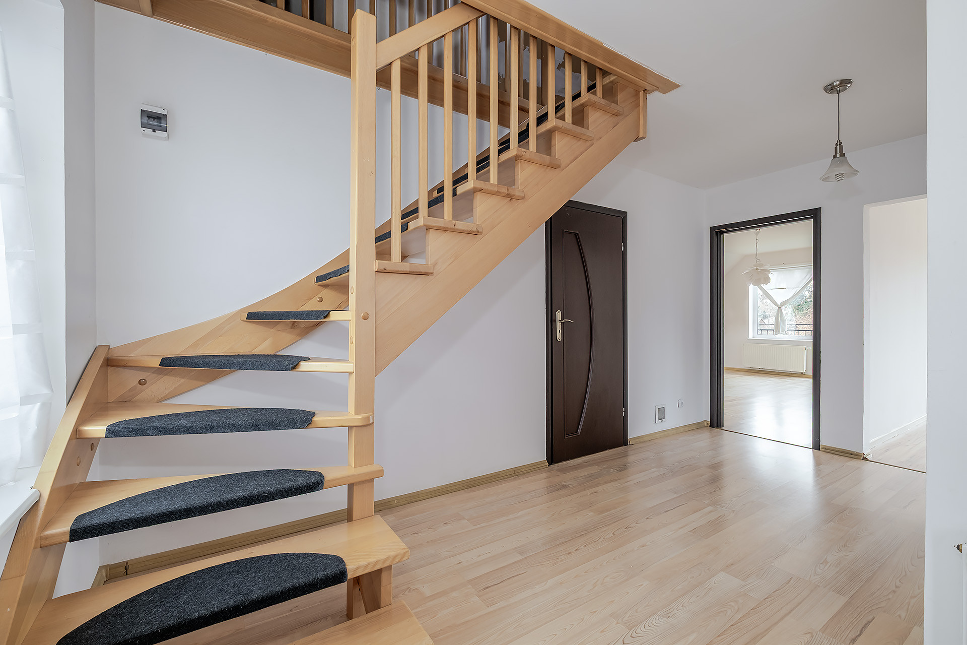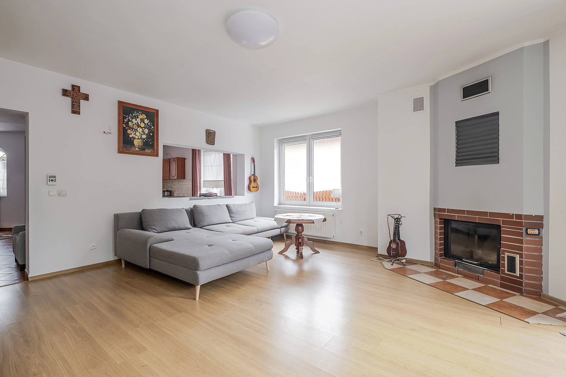 Na parterze znajduje się salon z wyjściem na taras, kuchnia z jadalnią, sypialni oraz łazienka i pralnia. Na piętro prowadzą murowane schody wykończone w drewnie i tam znajdują się 3 sypialnie ( w tym 2 z wyjściem na balkon) oraz łazienka. Niewątpliwym atutem jest również jasny przestronny hol oraz fakt, że w jednym z pokoi jest podłączeni mediów, dzięki czemu możemy zaaranżować tam aneks kuchenny. Dodatkowo na poddaszy zagospodarowany jest kolejny pokój.