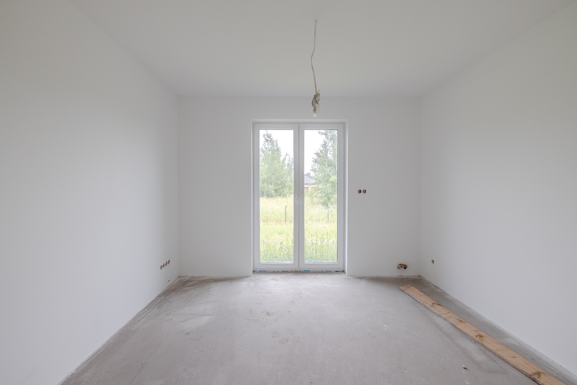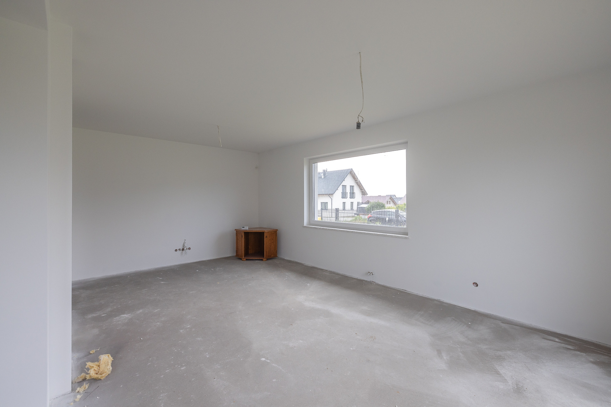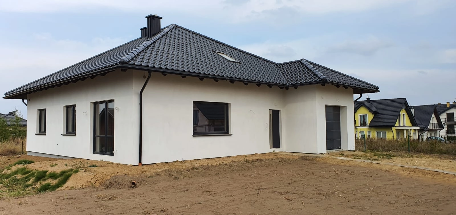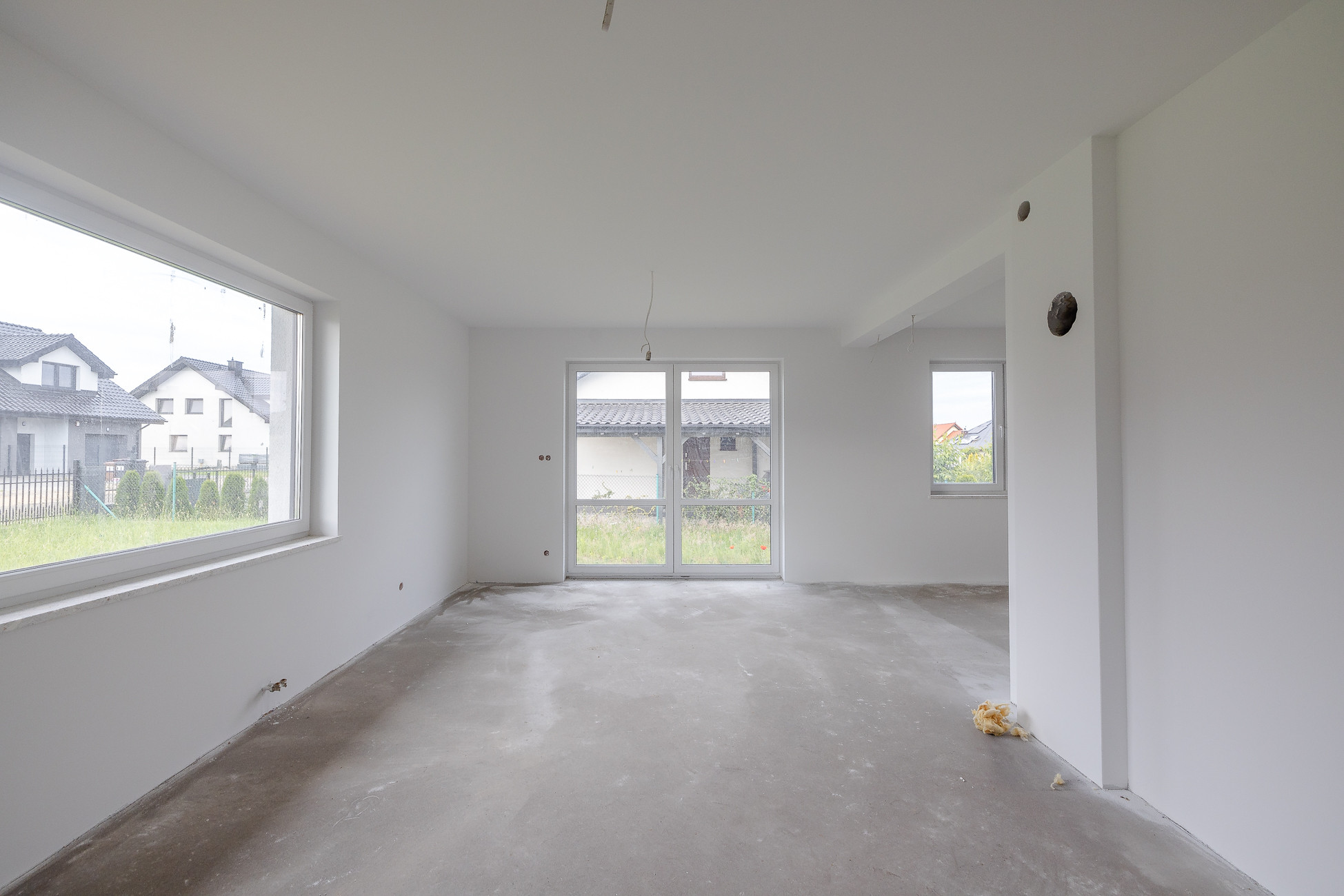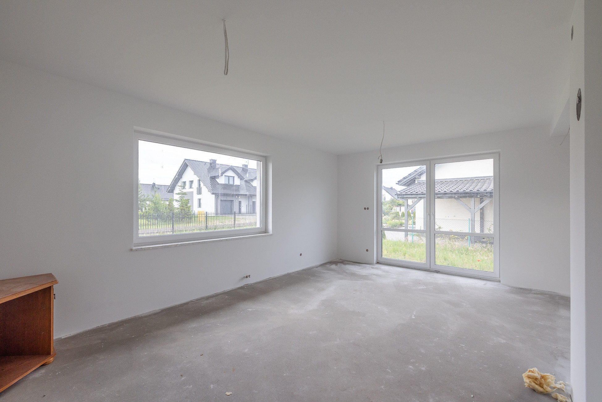Dom wolnostojący o pow. 225m2 z garażem w bryle budynku oraz dużym strychem który może służyć jako 5 pokój. Dom w stanie deweloperskim zamkniętym z wygładzonymi ścianami pomalowanymi na biało. Działka 939m2