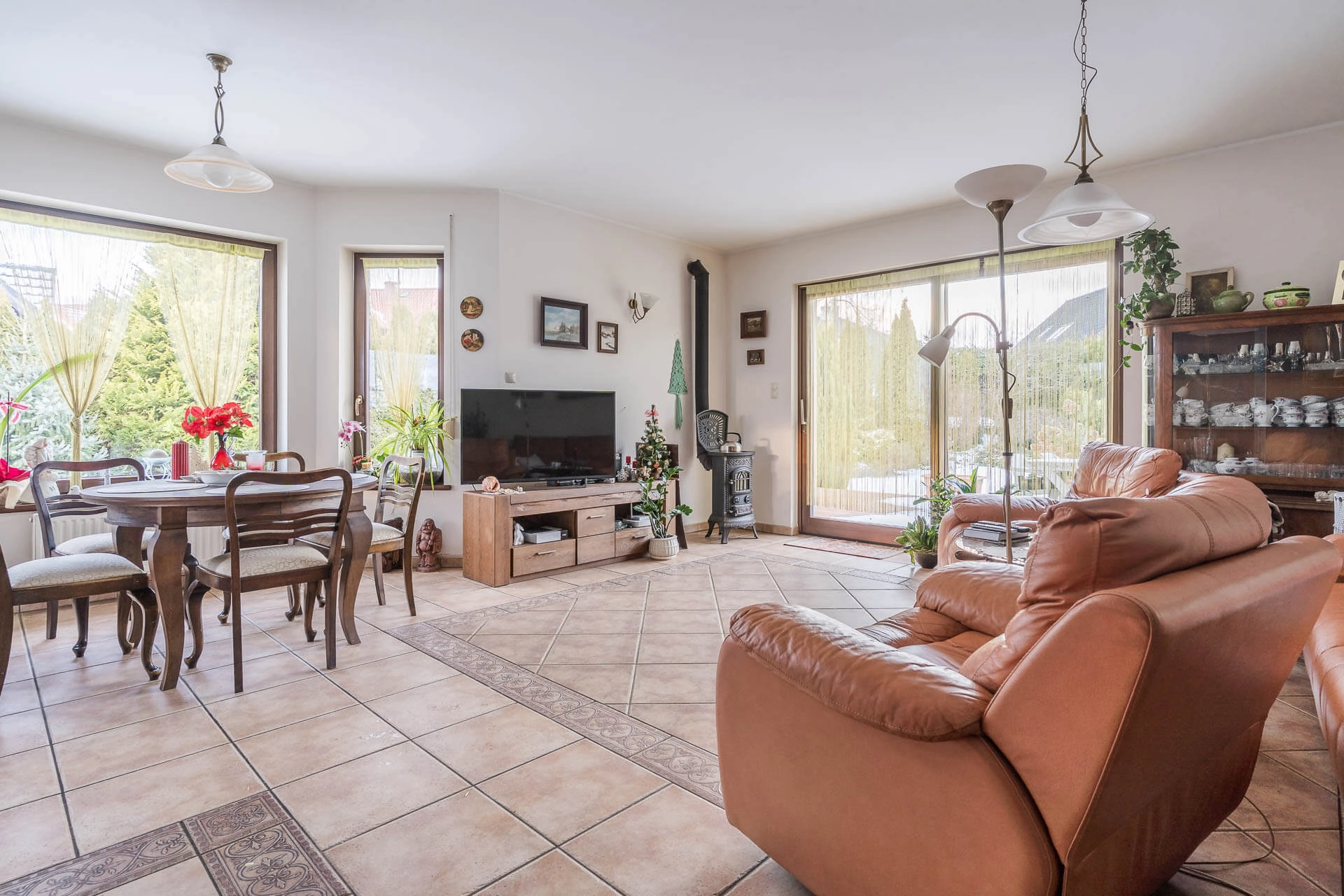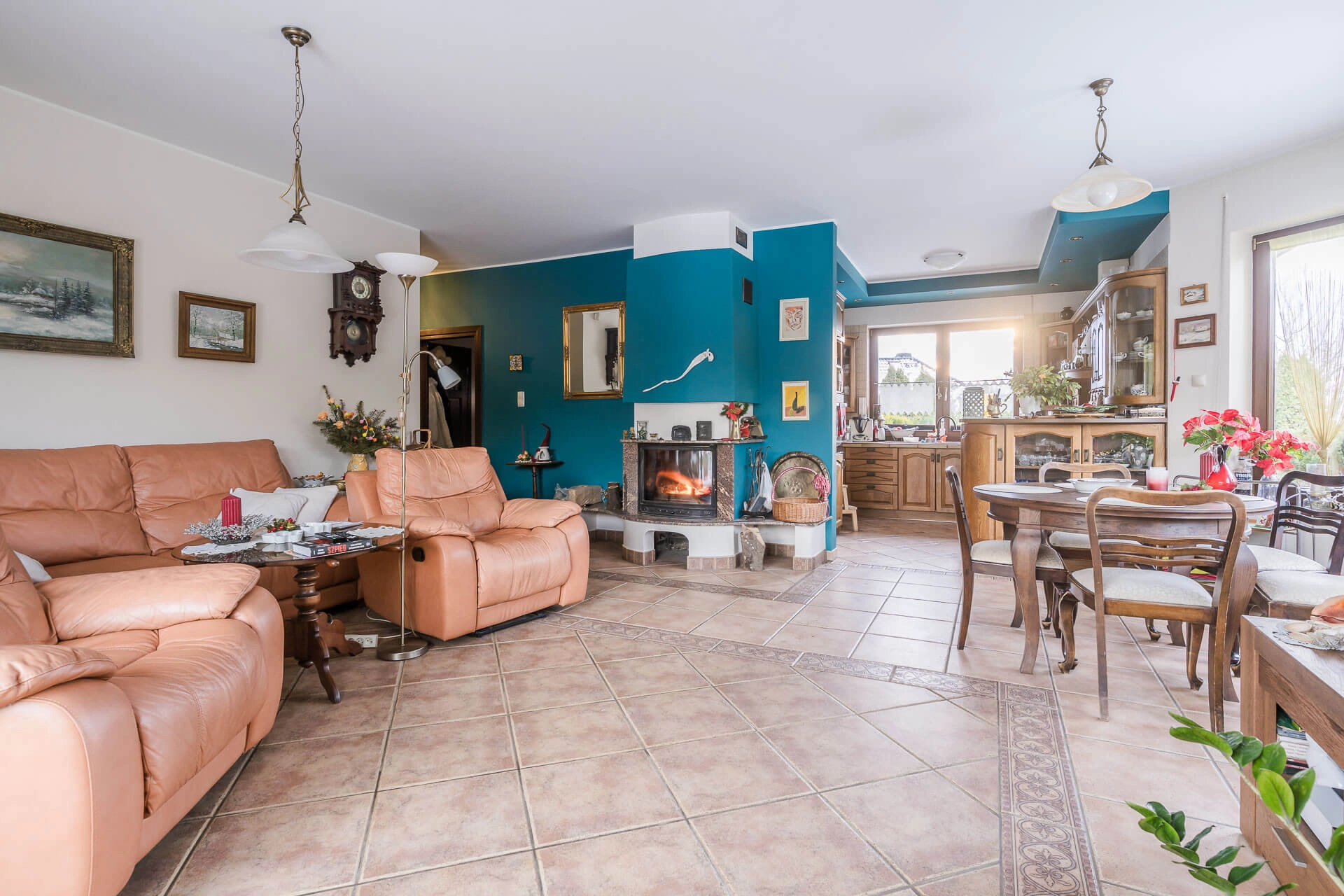 przestronny, słoneczny salon z kominkiem,
