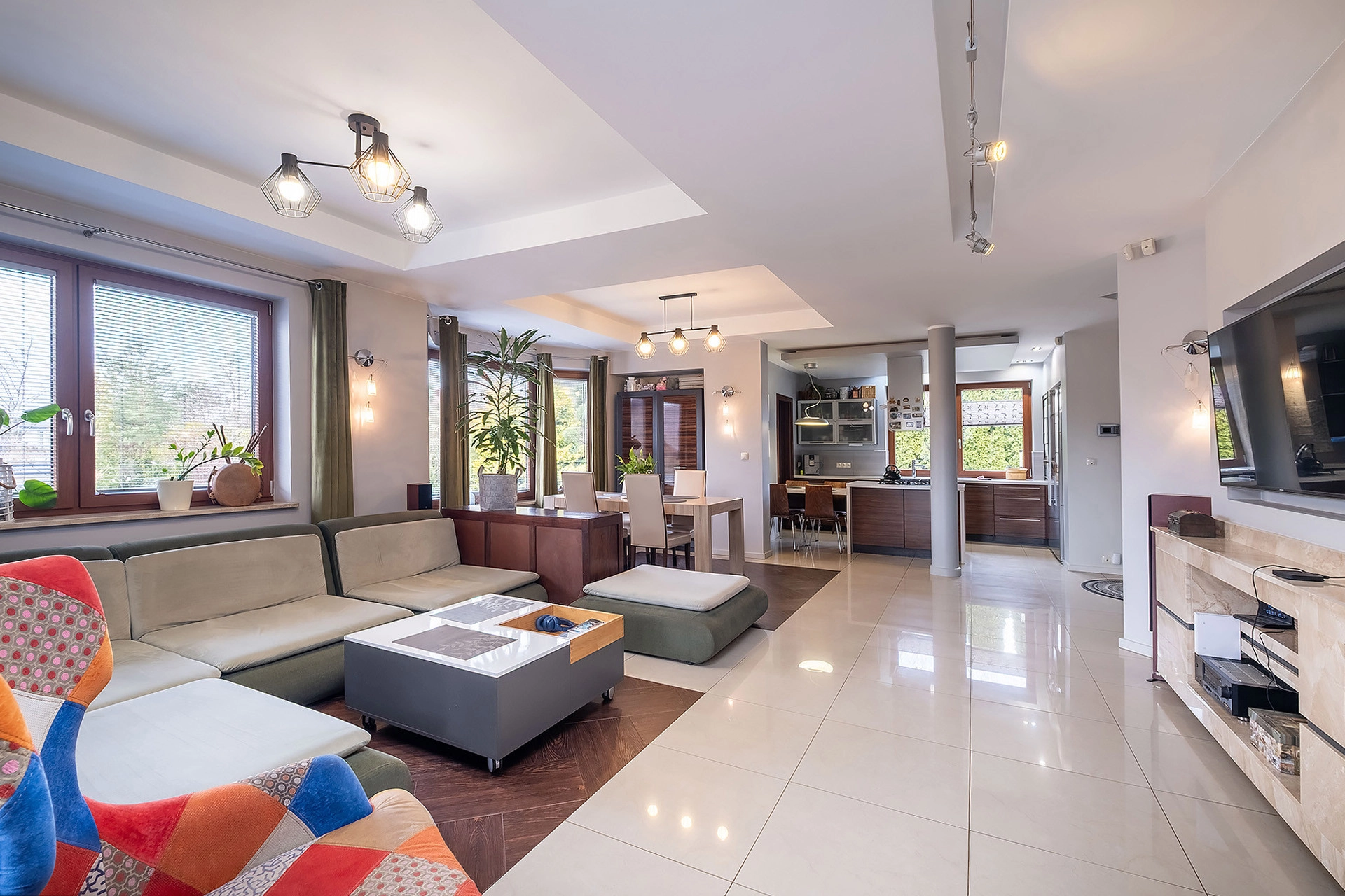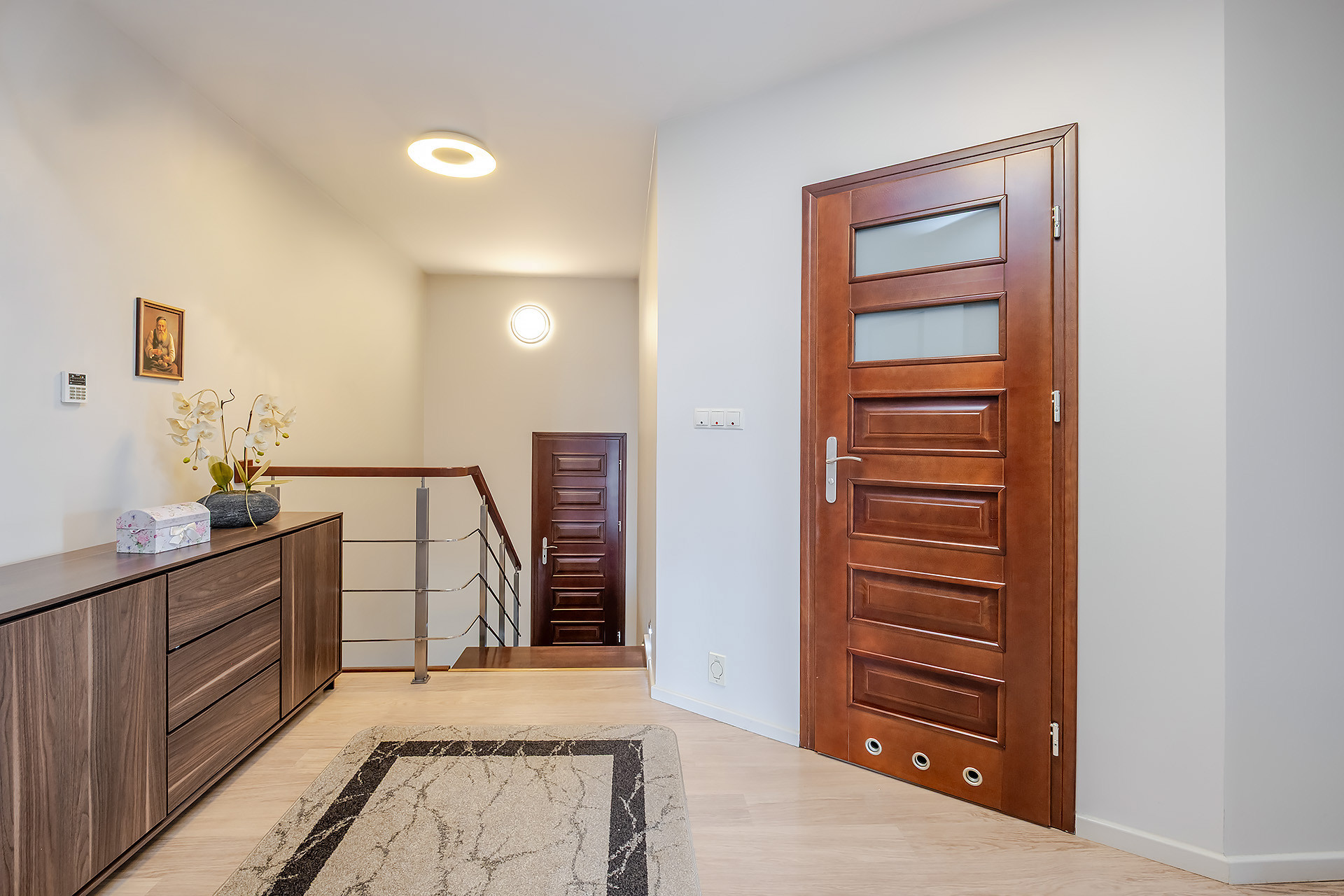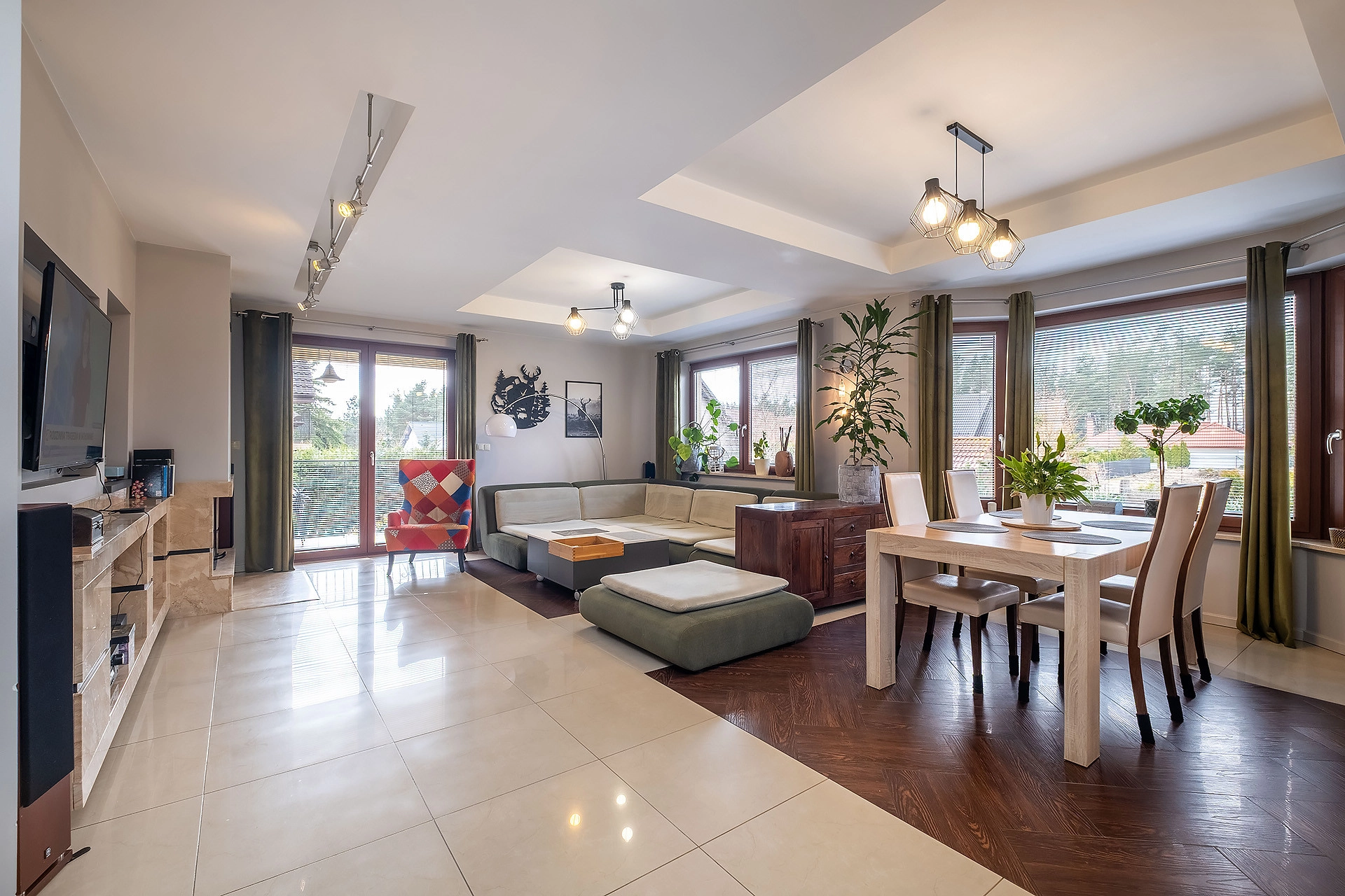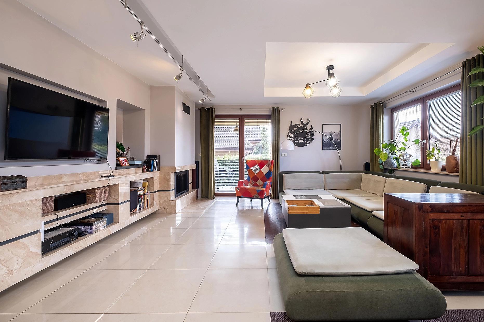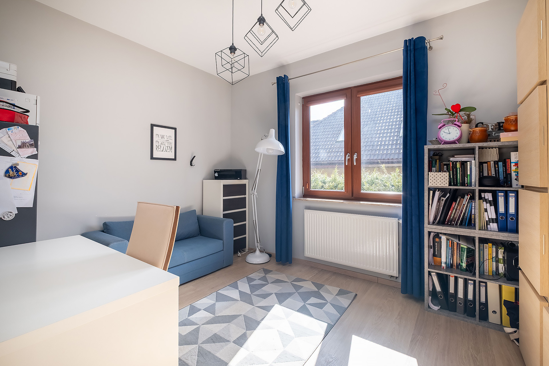 Na parterze znajduje się przestronny salon z jadalnią oraz otwartą kuchnią oraz spiżarnią ( ok. 56 m2), pokój gościnny / gabinet ( ok. 11 m2) łazienka, kotłownia oraz przedpokój. Dodatkowym atutem jest przestronny wiatrołap z dużą zabudową oraz bezpośrednim przejściem do dwustanowiskowego garażu. Brama wjazdowa na posesję oraz do garażu otwierana elektrycznie.