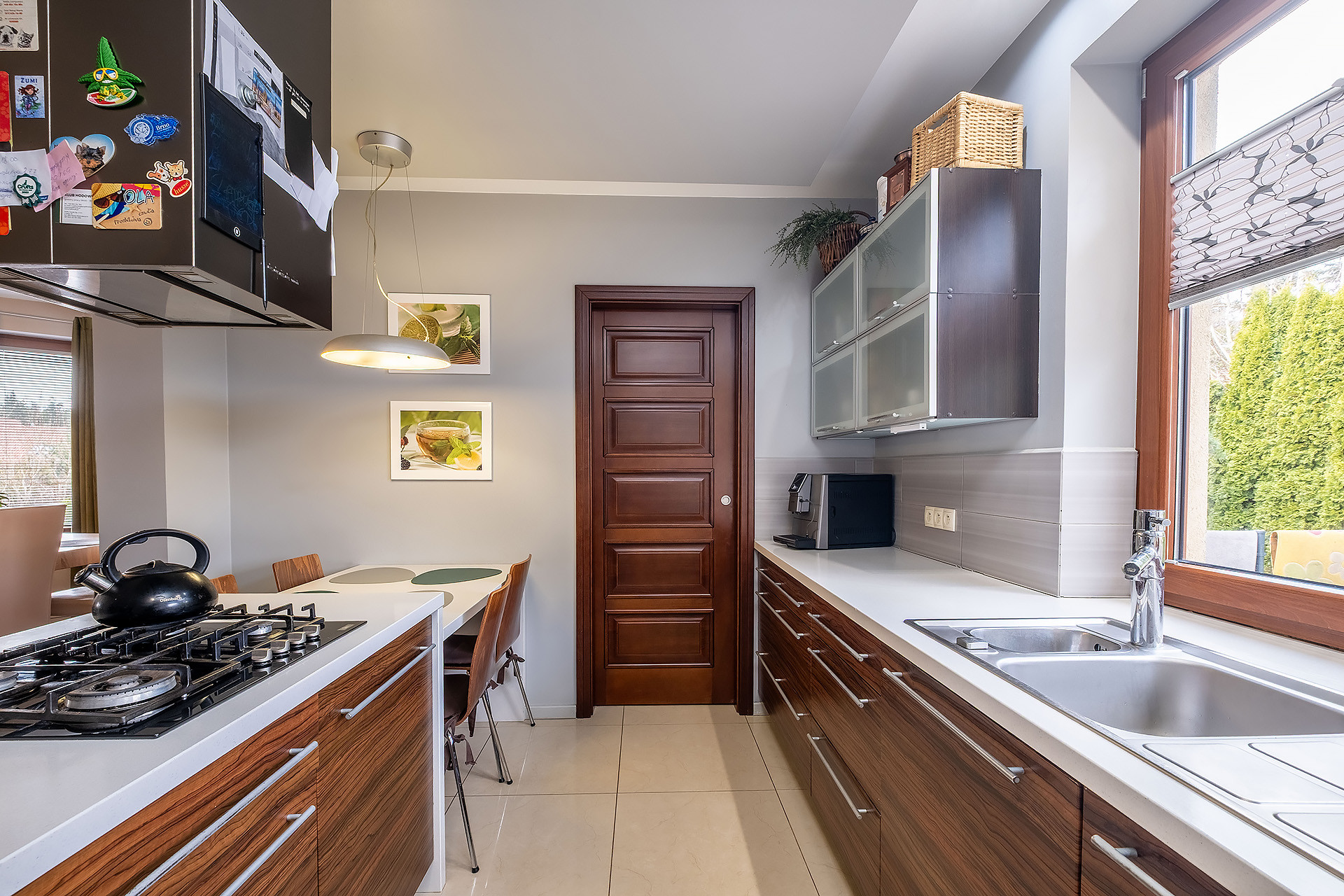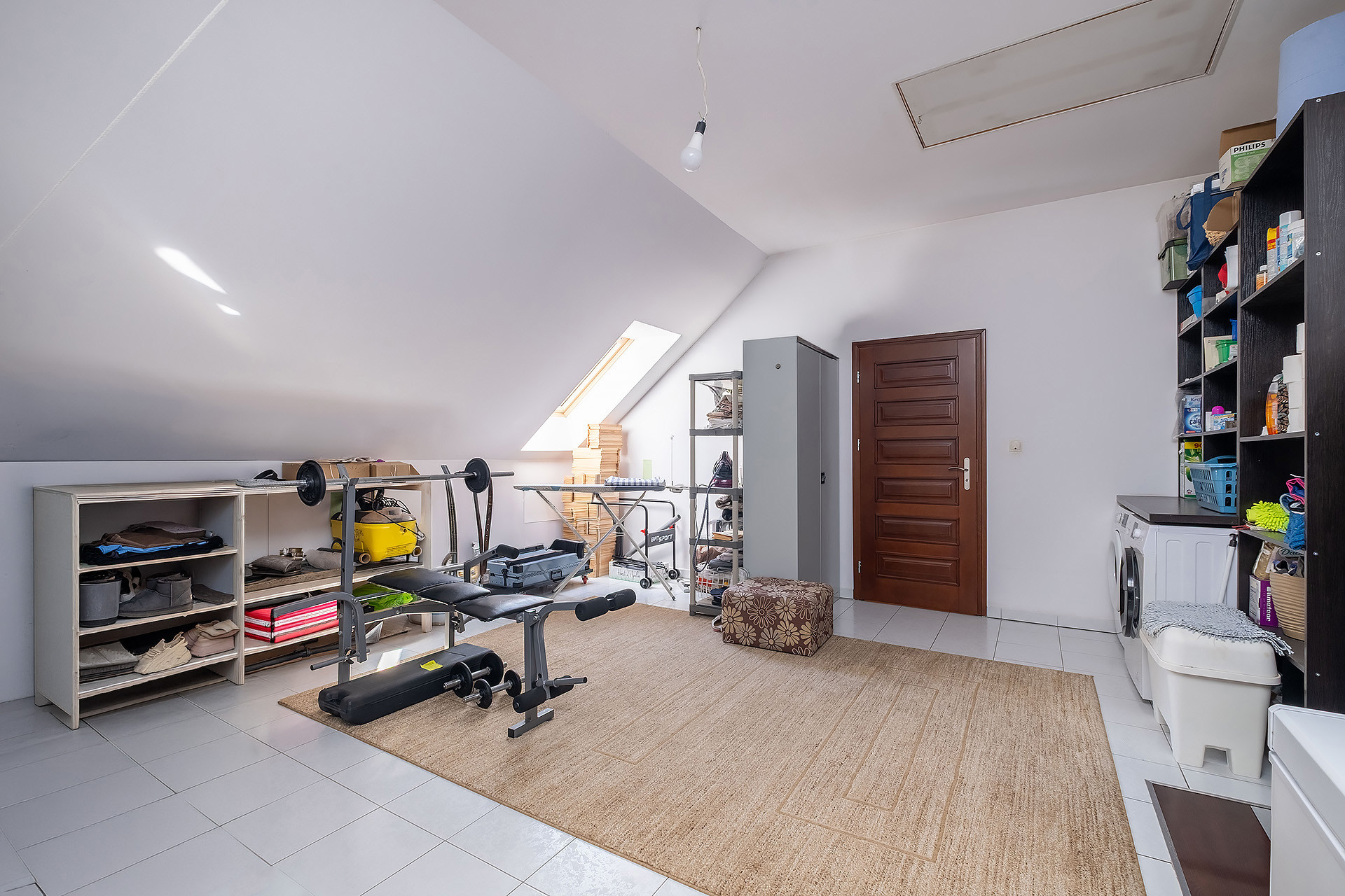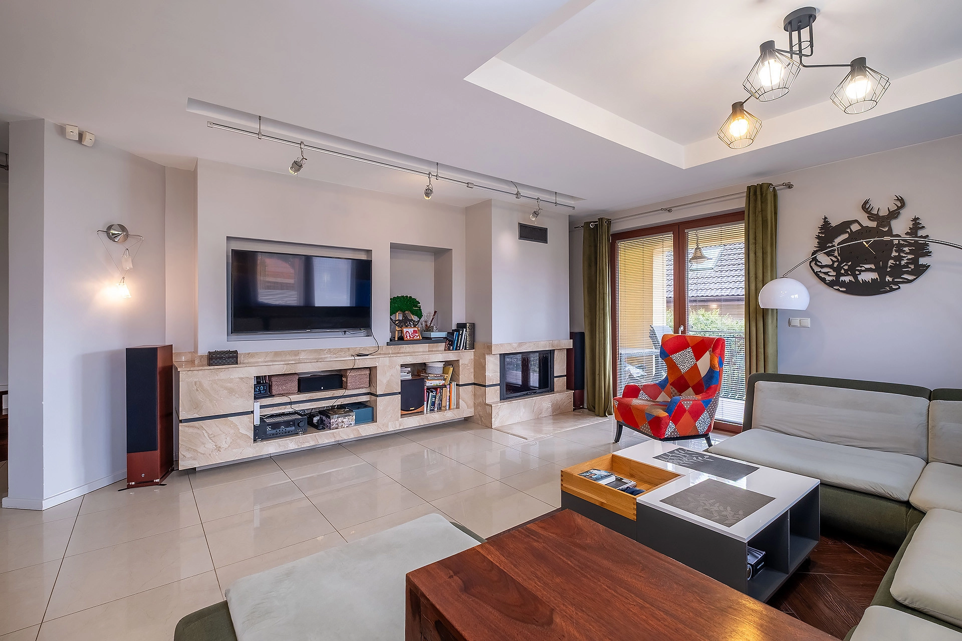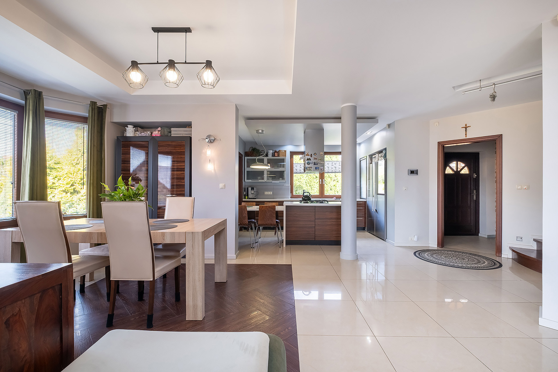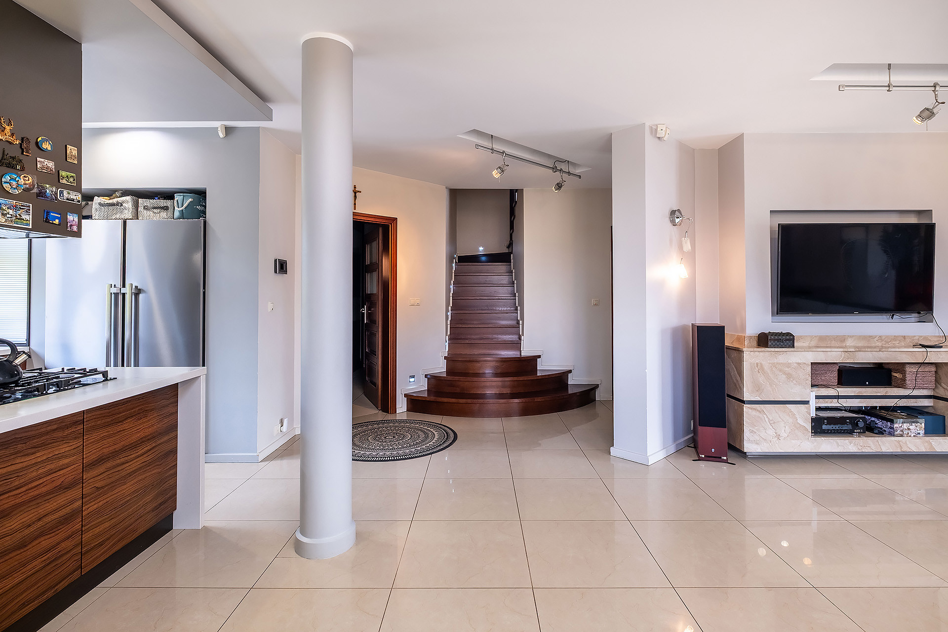 Na parterze znajduje się przestronny salon z jadalnią oraz otwartą kuchnią oraz spiżarnią ( ok. 56 m2), pokój gościnny / gabinet ( ok. 11 m2) łazienka, kotłownia oraz przedpokój. Dodatkowym atutem jest przestronny wiatrołap z dużą zabudową oraz bezpośrednim przejściem do dwustanowiskowego garażu. Brama wjazdowa na posesję oraz do garażu otwierana elektrycznie.