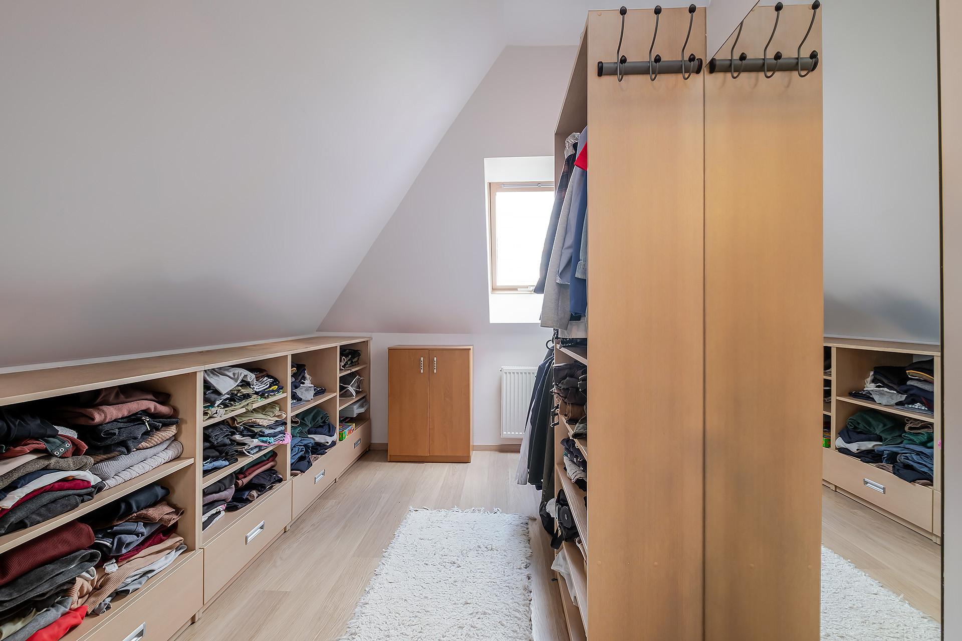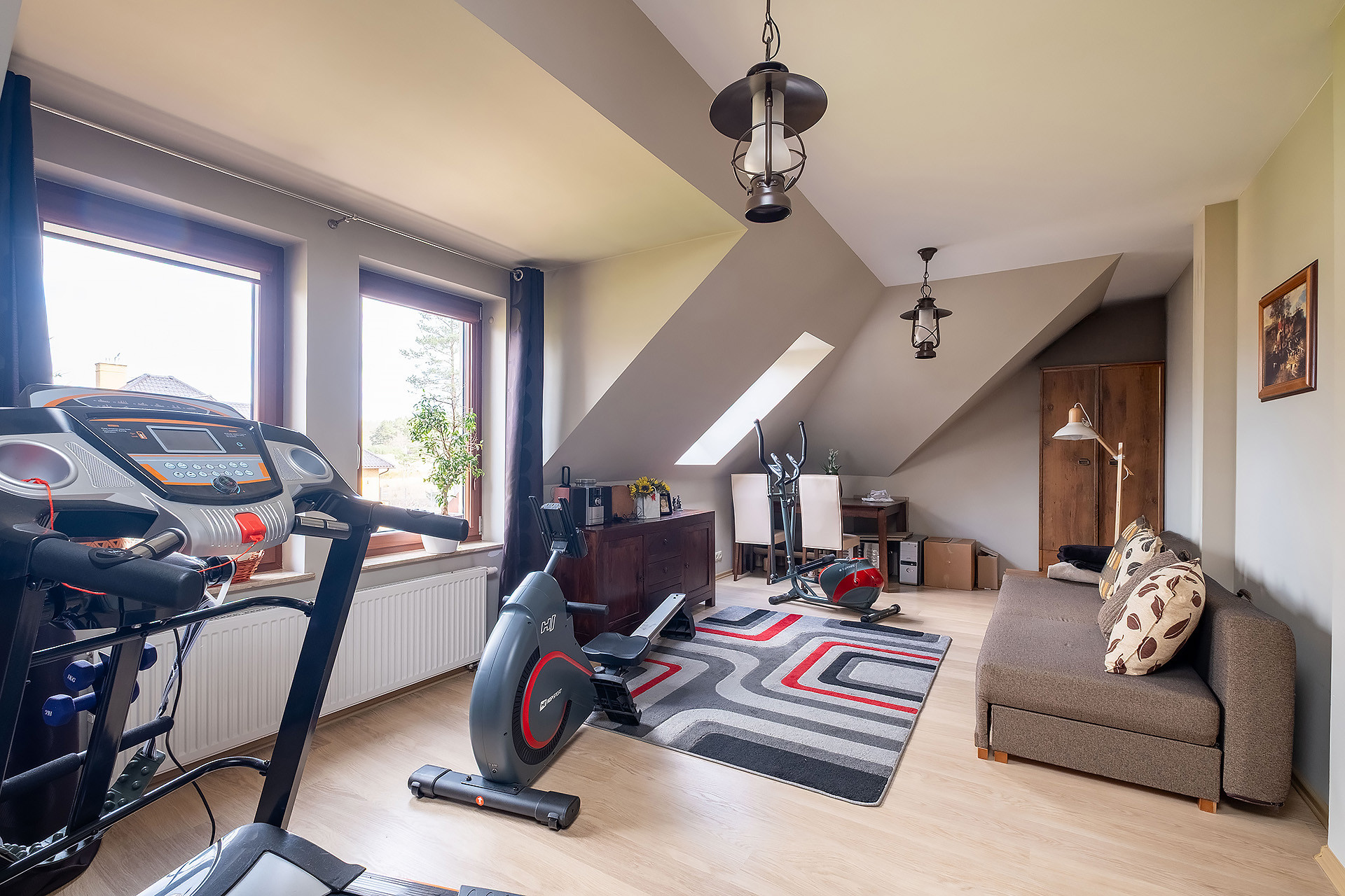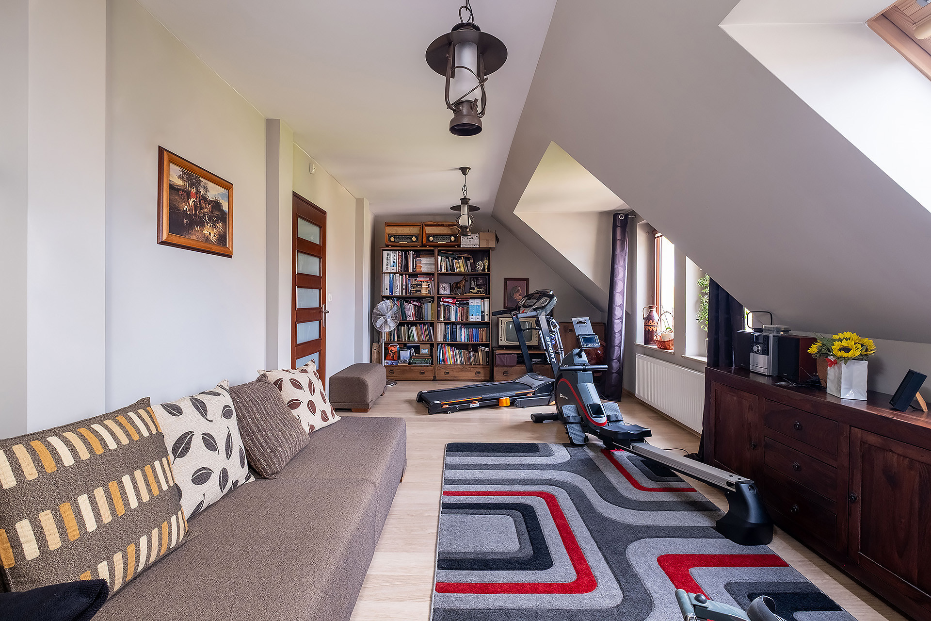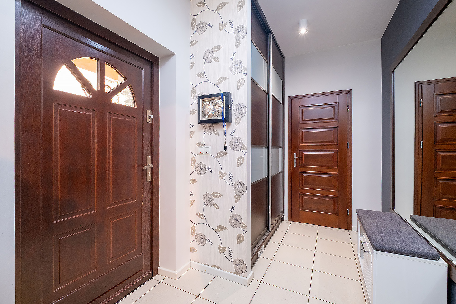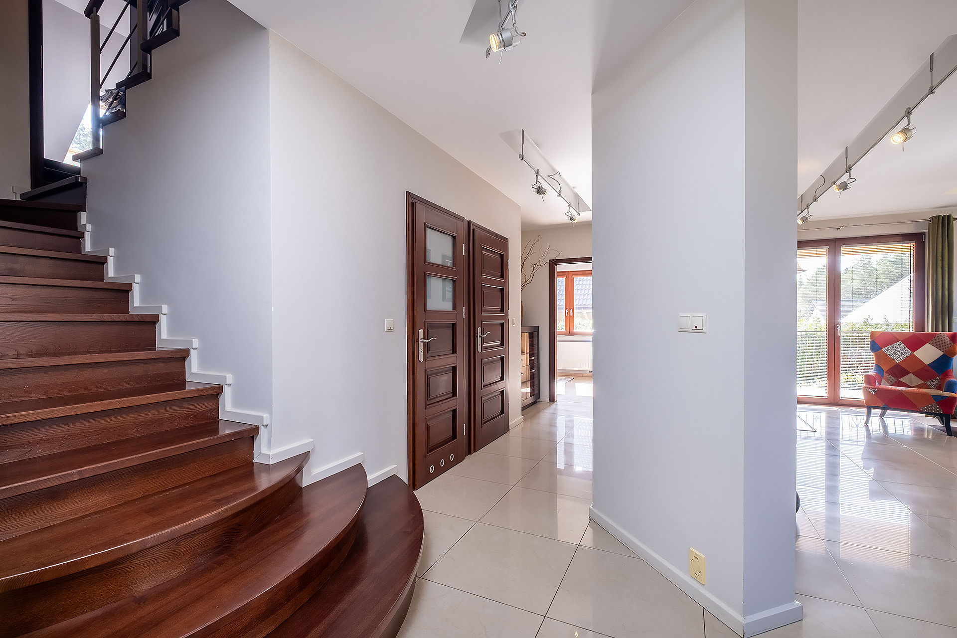 Na piętro prowadzą wygodne schody wykończone w drewnie. Na półpiętrze została zaaranżowana pralnio – suszarnia, która śmiało może pełnić funkcję pokoju z garderobą. Na piętrze znajdują się 3 sypialnie ( w tym 2 z garderobą) oraz pokój kąpielowy z wanną oraz prysznicem.
