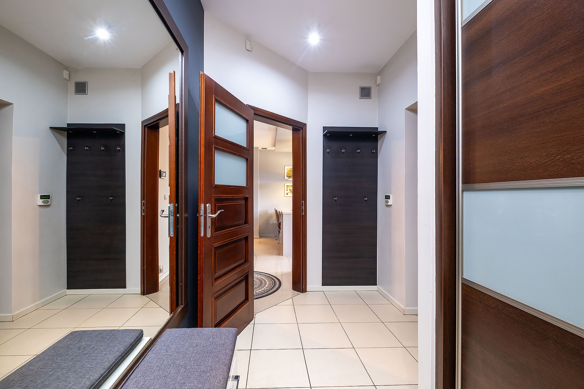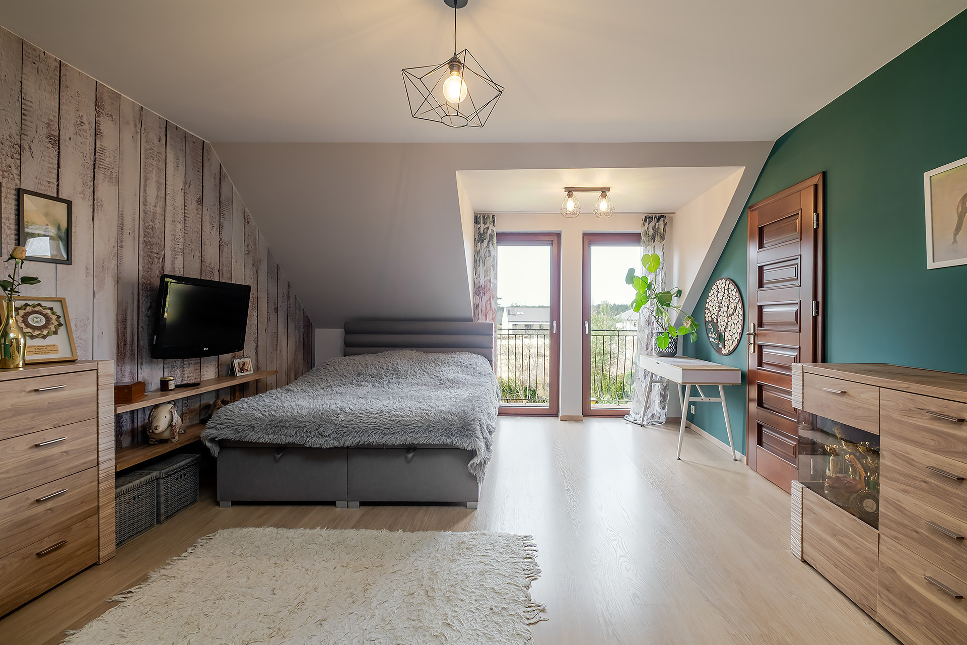 Z sypialni wyjście na balkony. Stolarka wewnętrzna drewniania.