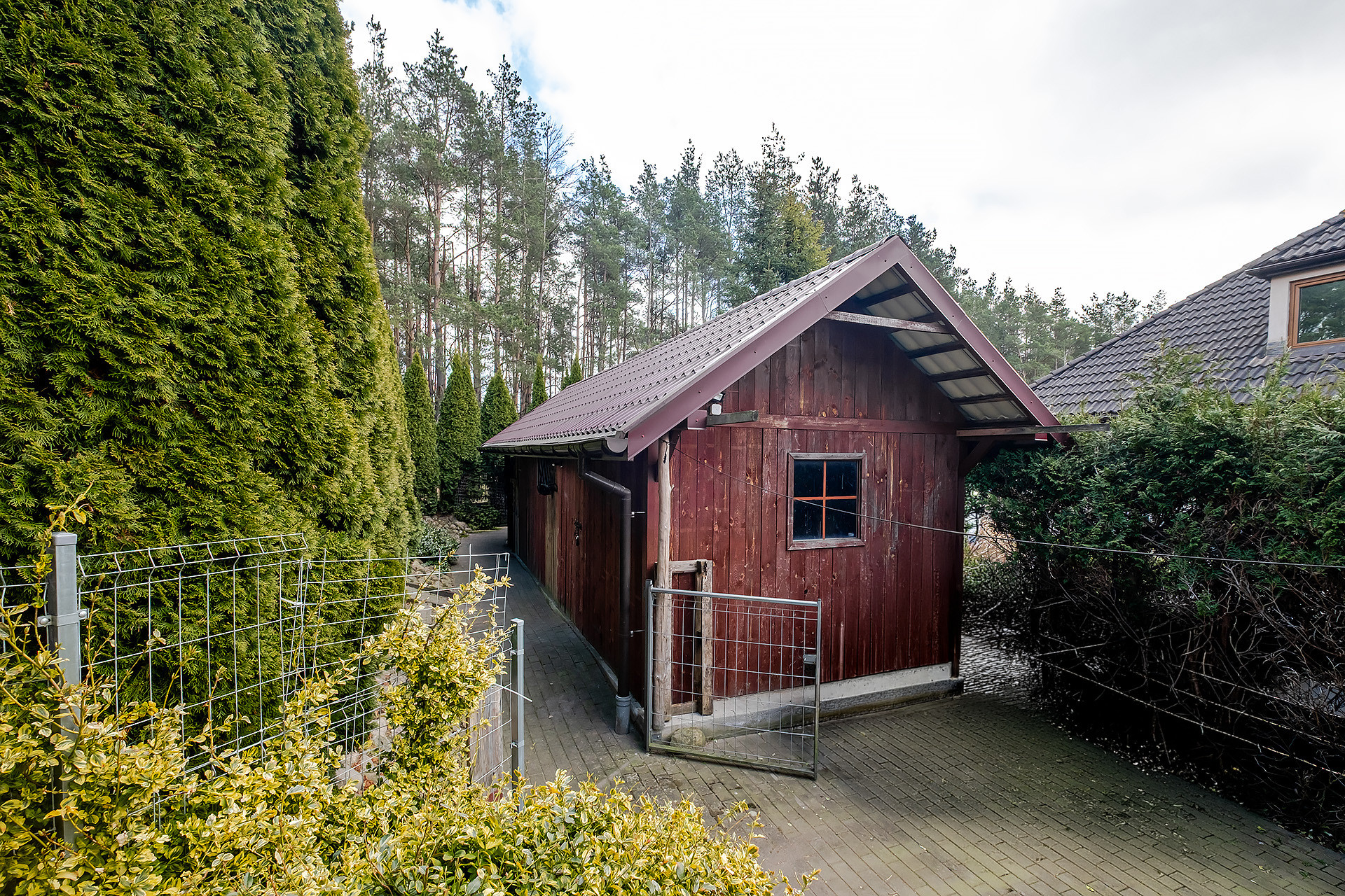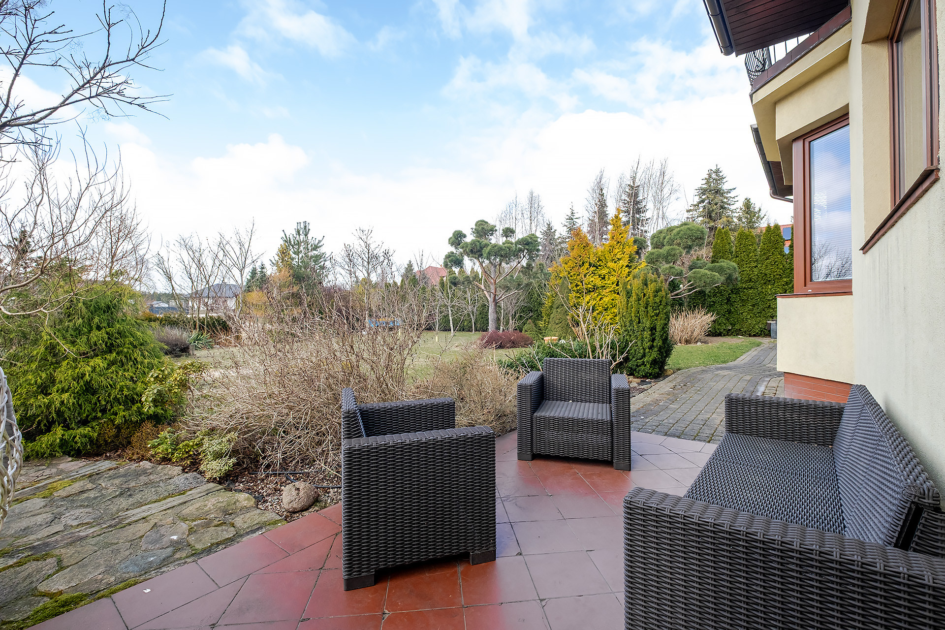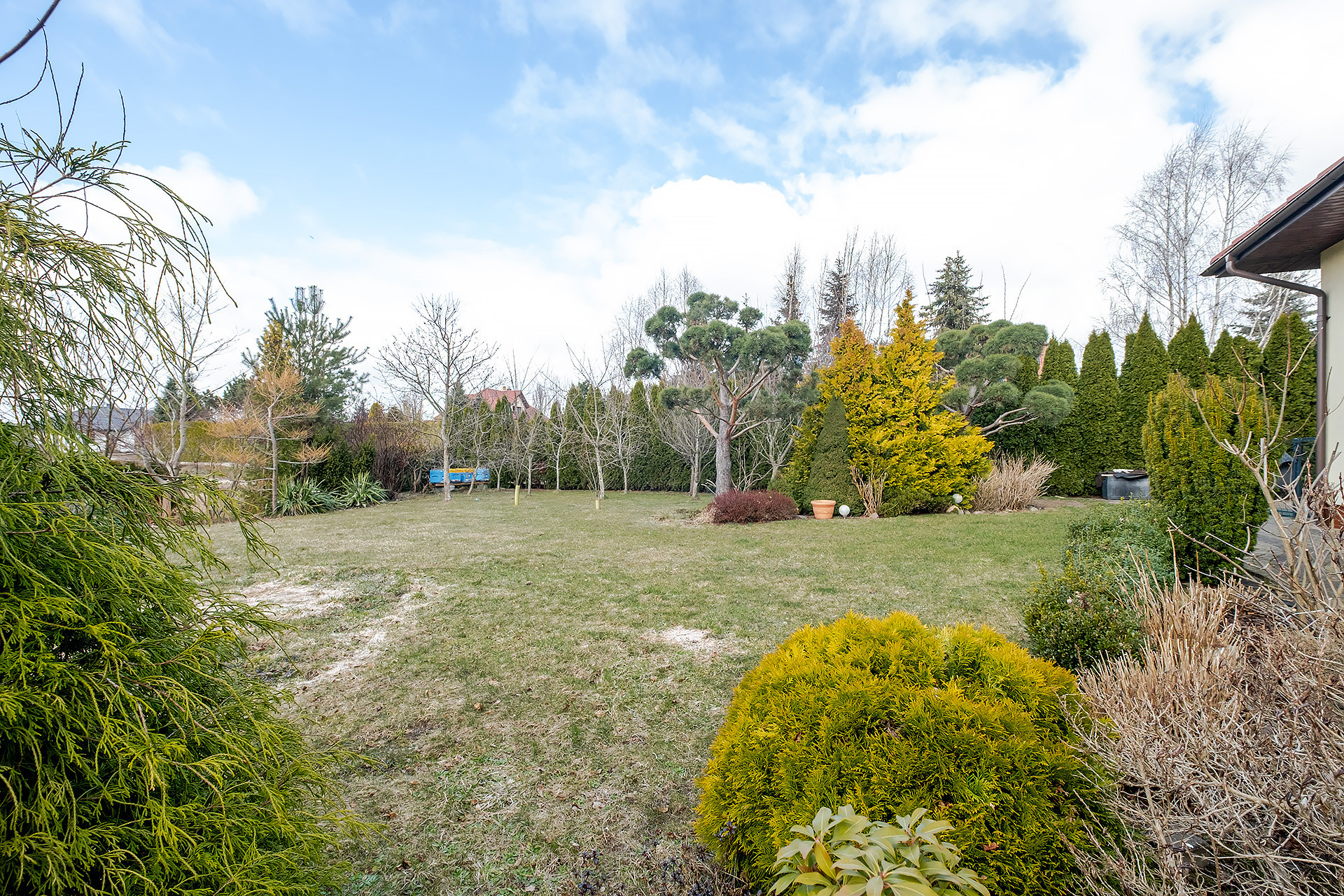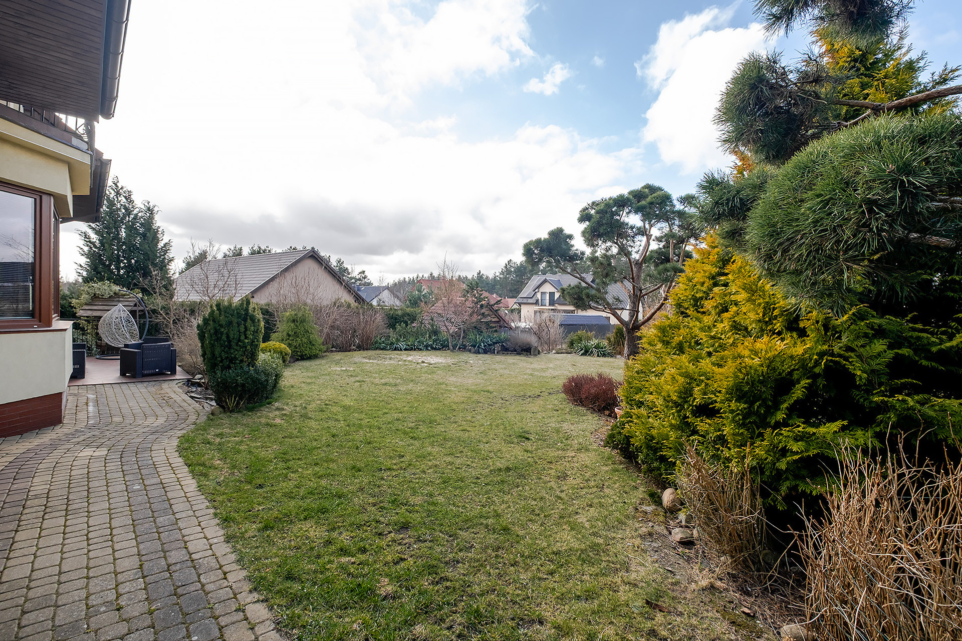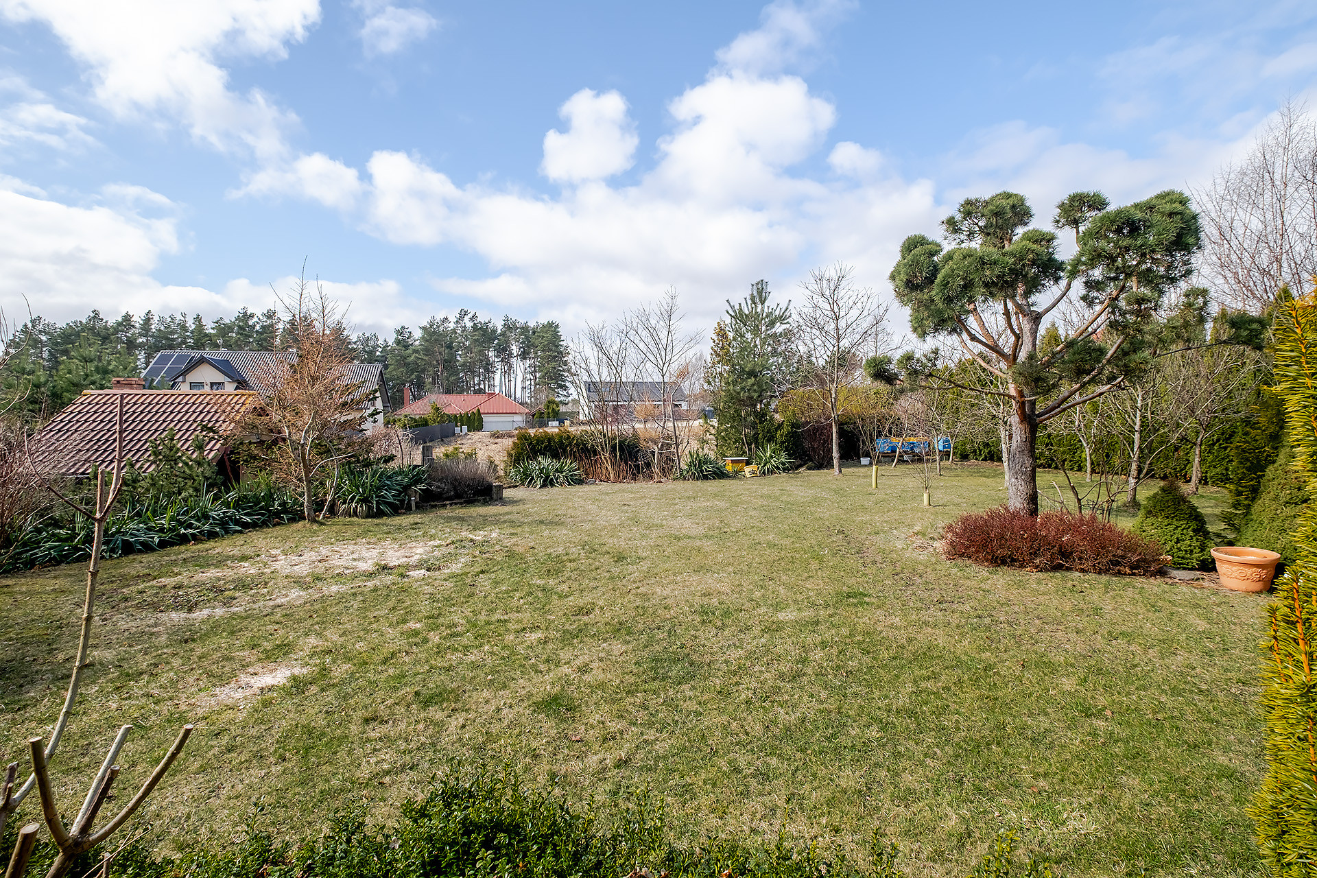 Ogród został ładnie zagospodarowany zielenią z wydzielonymi strefami na składowanie( drewutnia z komórką i wiata) oraz część z wędzarnia oraz piecem chlebowym. Dodatkowo w ogrodzie rozprowadzony jest system nawadniania oraz zbiornik na deszczówkę z pompą.