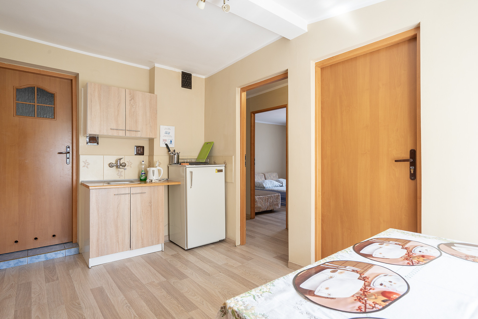 Parter: 2 kawalerki – obecnie przystosowane do noclegu dla 8 osób (po 4 osoby w mieszkaniu),