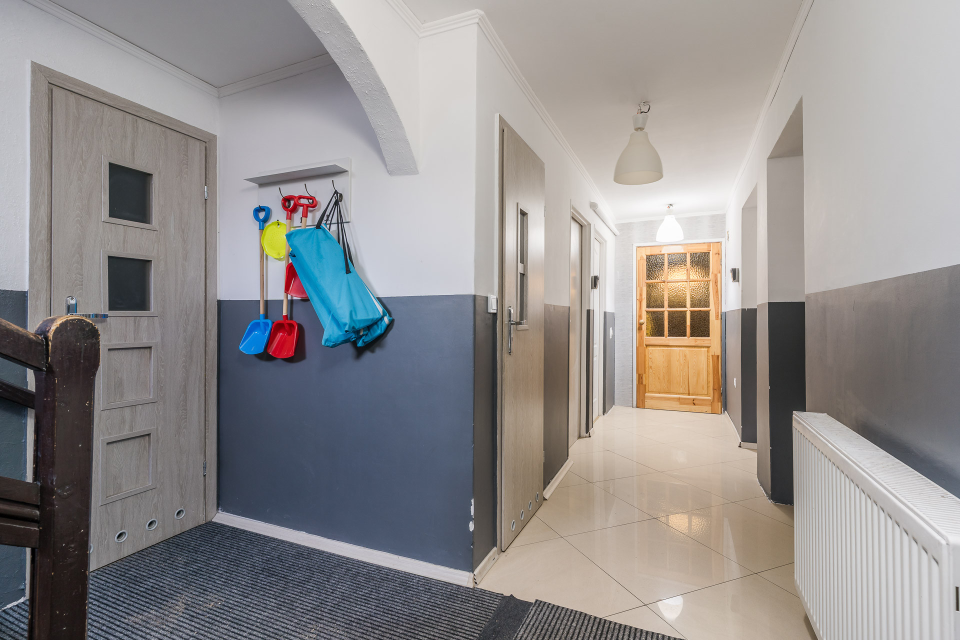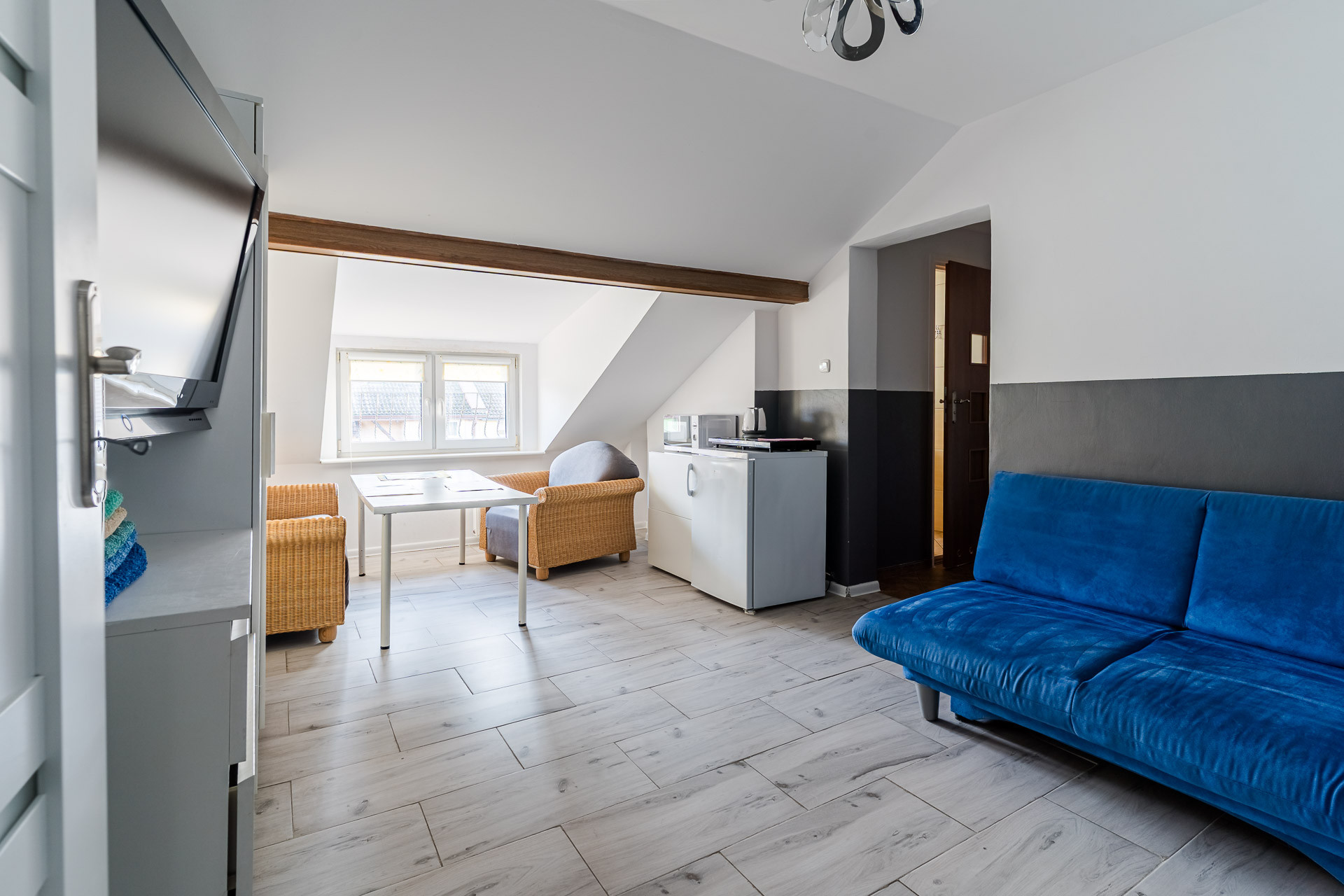 Apartamenty i pokoje mieszkalne znajdują się na 2 piętrach i poddaszu.