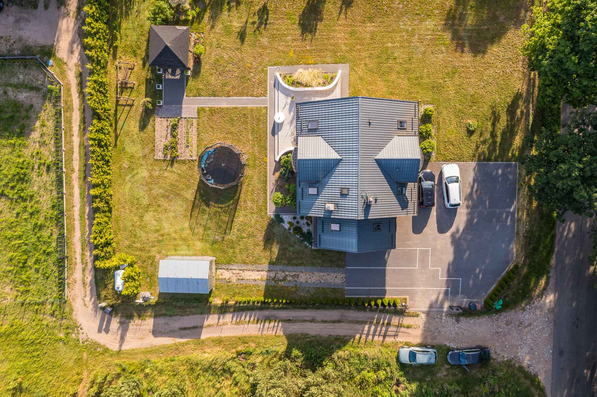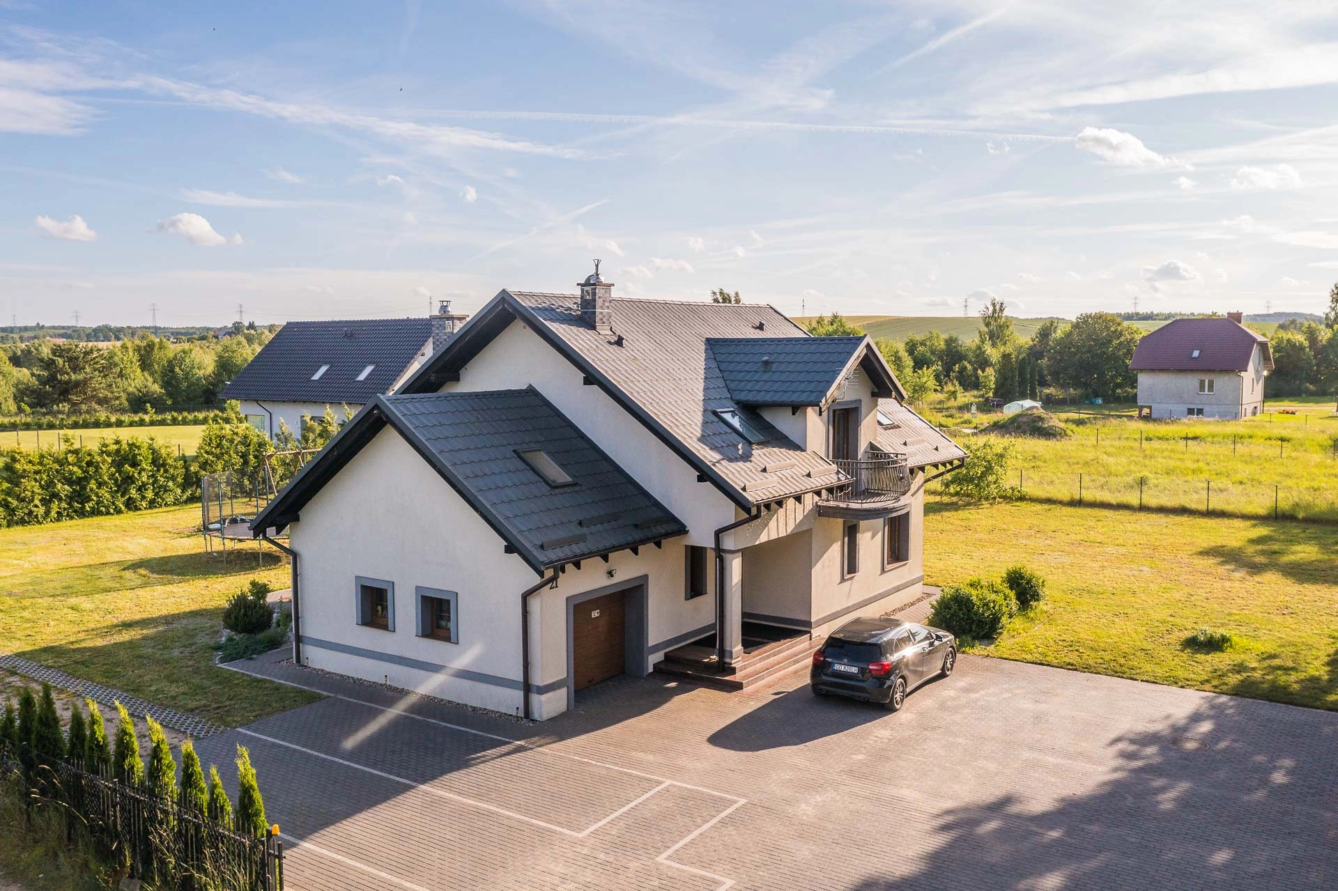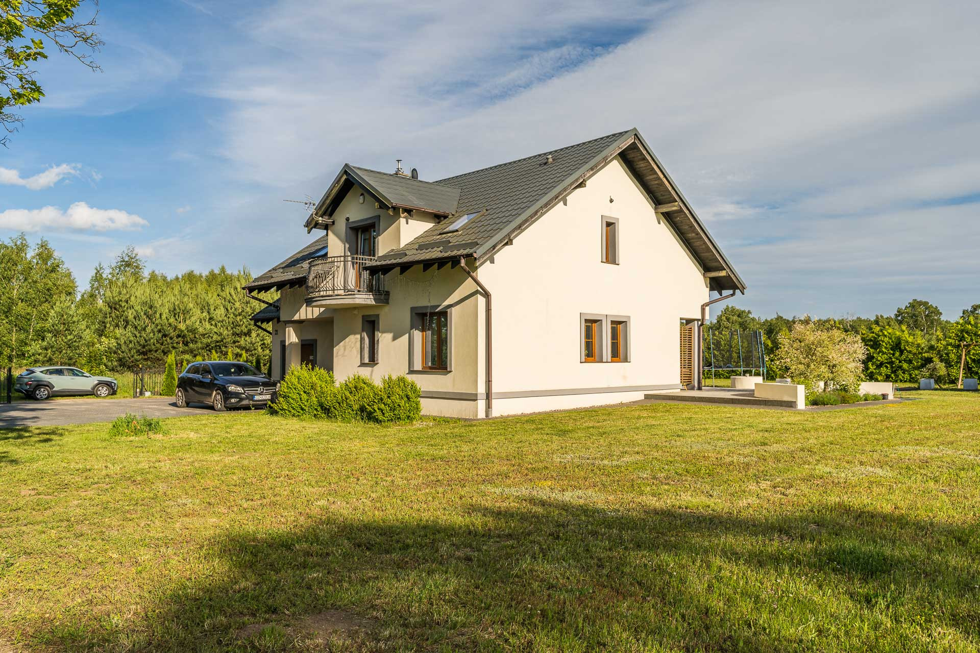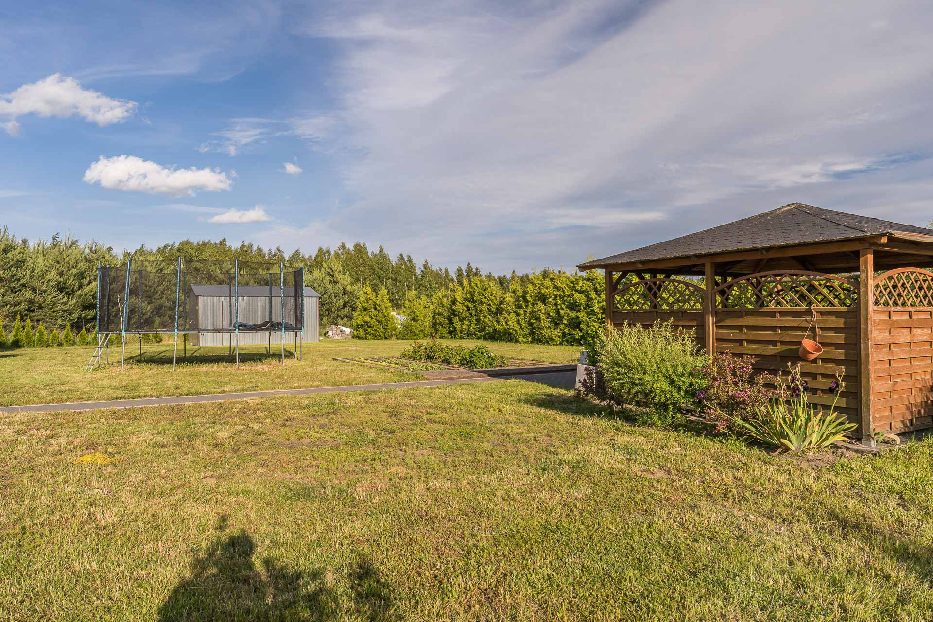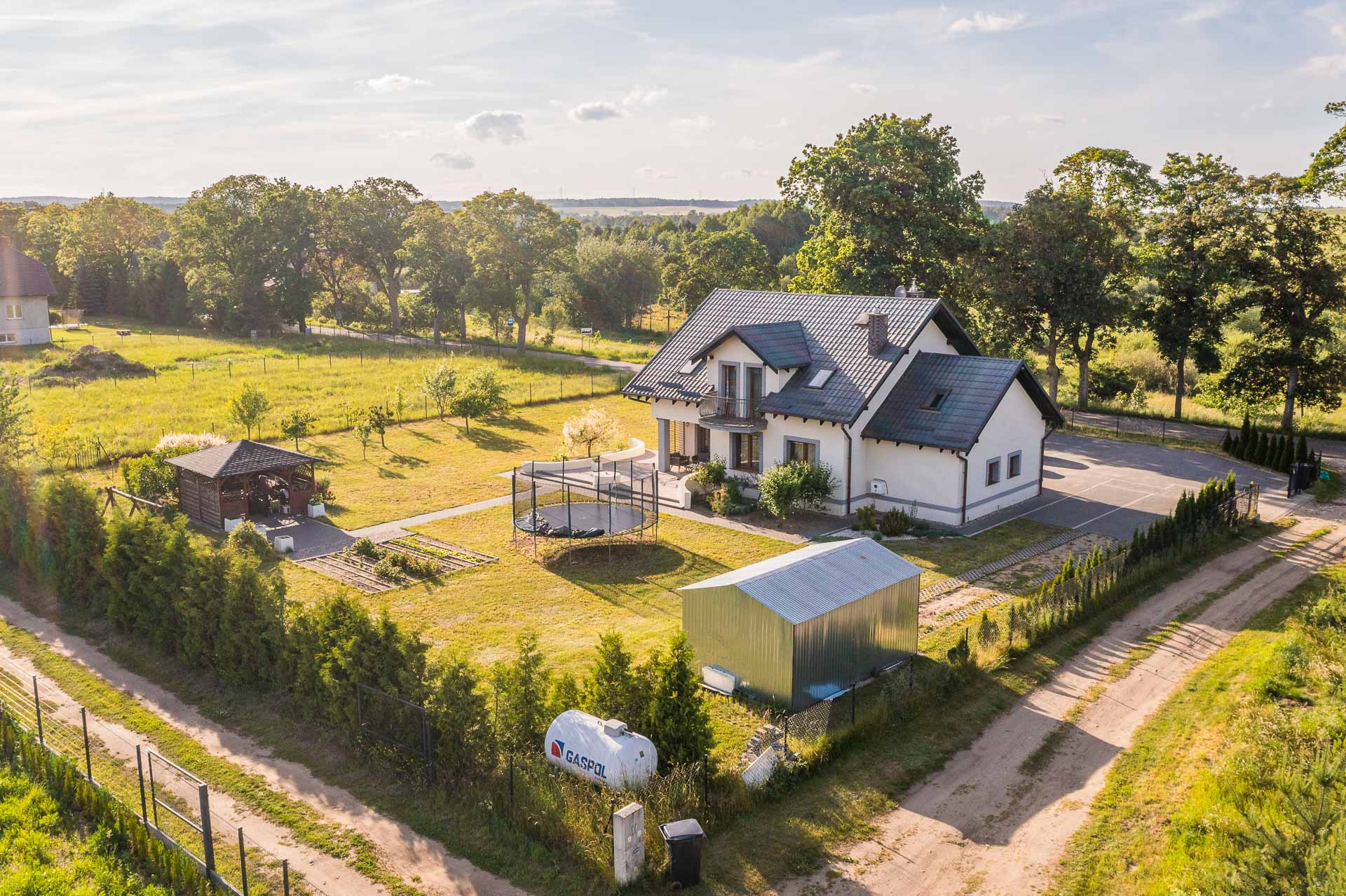 Dom położony na działce o powierzchni 1718 m², z dojazdem drogą asfaltową. Działka jest w pełni uzbrojona – doprowadzone zostały: woda, prąd, światłowód oraz szambo. Teren posesji został ogrodzony siatką, a wjazd odbywa się przez automatycznie sterowaną, przesuwną bramę. Przed domem znajduje się podjazd wyłożony kostką brukową, zapewniający wygodne parkowanie. Działka jest starannie zagospodarowana – nasadzenia z tui zapewniają prywatność, a drzewka owocowe dodają uroku otoczeniu. Na terenie posesji znajduje się również blaszany garaż, altana ogrodowa oraz huśtawka dla dzieci, co czyni to miejsce idealnym zarówno do codziennego życia, jak i wypoczynku.