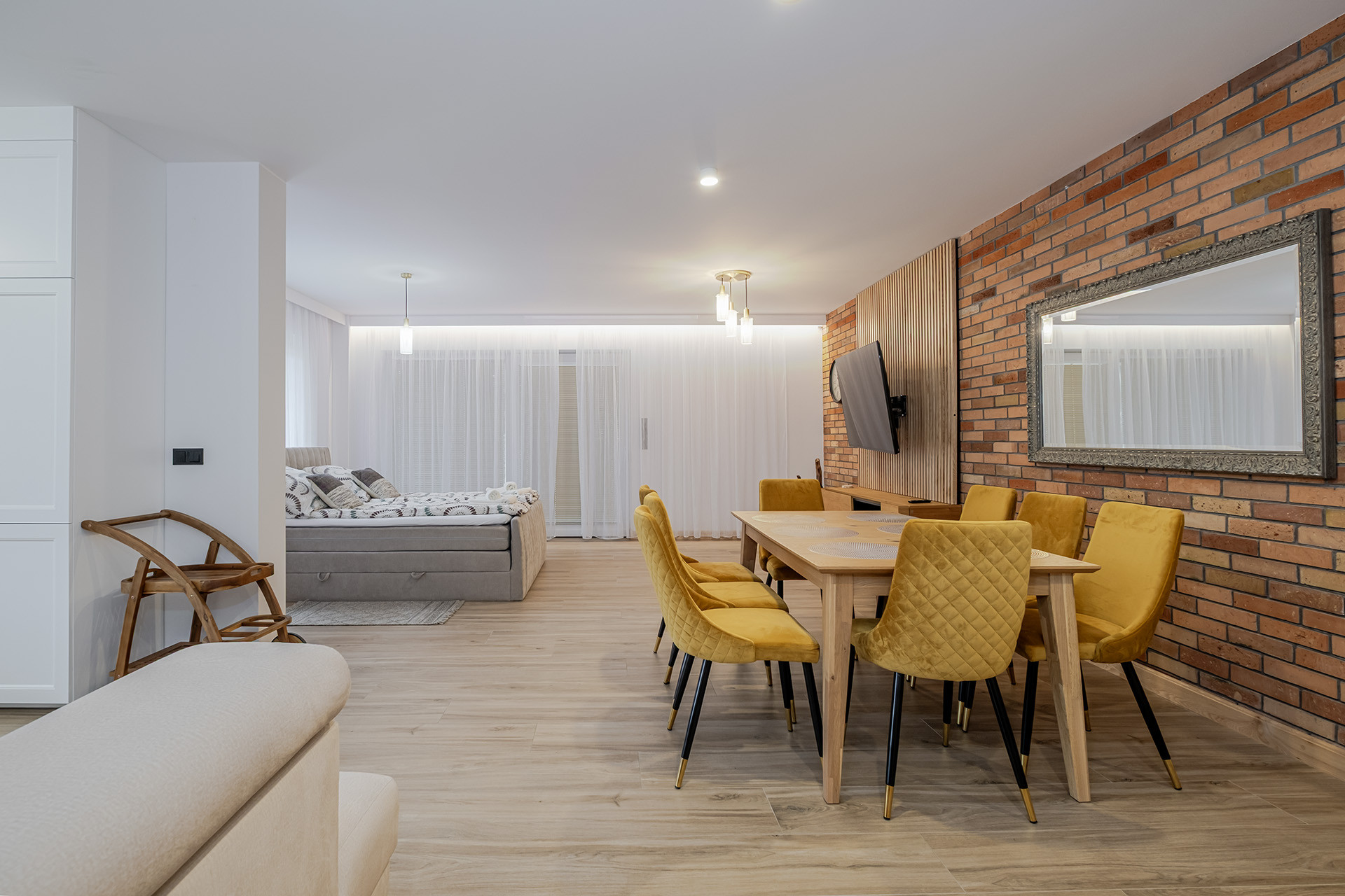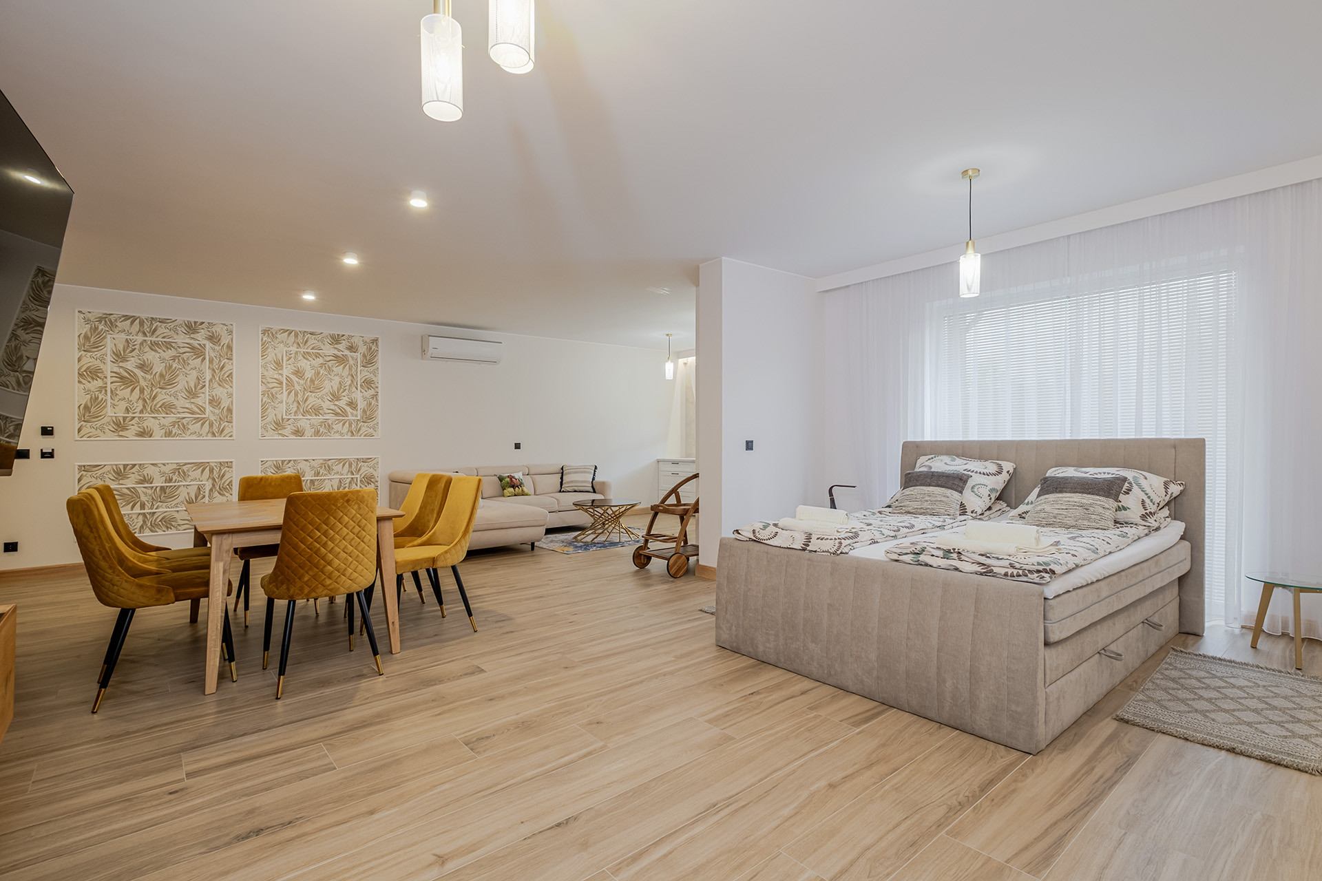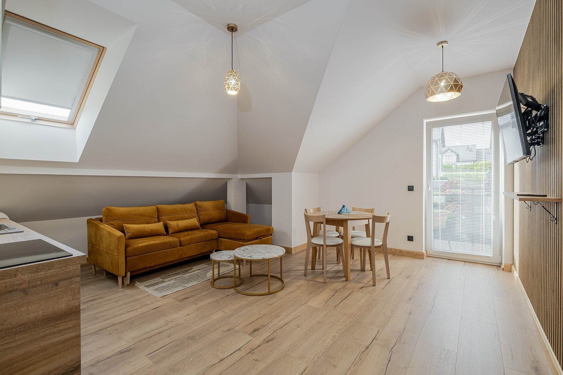 Na parterze i poddaszu łącznie siedem apartamentów. (każdy wykończony o wysokim standardzie z klimatyzacją)