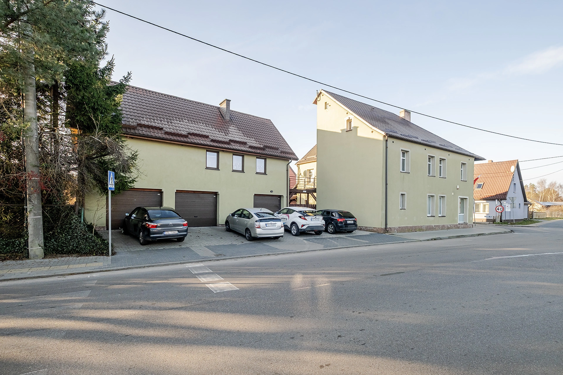 Dodatkowym atutem jest osobny budynek garażowy na 3 samochody, połączony z domem, z dodatkową powierzchnią mieszkalną ok. 90 m² nad garażami – idealną pod wynajem, cele rodzinne lub zaplecze dla personelu. Nieruchomość posiada wszystkie media, instalację fotowoltaiczną oraz dostęp do Internetu. Jeden licznik obsługuje całość obiektu.