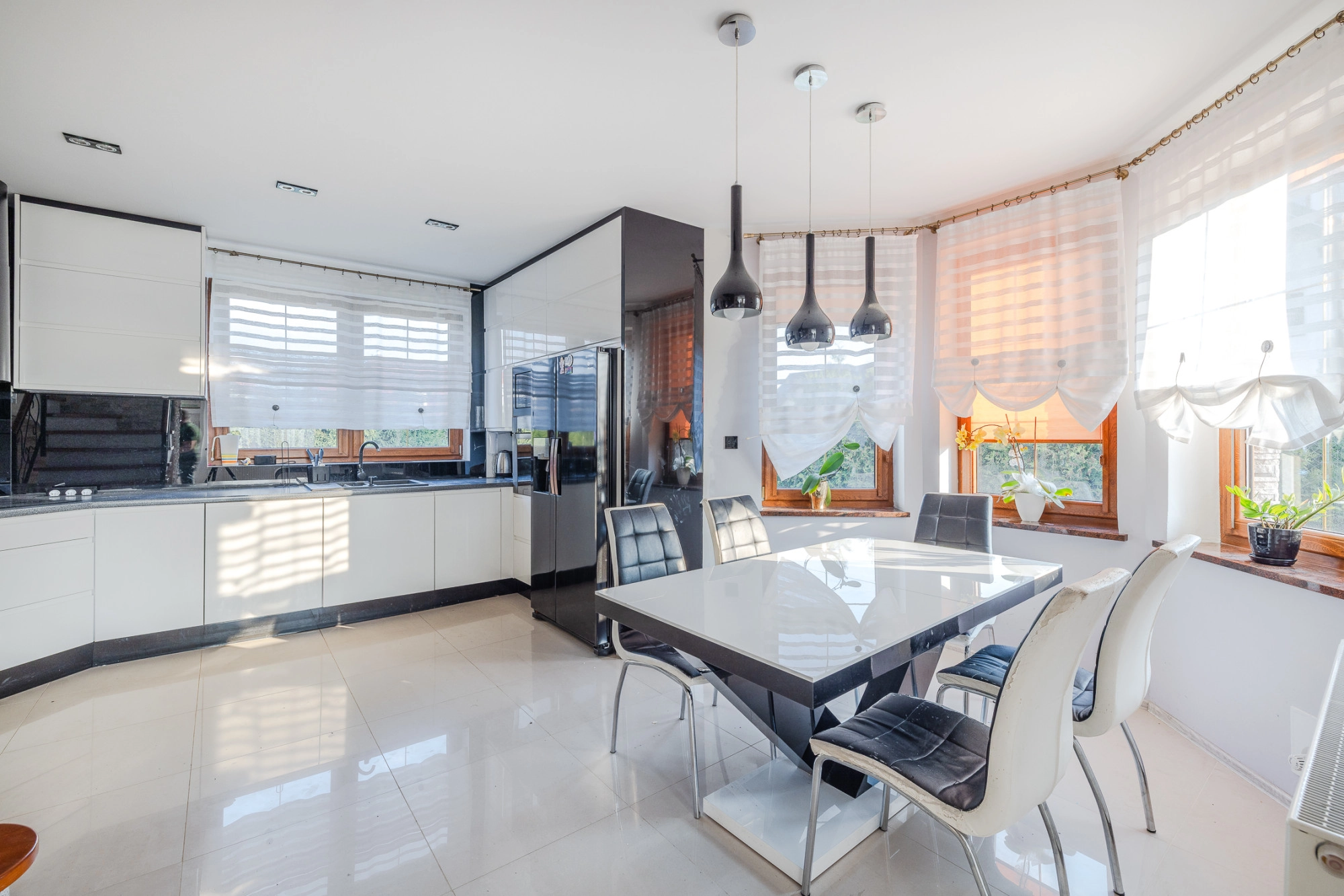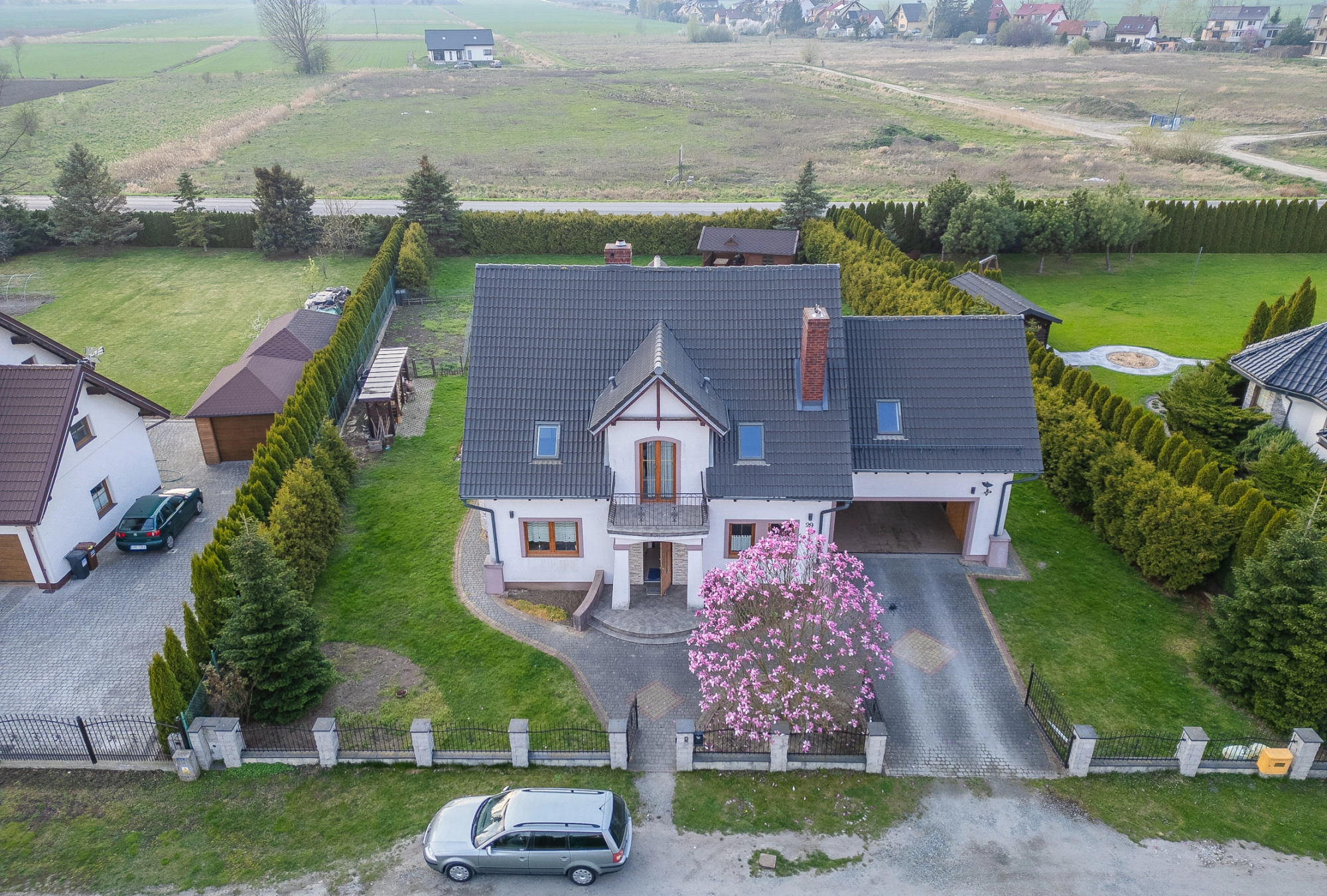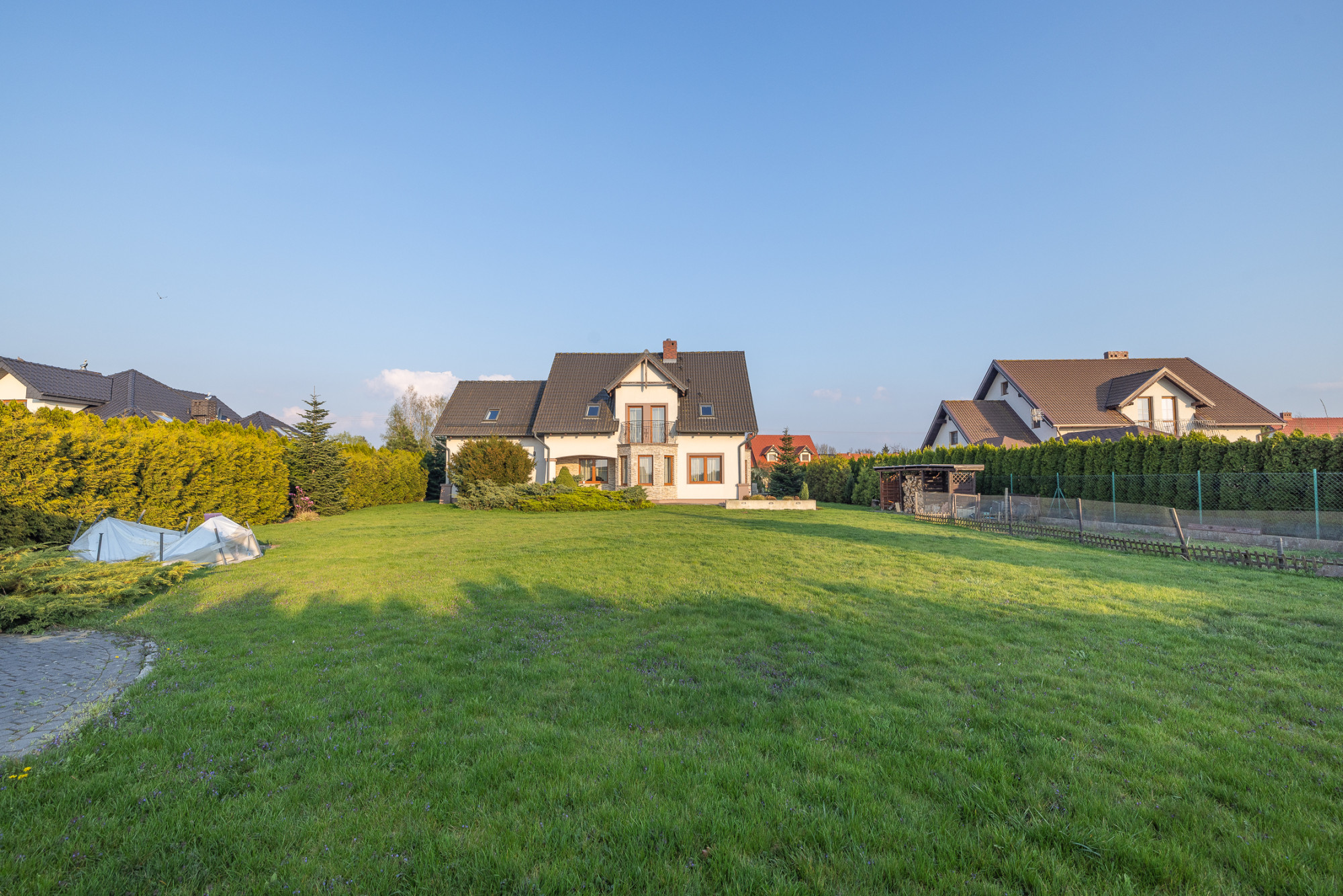 DZIAŁKA: budynek posadowiony jest na działce w kształcie prostokąta o wielkości 1632 m2. Teren jest płaski, przez co łatwy w aranżacji. W ogrodzie znajdziemy drzewa (np. przepiękną magnolię z fioletowymi kwiatami), krzewy, trawnik, warzywnik, altanę, miejsce składowania drewna kominkowego. Obejście domu i podjazd garażowy wyłożone są kostką brukową. Posesja posiada ogrodzenie kute z elementami murowanymi, a także w postaci siatki. Wjazd na nią odbywa się poprzez automatycznie otwieraną bramę, a wejście przez furtkę. Usytuowanie domu przy spokojnej ulicy sprawia, że możemy cieszyć się ciszą i brakiem bezustannie jeżdżących samochodów.