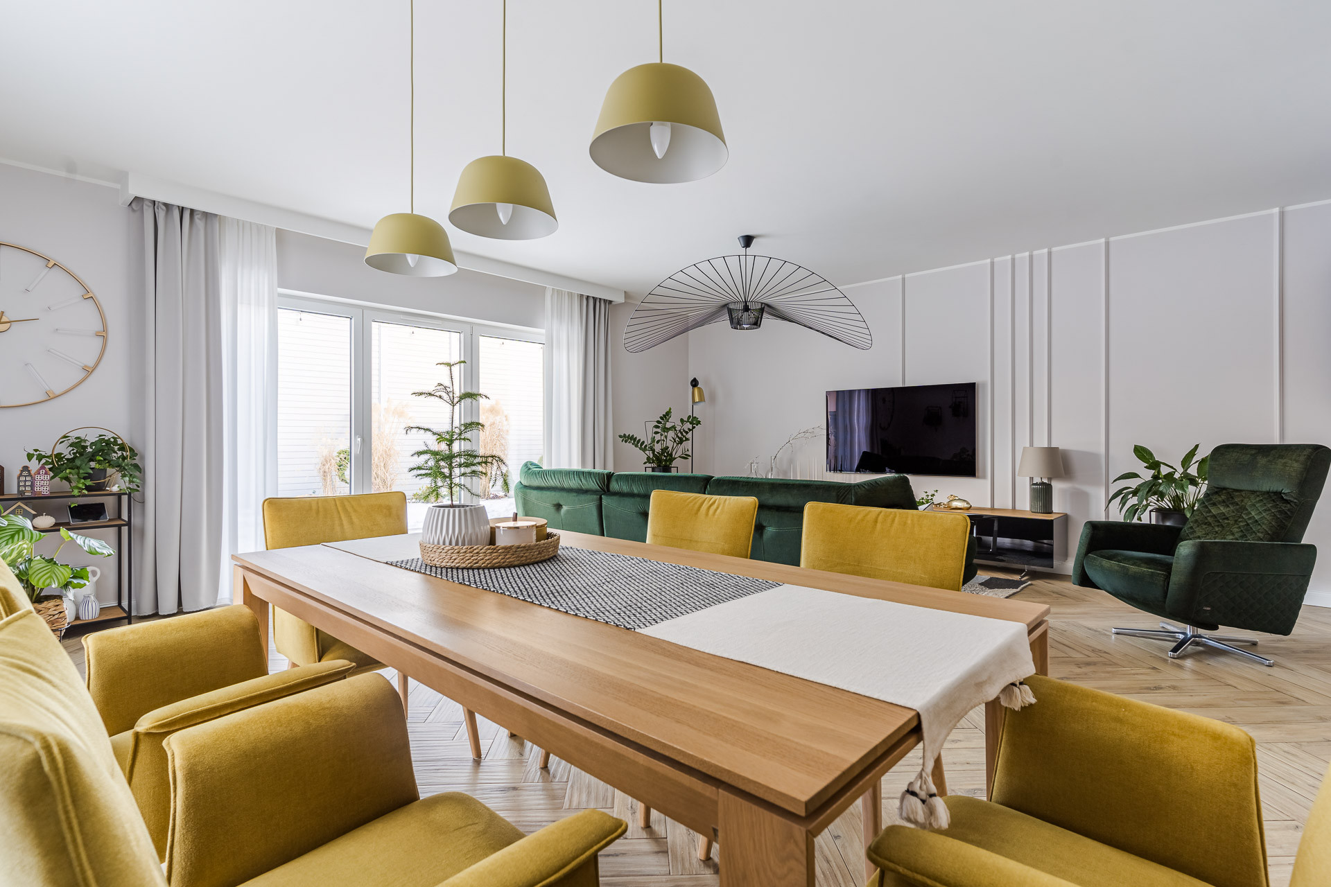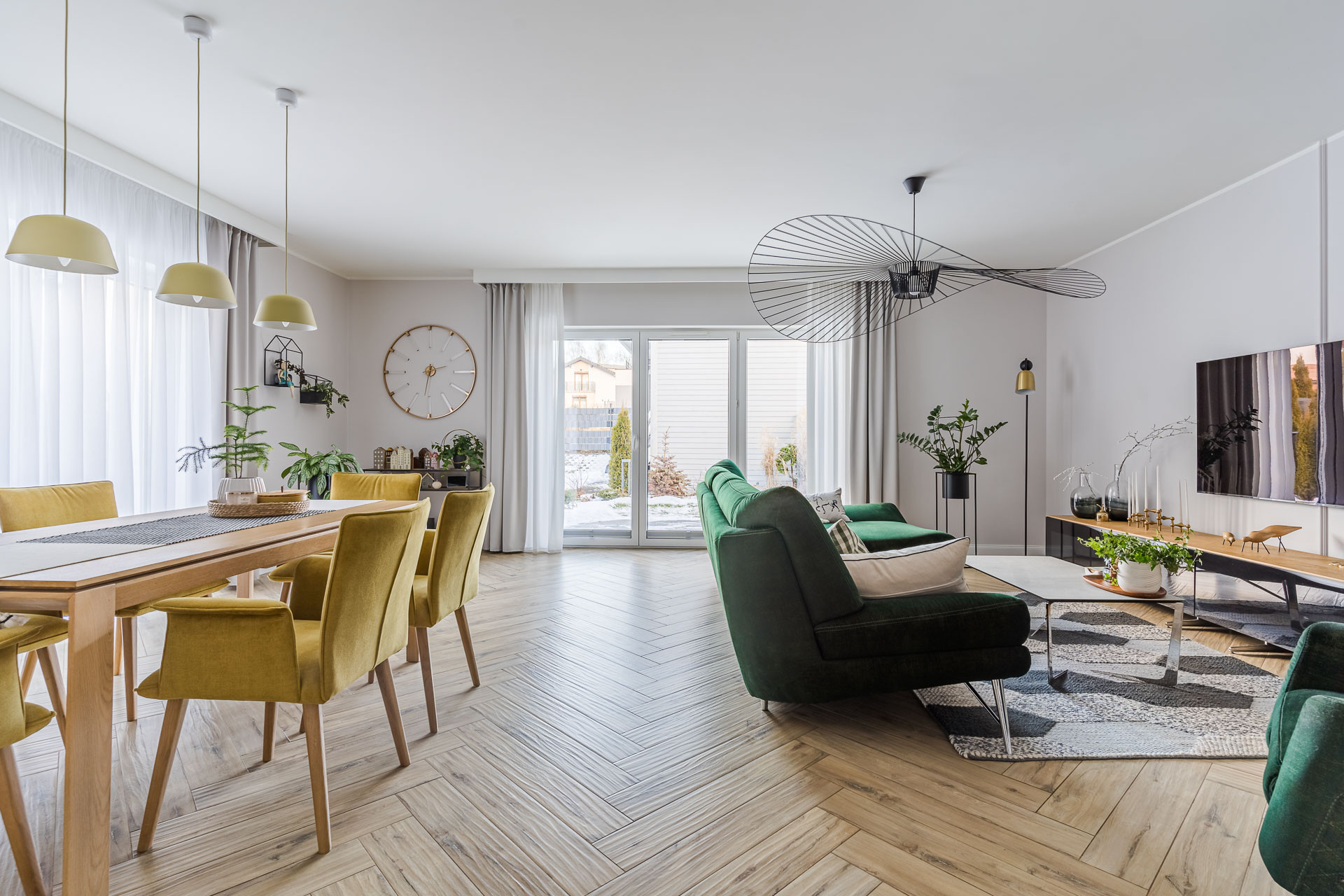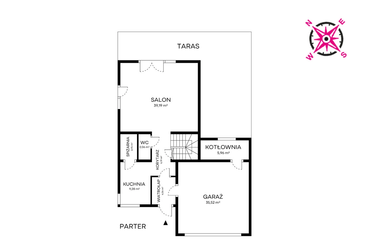 – salon (39,19 m2) z wyjściem na zadaszony taras i ogród,