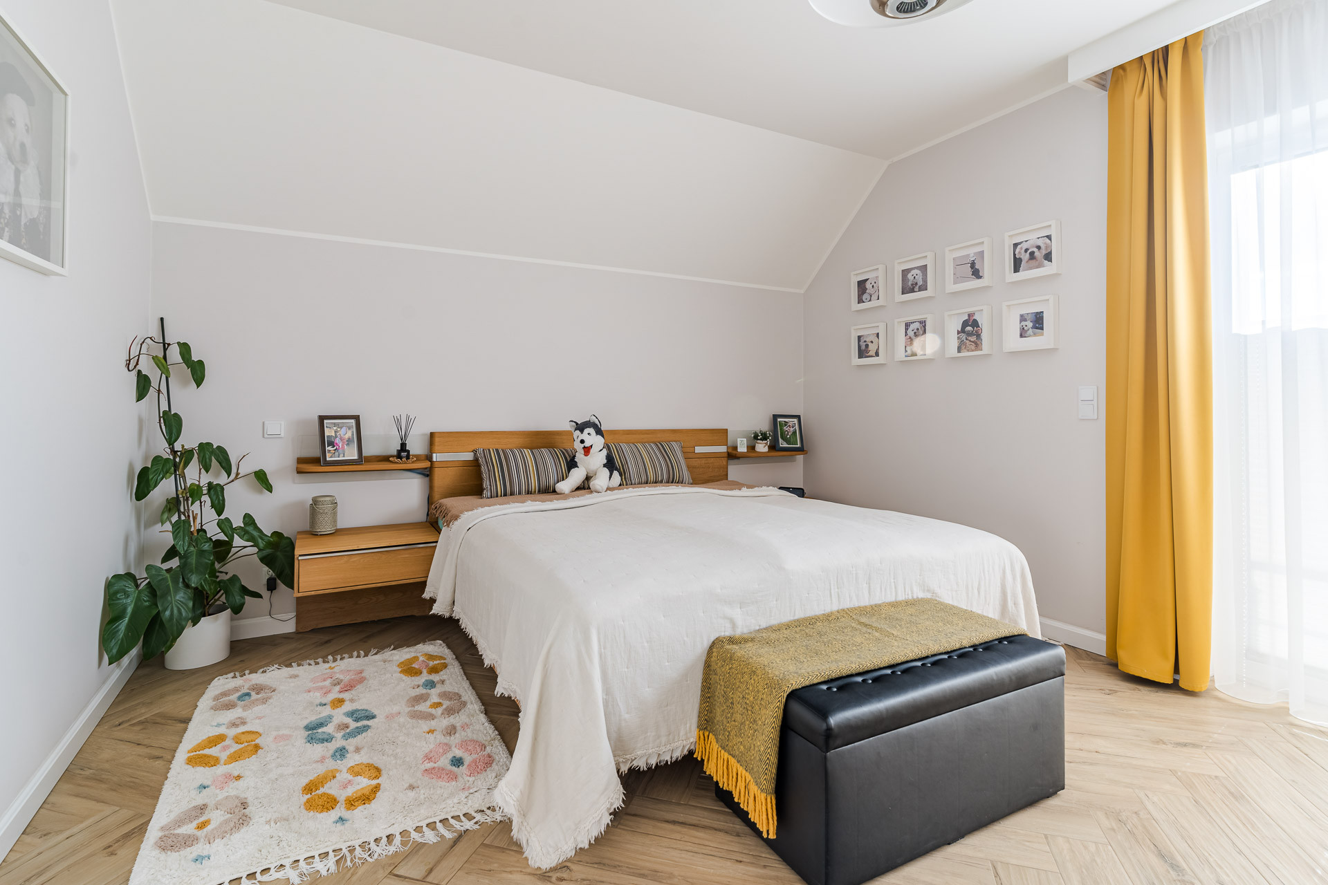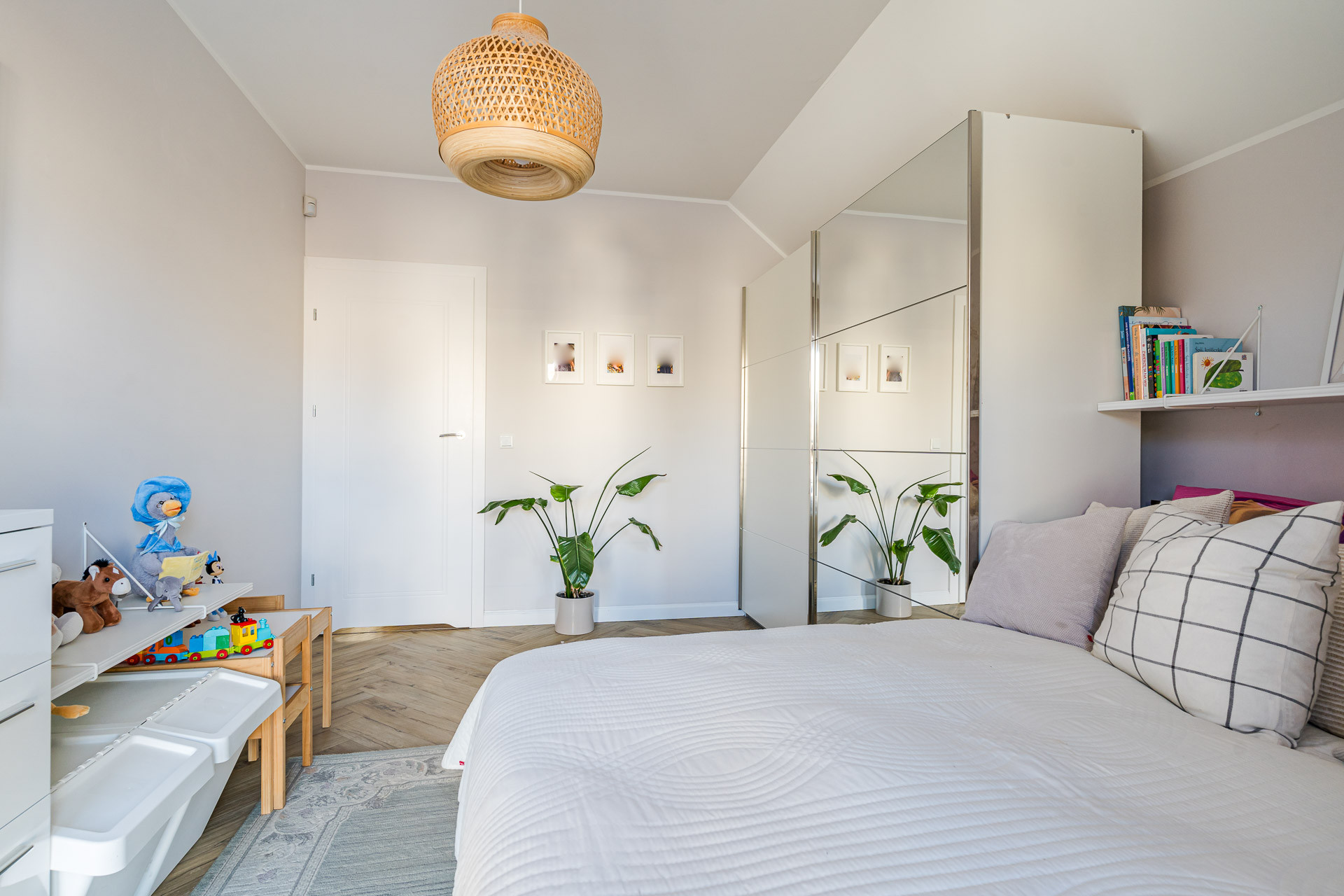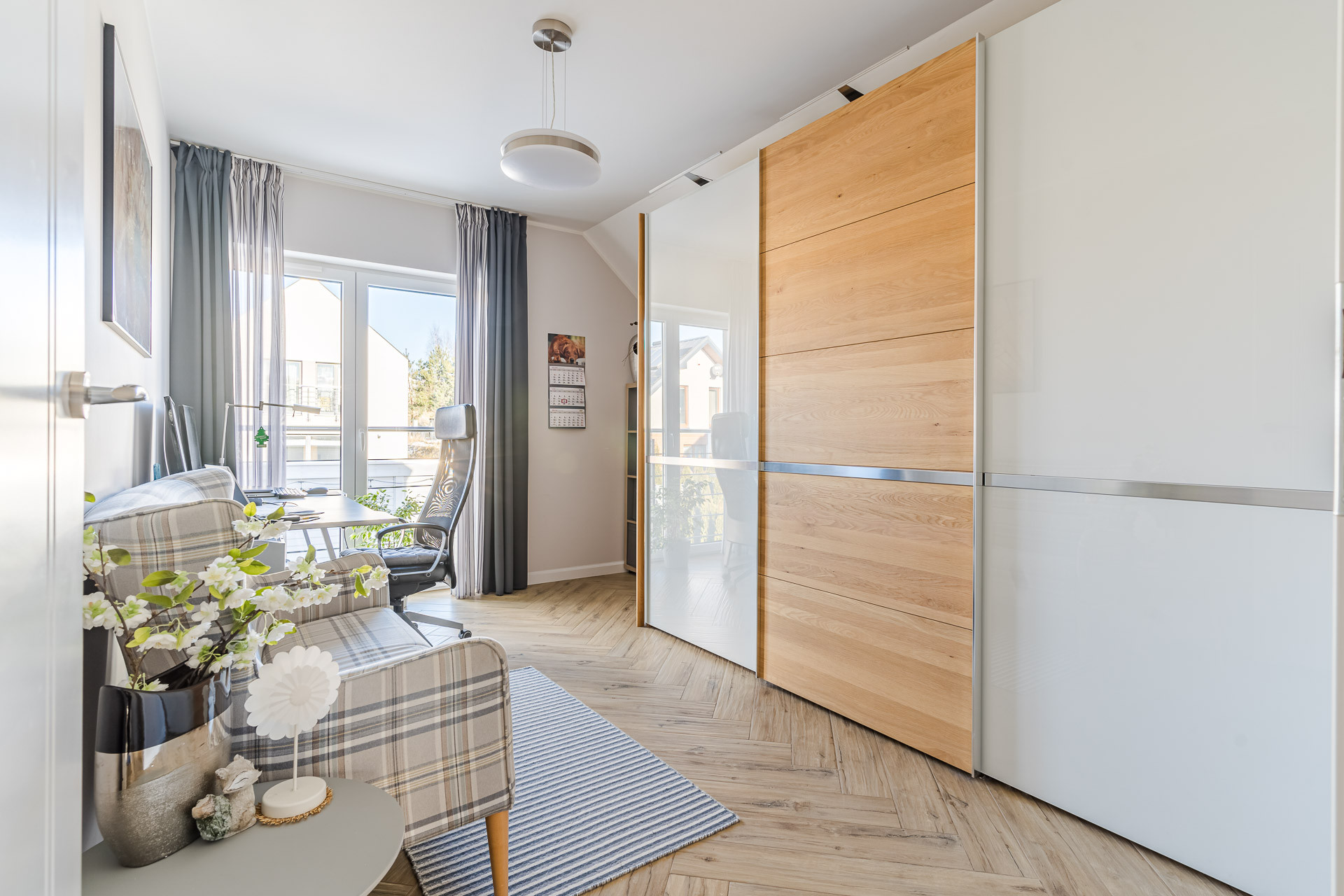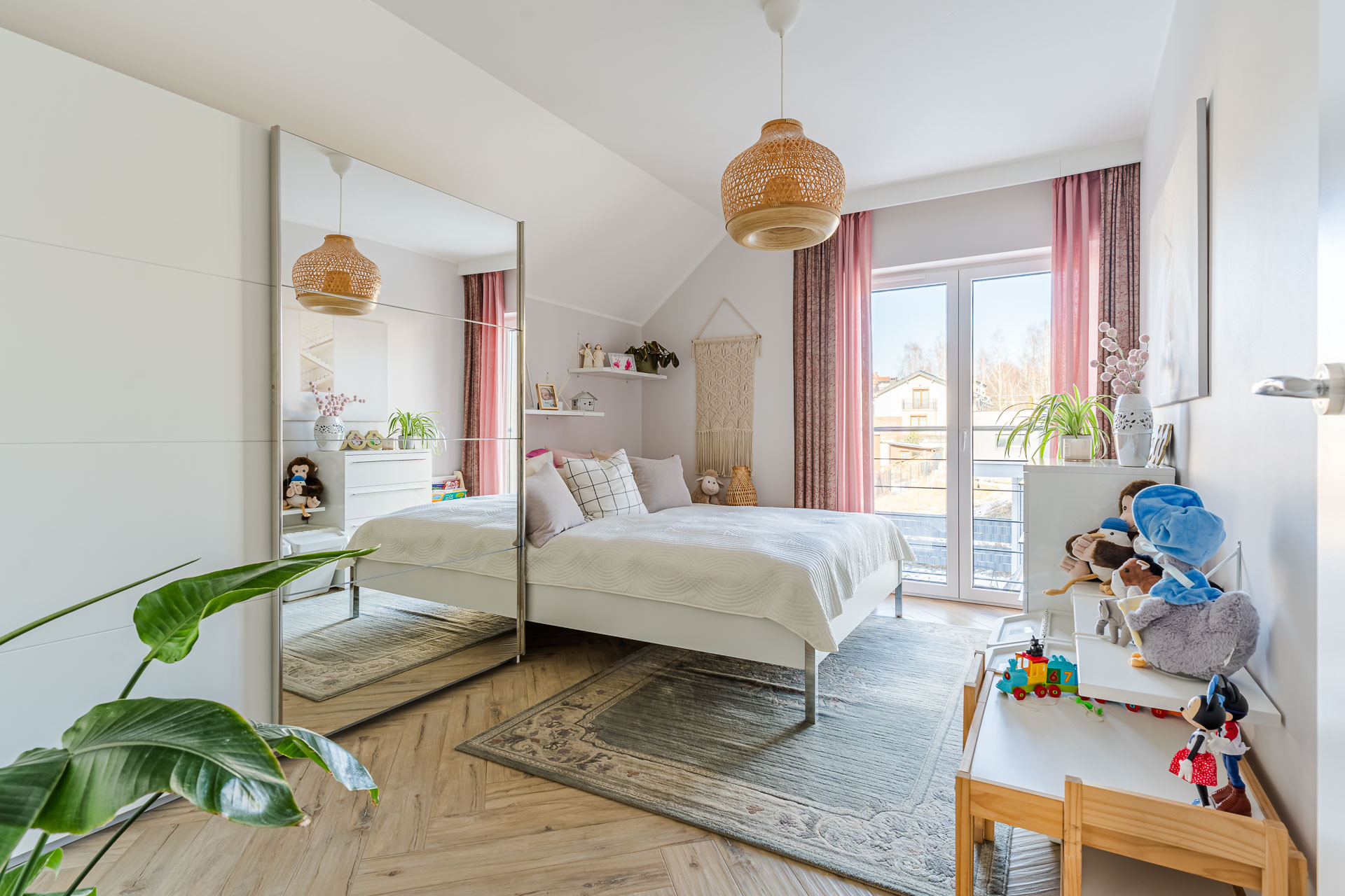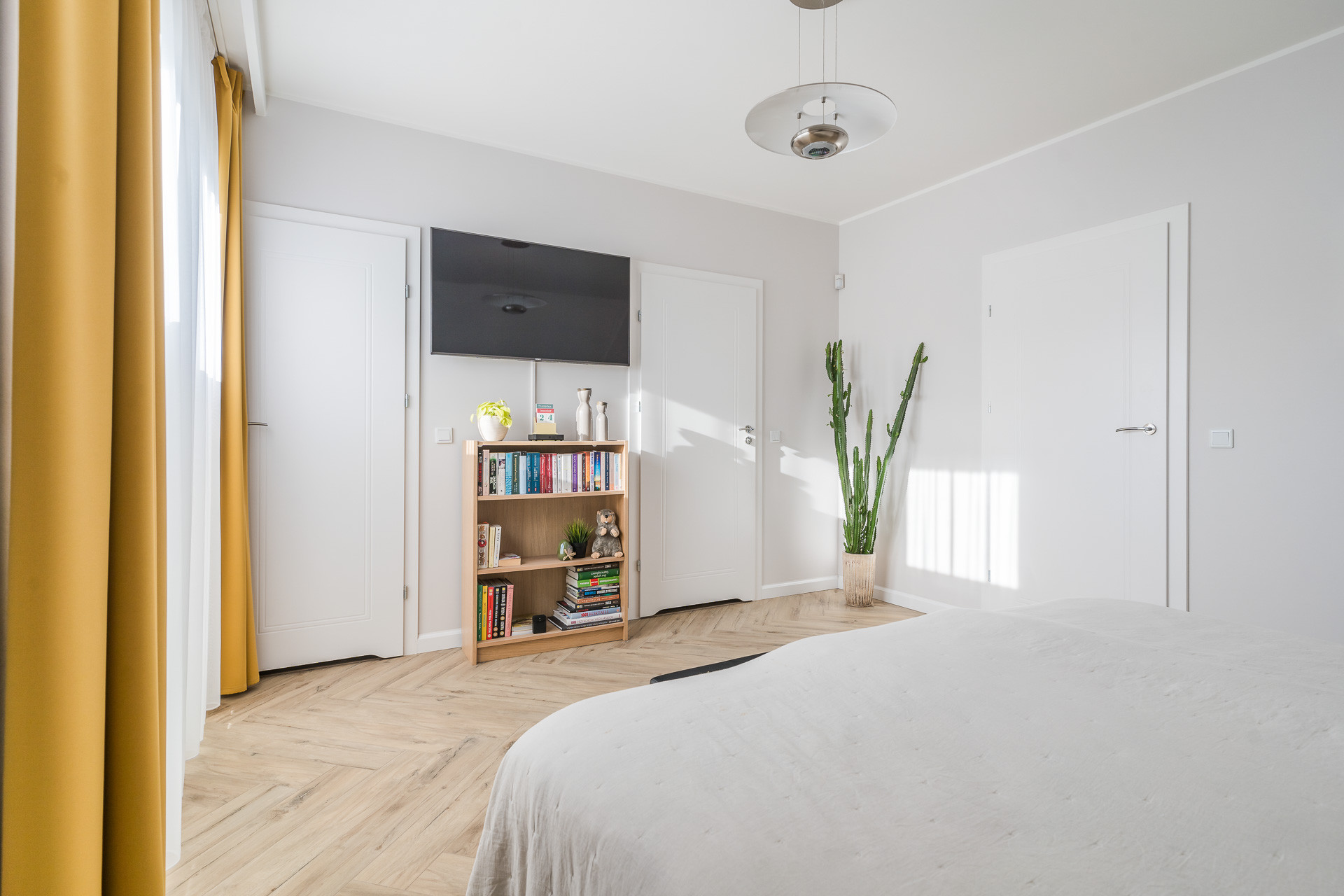 – 3 sypialnie (16,55 m2; 14,38 m2 oraz 14,38 m2); największa z nich z prywatną łazienką (4,51 m2), gdzie znajdziemy wc, wannę, umywalkę, lustro, grzejnik drabinkowy oraz garderobą (3,10 m2); z sypialni tej wyjdziemy także na duży, narożny taras, z którego rozpościera się niczym niezakłócony widok na staw oraz zieleń w postaci łąk i drzew,
