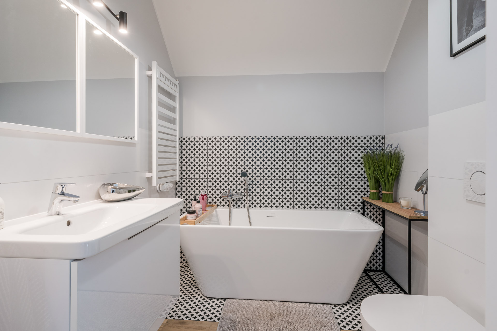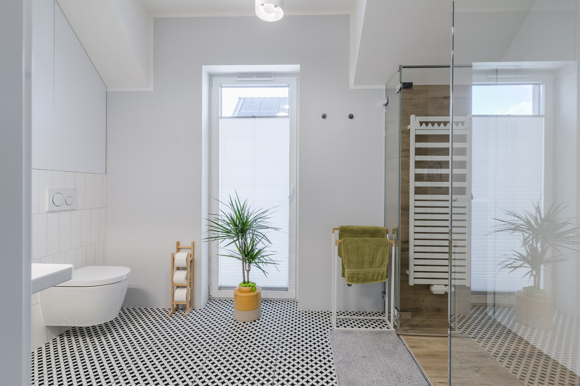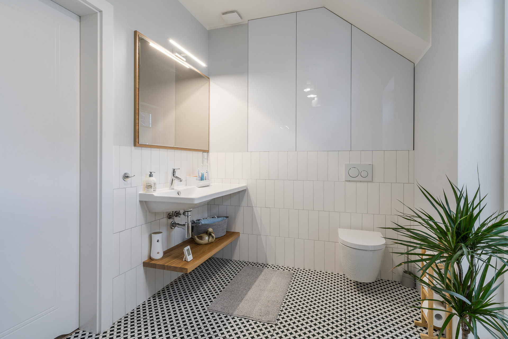 – łazienka (7,78 m2) z wc, prysznicem typu walk-in, umywalką, lustrem, grzejnikiem drabinkowym i oknem,