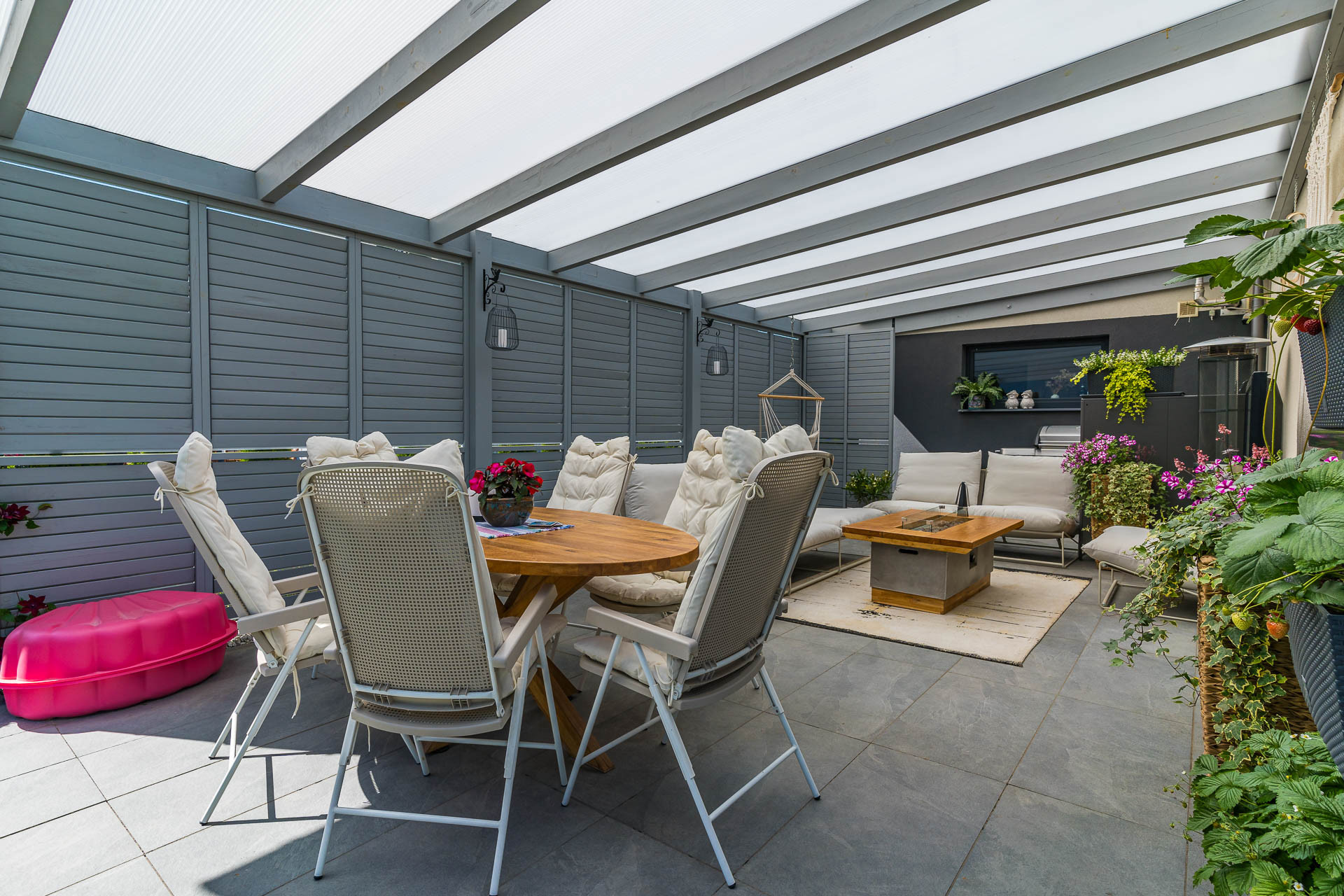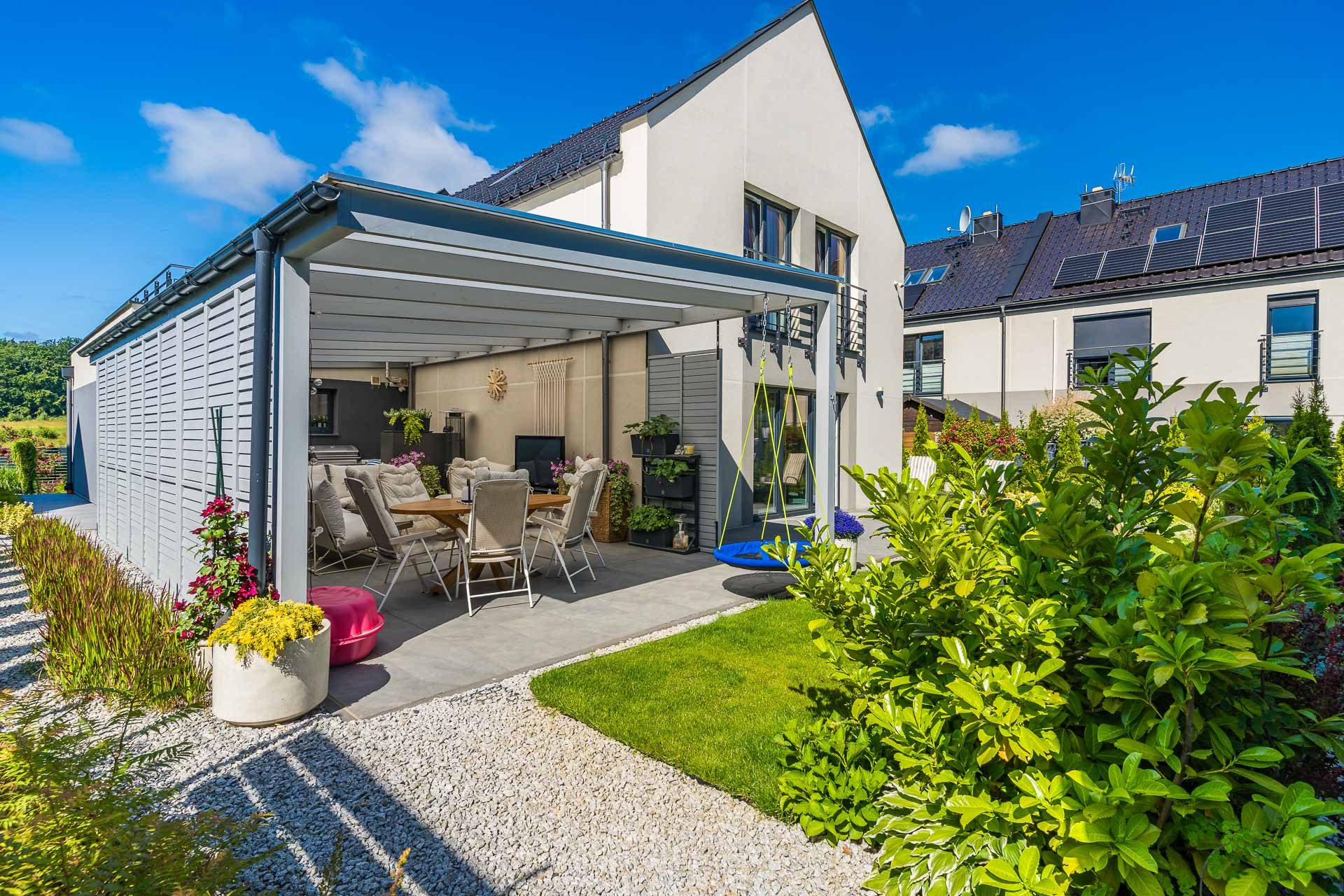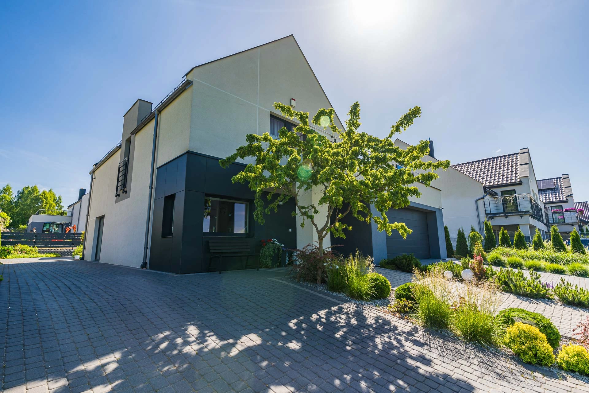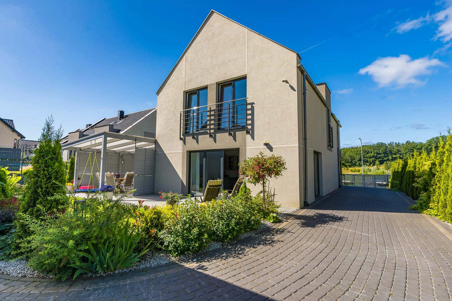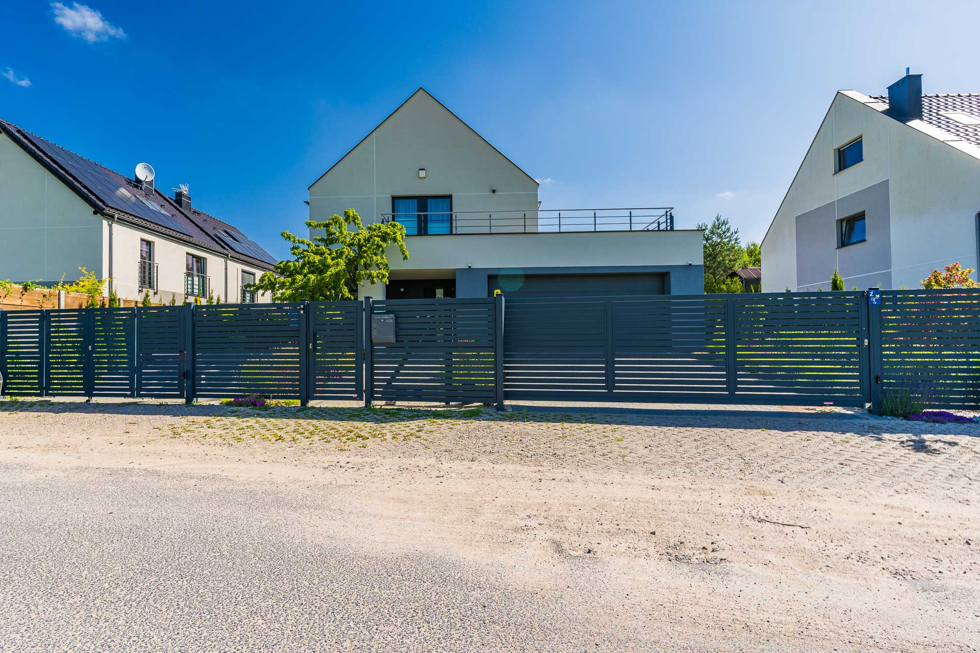 DZIAŁKA: budynek posadowiony jest na działce w kształcie prostokąta o wielkości 656 m2. Teren jest płaski, przez co łatwiejszy w aranżacji. W ogrodzie znajdziemy drzewa, krzewy, kwiaty i trawnik. Uwadze nie umknie z pewnością ogromna wiata samochodowa mogąca pomieścić kamper lub 4 auta osobowe. Za podlewanie odpowiedzialny jest specjalny system nawadniania. Obejście domu i podjazd garażowy wyłożone są kostką brukową. Posesja posiada ogrodzenie w postaci aluminiowych paneli i stalowej siatki. Wjazd na nią odbywa się poprzez automatycznie otwieraną bramę, a wejście przez furtkę. Usytuowanie domu przy spokojnej ulicy sprawia, że możemy cieszyć się ciszą i brakiem bezustannie jeżdżących w pobliżu samochodów.