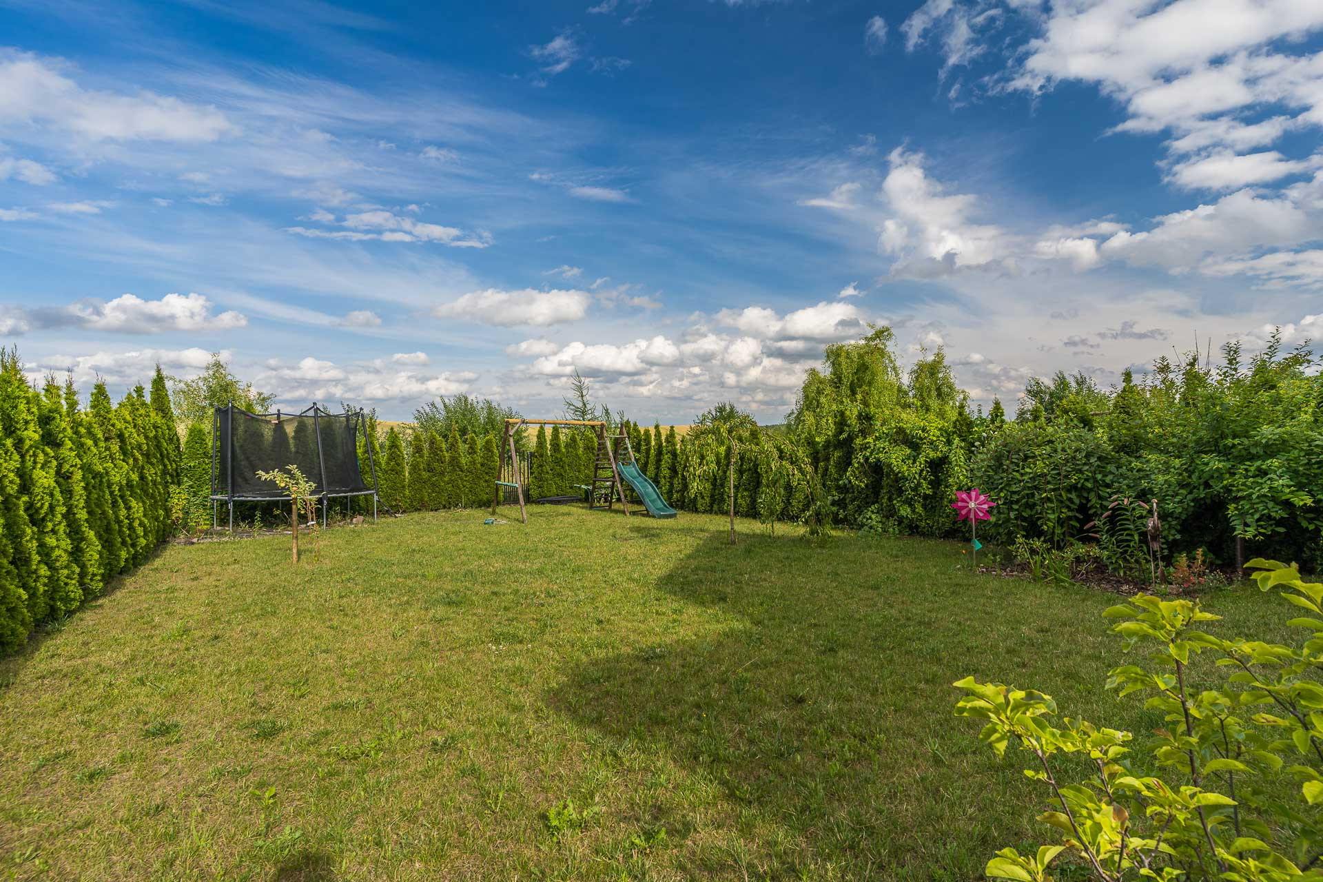 W kształcie prostokąta, o łącznej powierzchni 453 m2. Znajduje się tu zadbany trawnik z systemem nawodnienia automatycznego oraz parkan z iglaków w granicy działki. Ponadto jest kilka drzew i krzewów owocowych. Teren ogrodzony z placem zabaw dla dzieci. Miejsce idealne do wypoczynku dla całej rodziny.