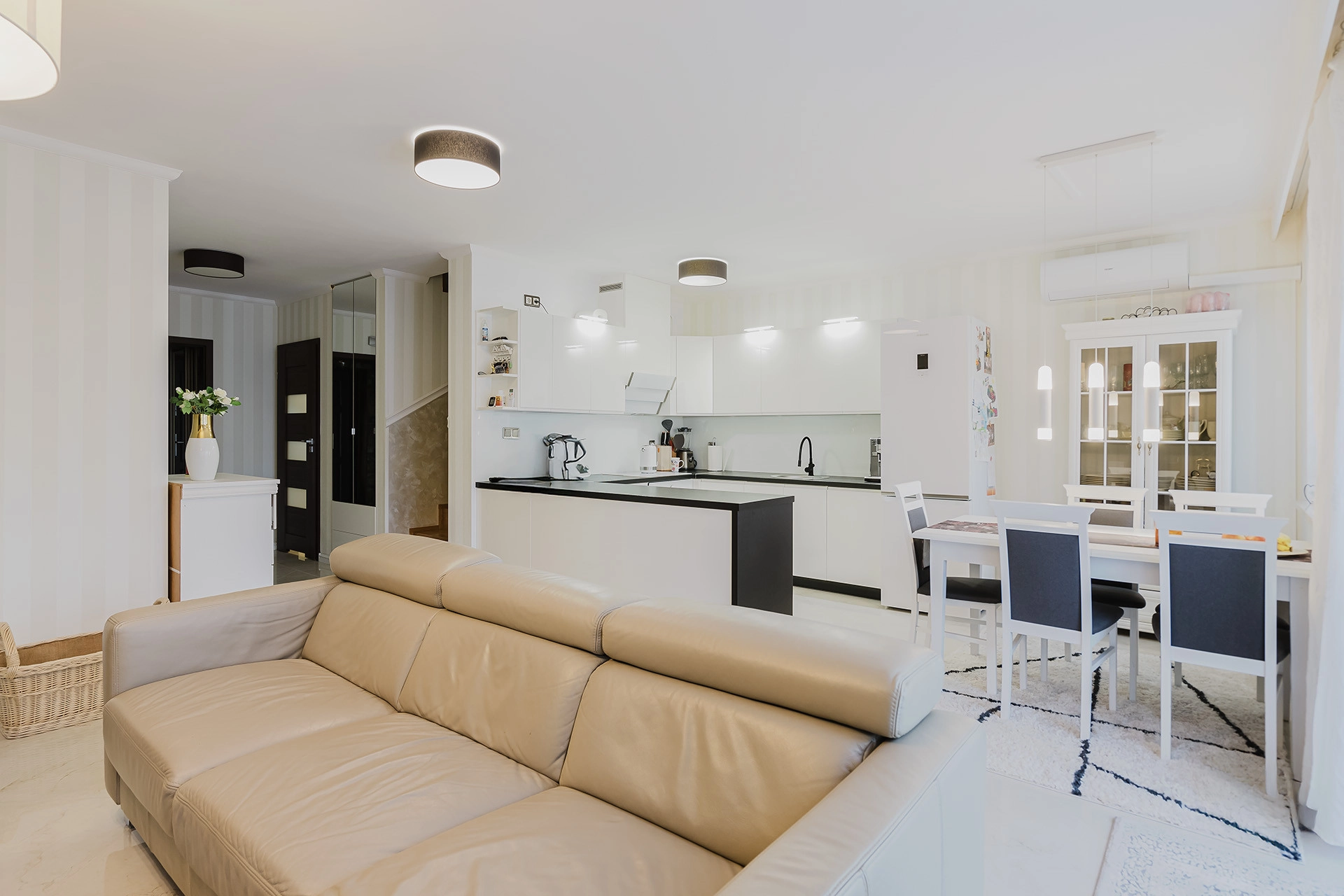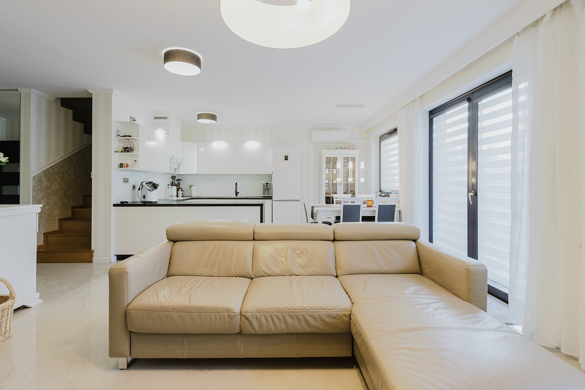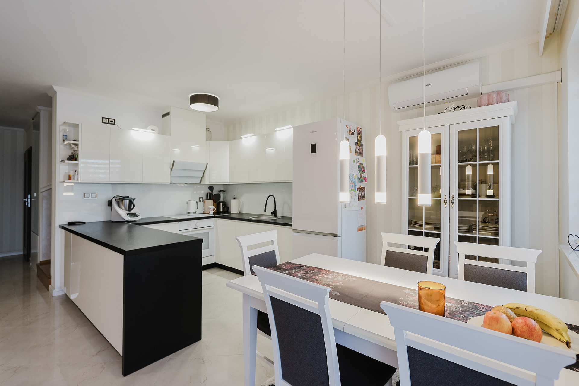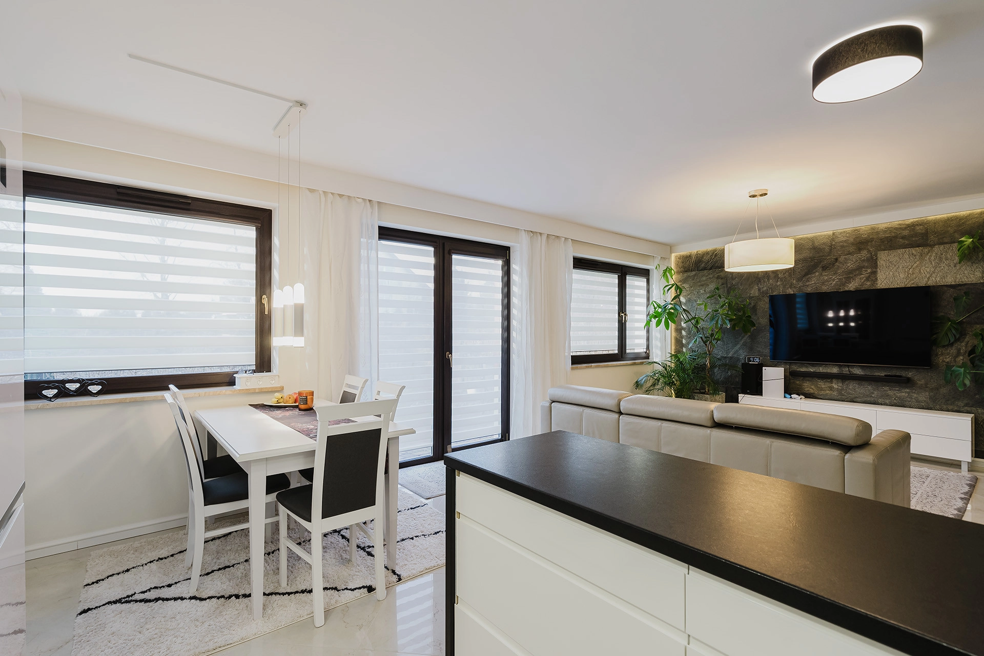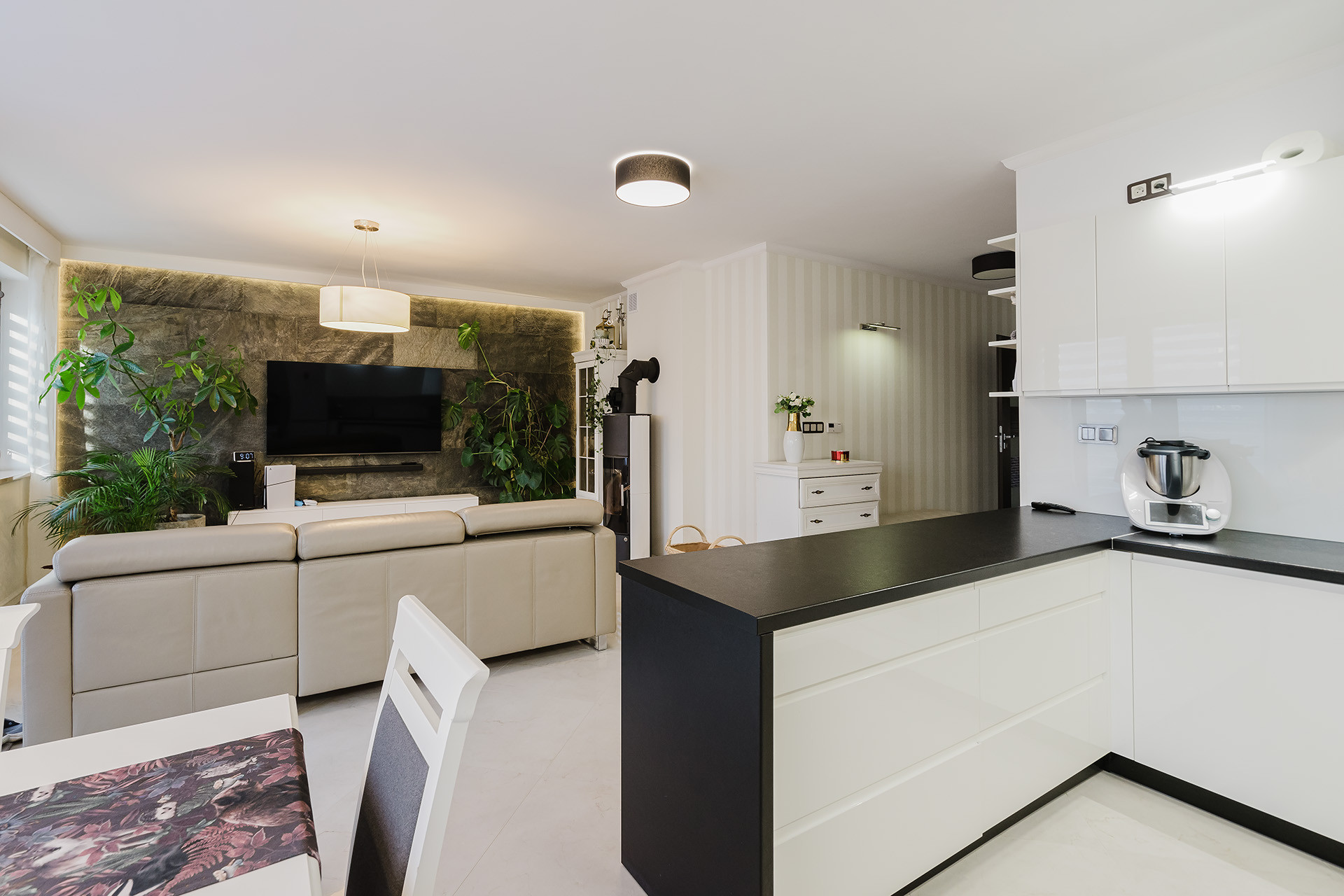 – przestronny salon z jadalnią, aneksem kuchennym z wyjściem na taras i ogród