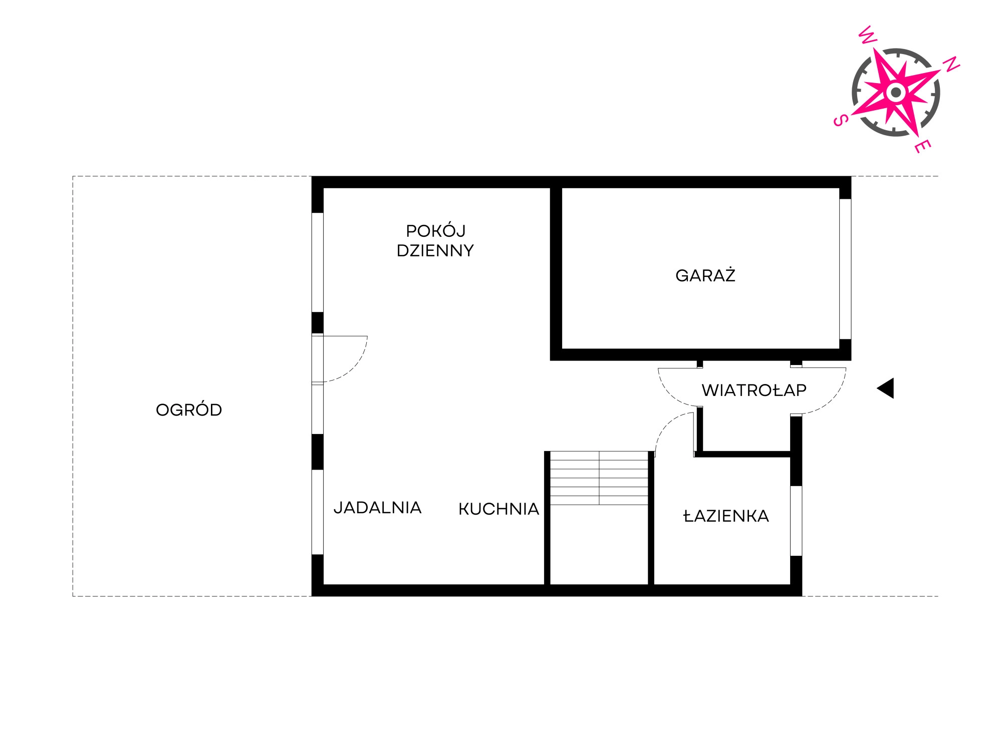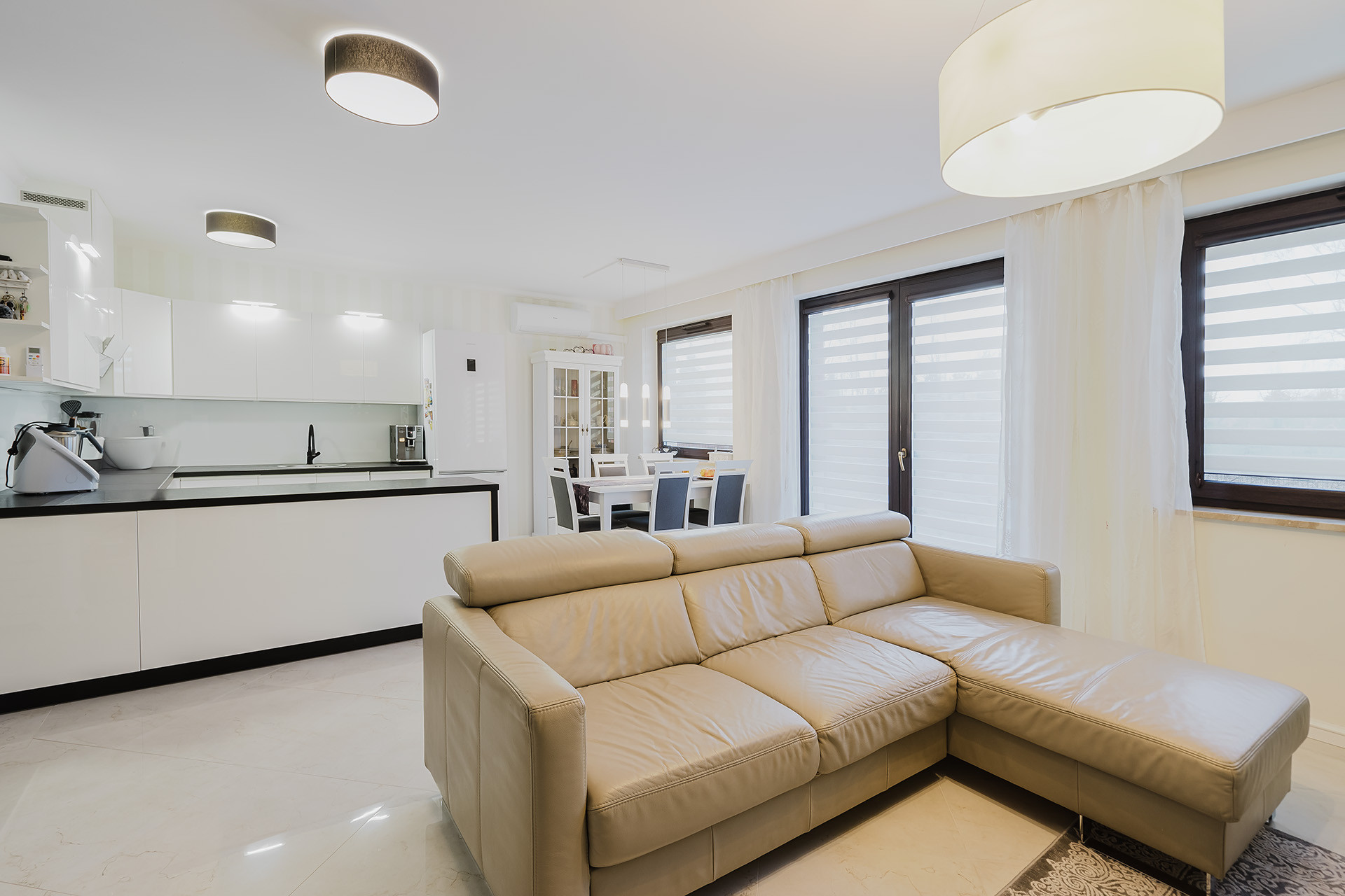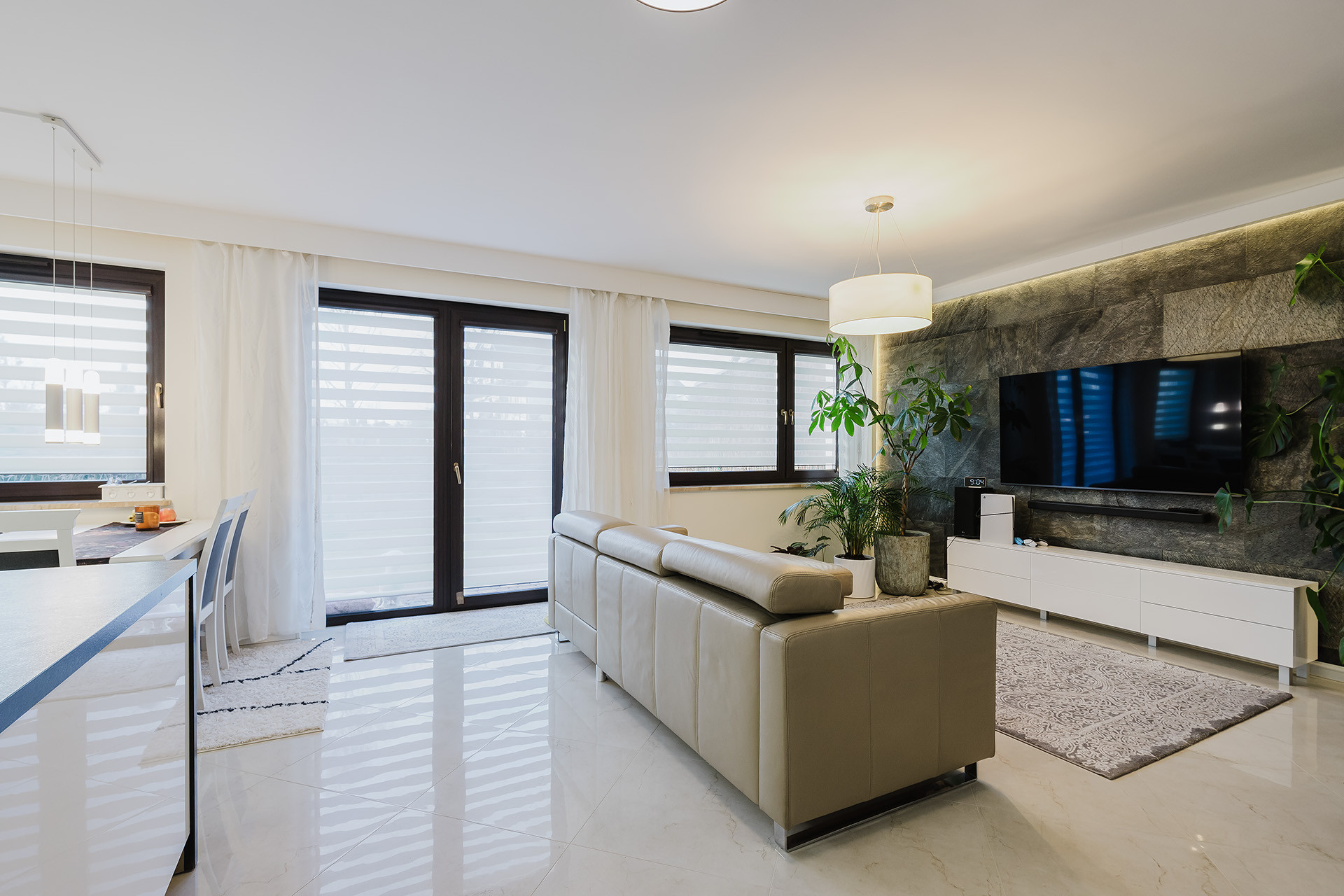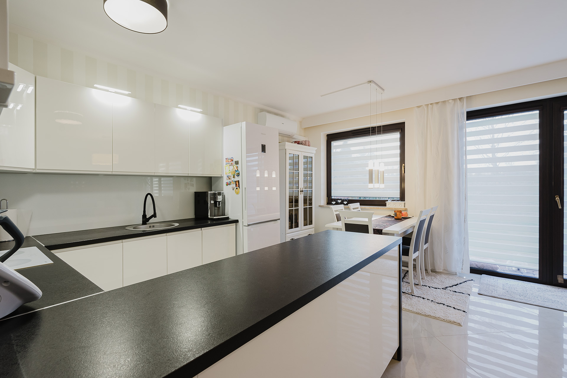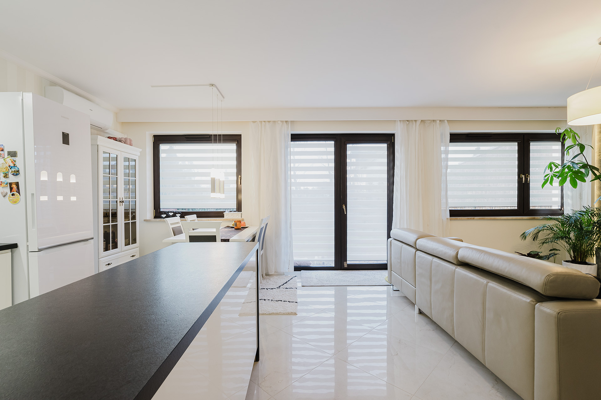 – przestronny salon z jadalnią, aneksem kuchennym z wyjściem na taras i ogród