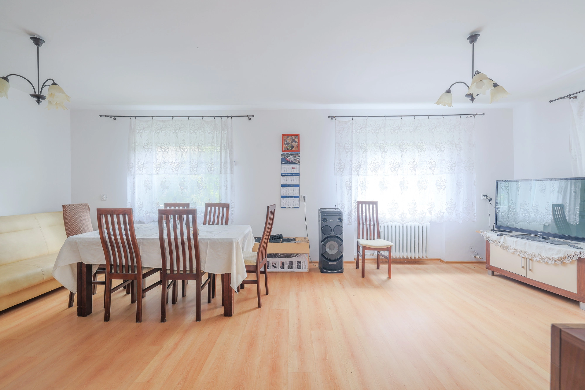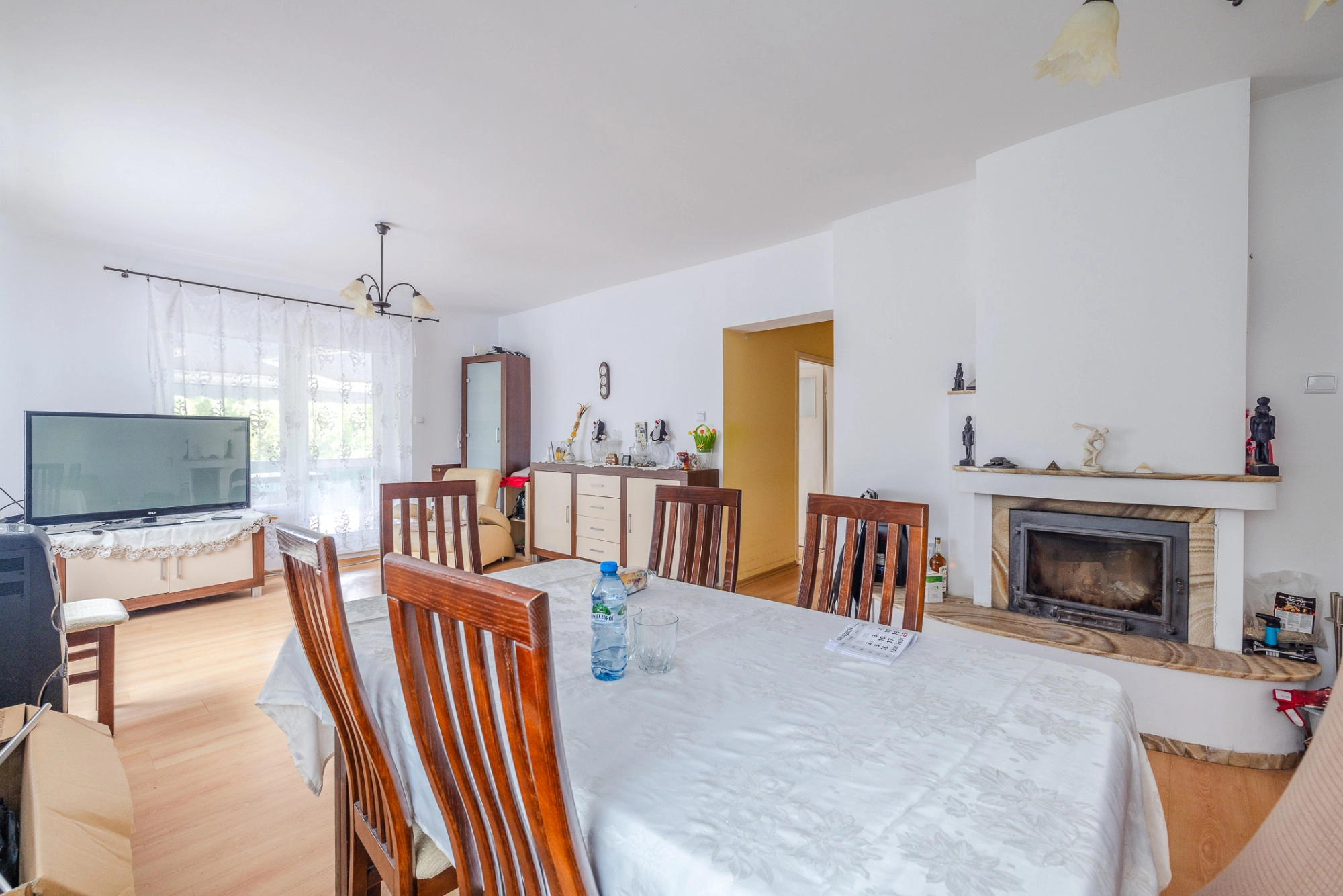 – salon z jadalnią (27,76 m2), kominkiem oraz wyjściem na taras (28,00 m2) z markizą i ogród,