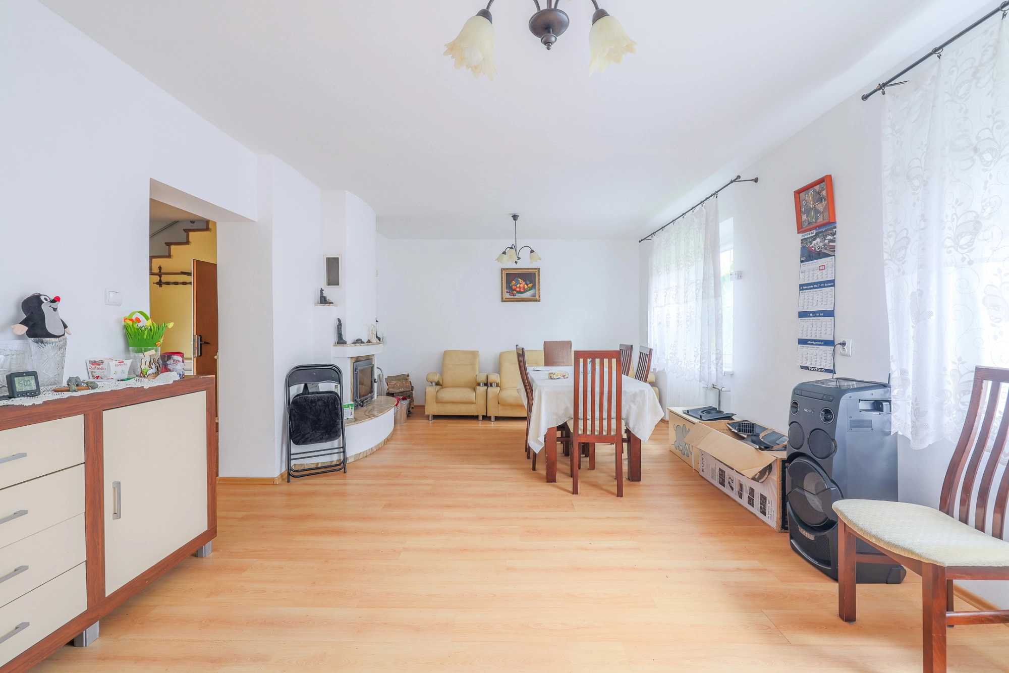 Na podłogach panele (pod nimi parkiet) oraz płytki. Budynek ocieplony styropianem o grubości 15 cm. Dodatkowo funkcję grzewczą pełni siding elewacyjny.