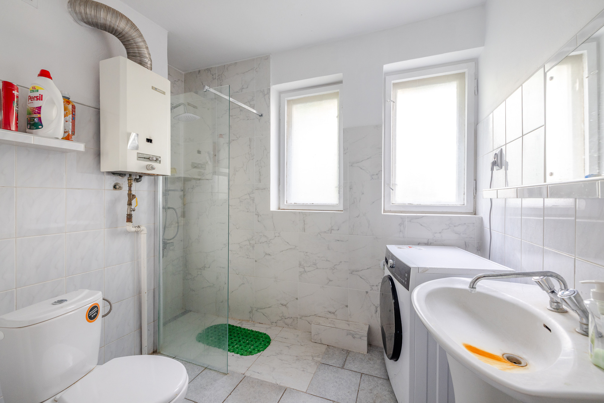 – łazienka (5,47 m2) z WC, prysznicem bezprogowym, pralką, umywalką, lustrem i dwoma oknami,