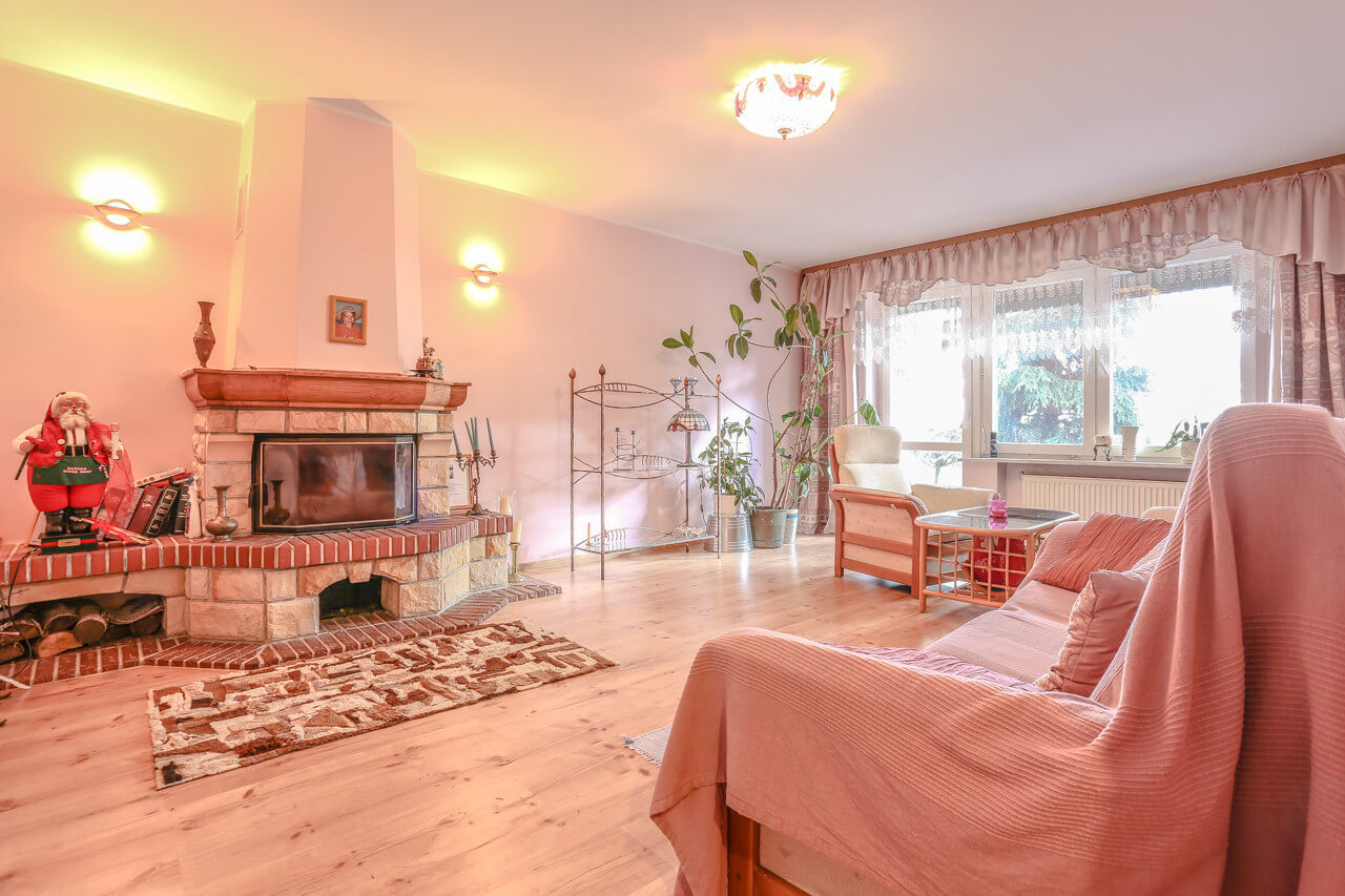 BUDYNEK: Dom w zabudowie szeregowej (szereg skrajny) o powierzchni użytkowej 248,31 m2 z 2000 roku. Jako jedyny dom został wybudowany z cegły. Na dachu dachówka ceramiczna. Stolarka okienna drewniana. Wysokiej jakości piec gazowy.