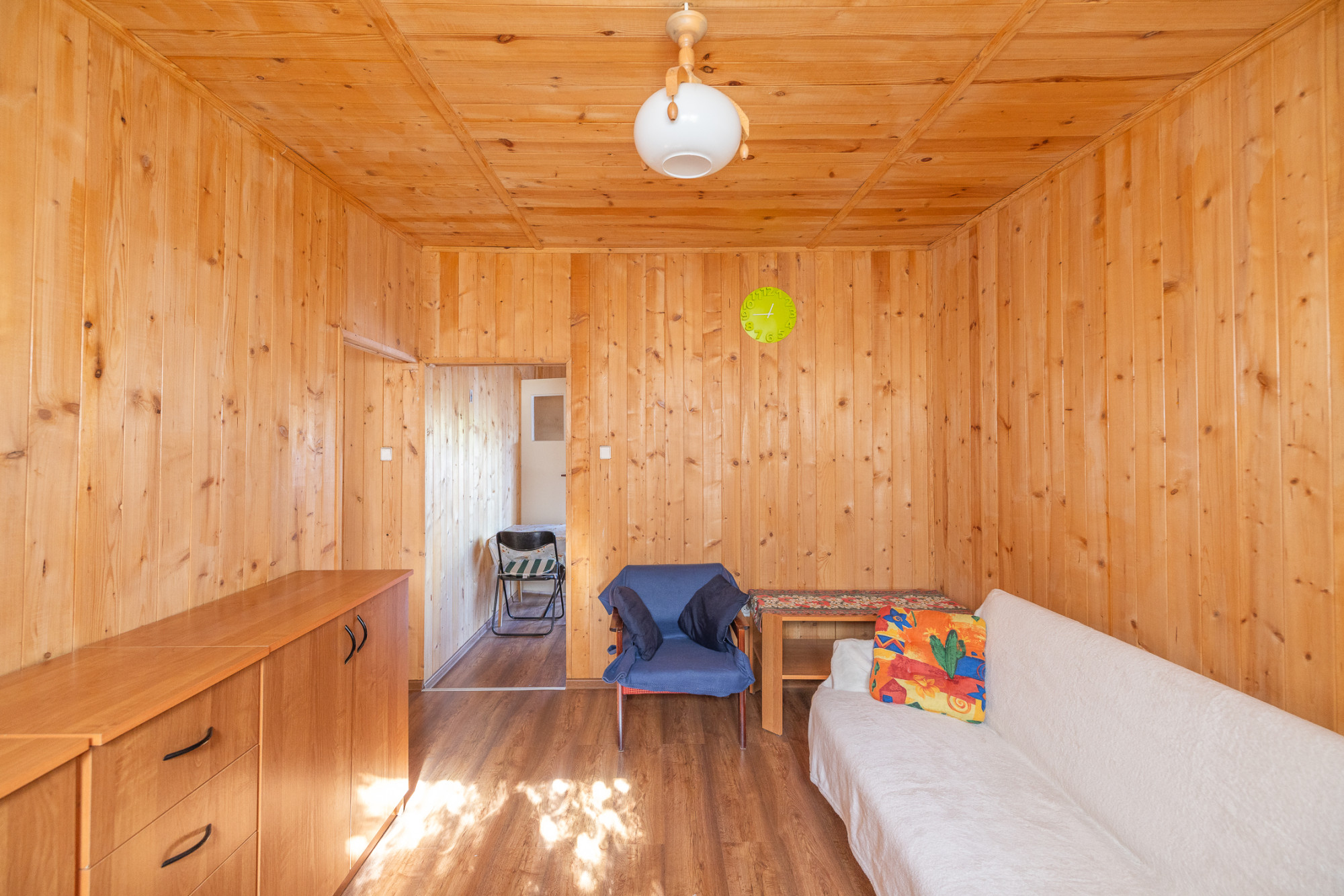 Domek zbudowany i wykończony z drewna (boazeria). Jest w dobrym stanie technicznym, na nowych drewnianych legarach, okna drewniane.