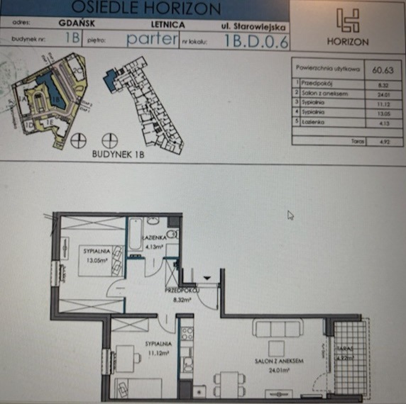 3 pokojowe o powierzchni 60,63 m2 składa się z pokoju dziennego z aneksem kuchennym, dwóch sypialni, łazienki i przedpokoju. Ogromnym atutem nieruchomości jest fakt ,iz posiada taras : 4,92 m2 .