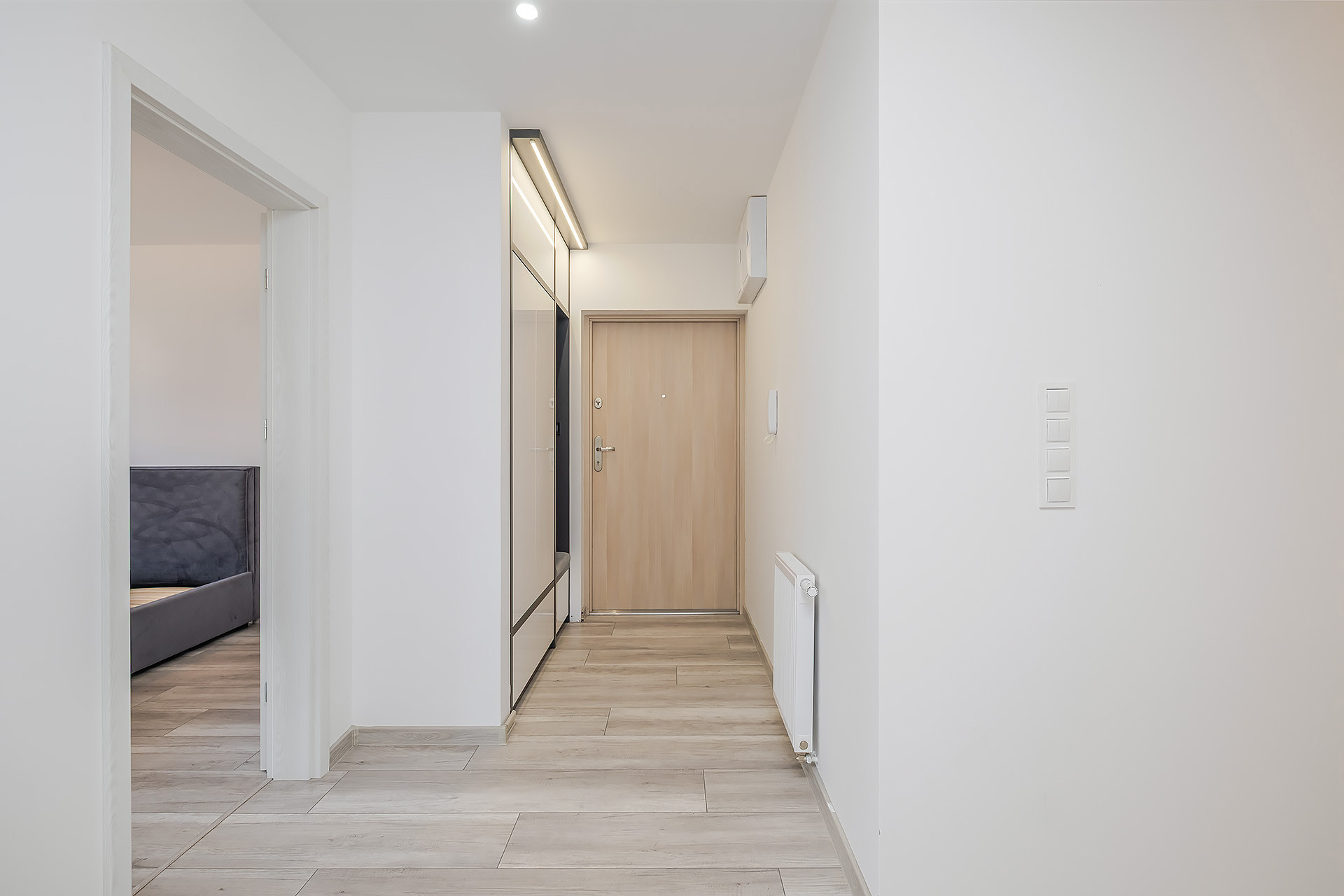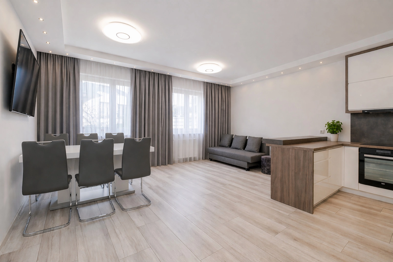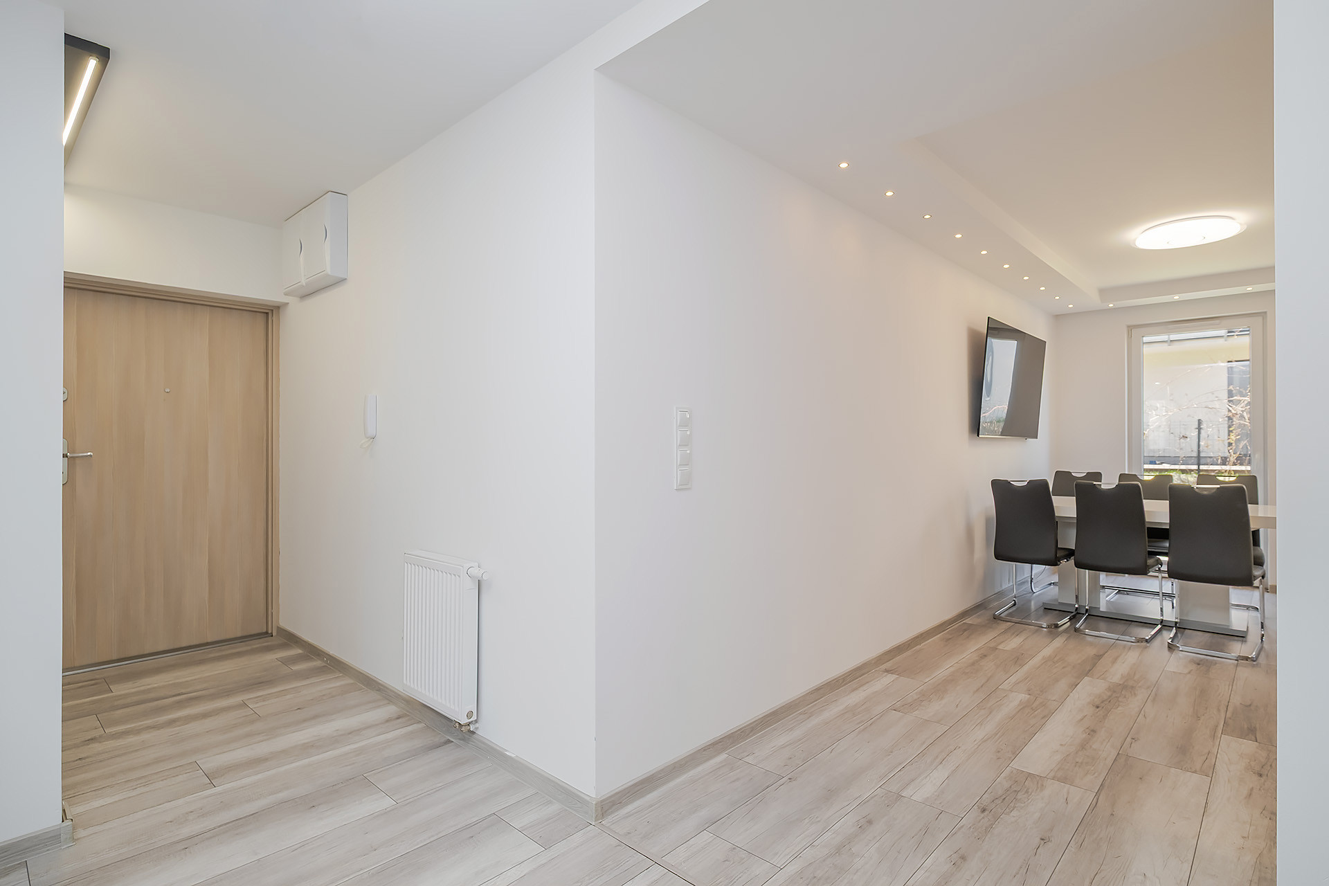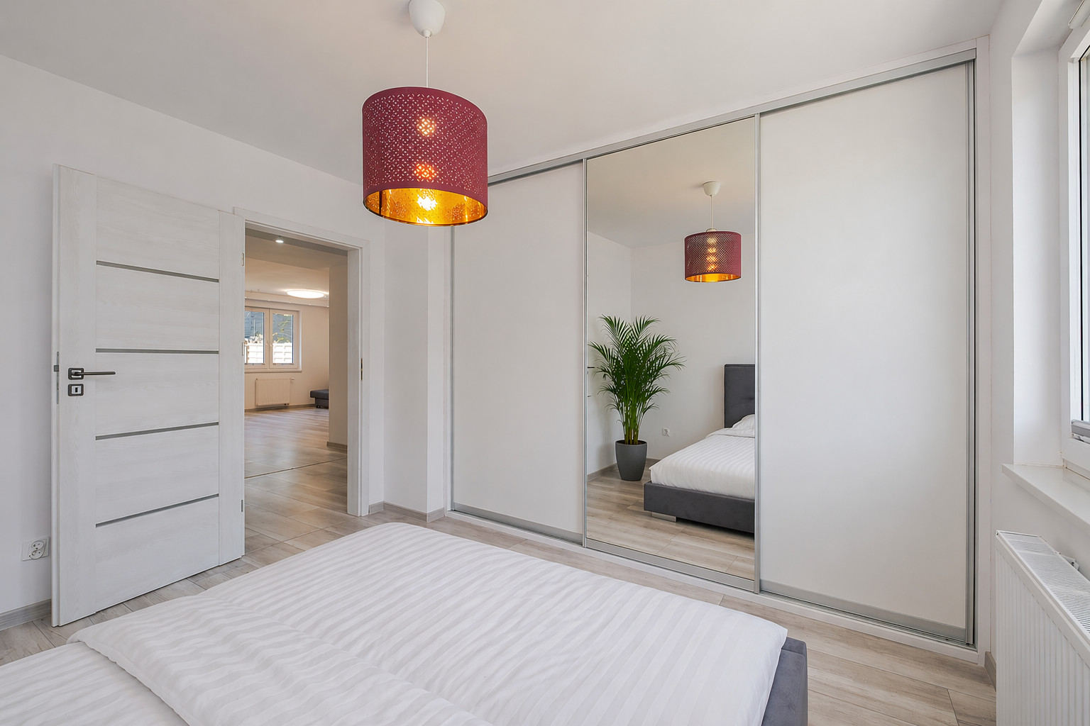 Mieszkanie zostało wykończone w wysokim standardzie, z wyjątkową dbałością o każdy detal. Zabudowa kuchenna, łazienkowa oraz wszystkie szafy zostały wykonane na zamówienie przez stolarza, co gwarantuje najwyższą jakość oraz pełne wykorzystanie przestrzeni.