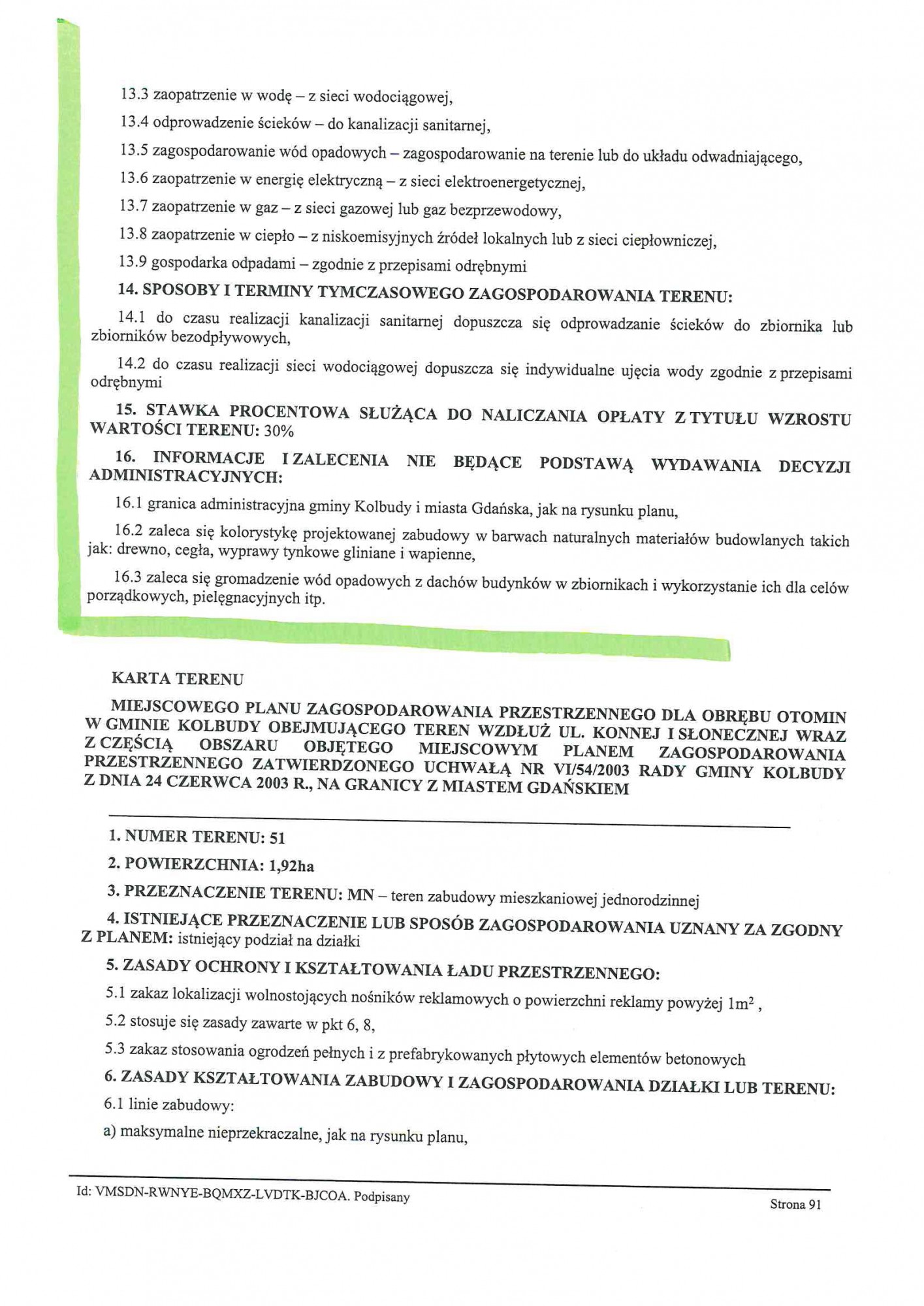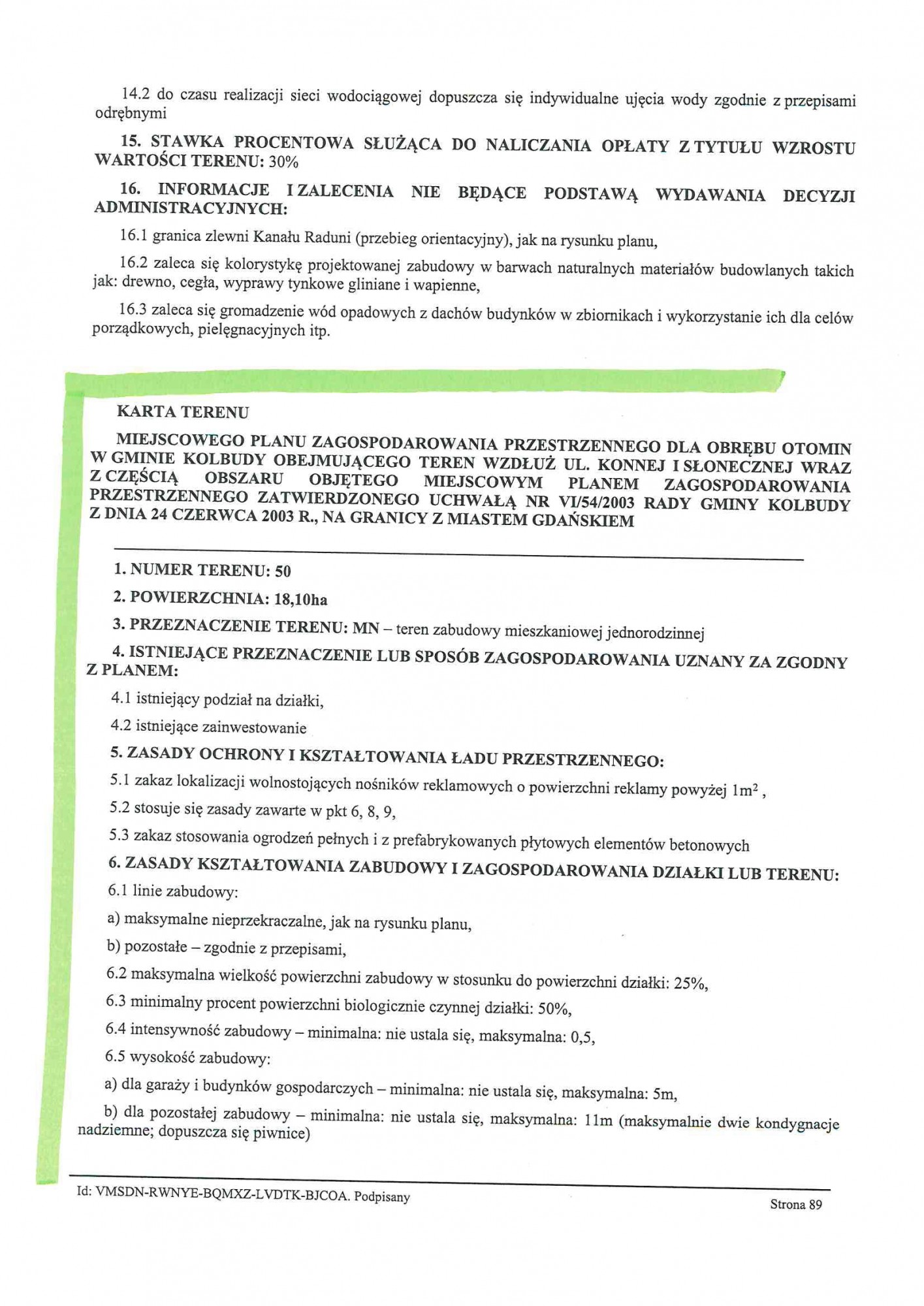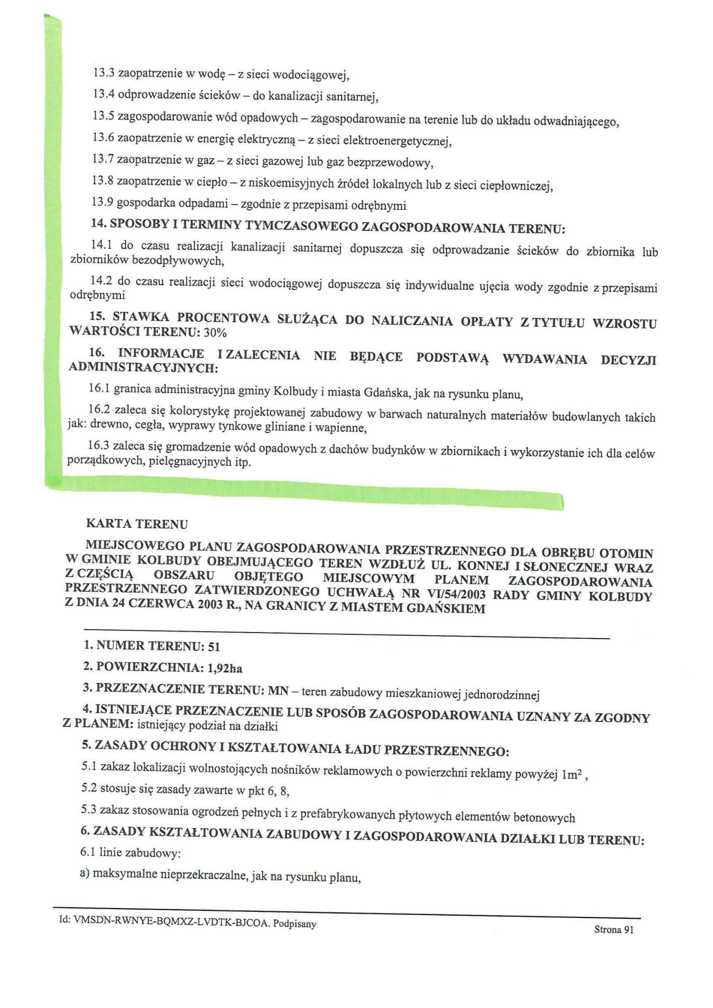 Nieruchomość objęta jest obowiązującym planem miejscowym zagospodarowania przestrzennego (Uchwała nr XXXVII/293/2010 Rady Gminy Kolbudy z dnia 27 kwietnia 2010 r.). KARTA TERENU OZNACZONEGO SYMBOLEM 50.MN.