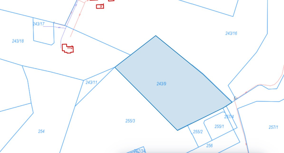 Działka o numerze 243/9 o powierzchni 1,1750 ha, w kształcie zbliżonym do prostokąta.