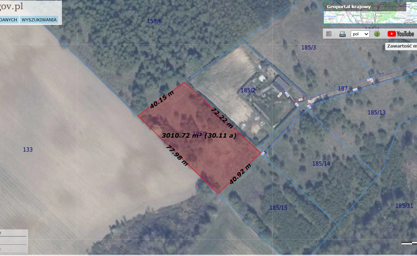 Powierzchnia: 3013 m2, płaska w kształcie prostokąta, ogrodzona siatką