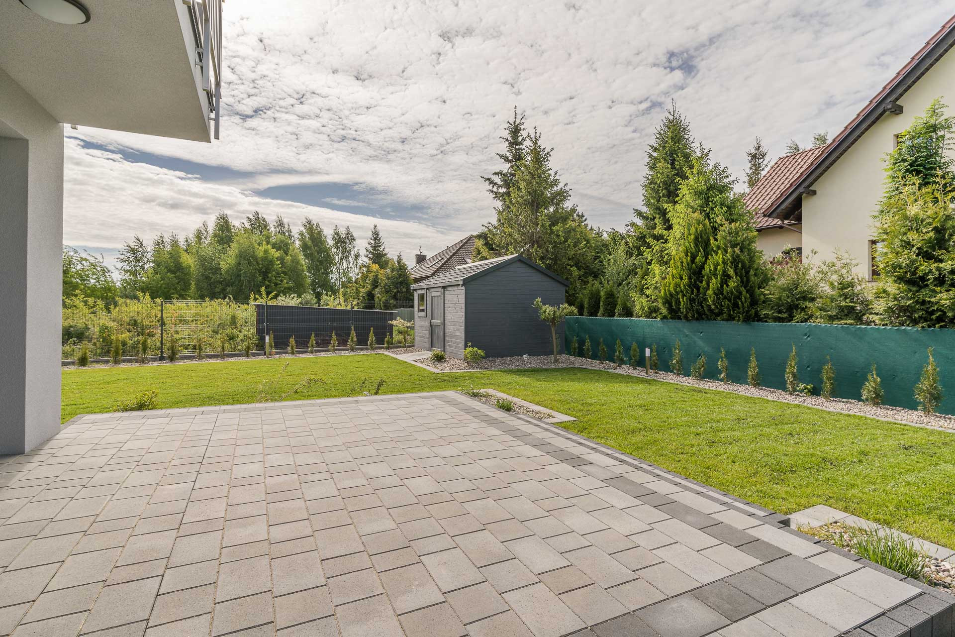 OGRÓD: ok 360 m.kw. pięknie zagospodarowanej powierzchni – trawnik, chodniki, obrzeża, taras, duża altana narzędziowa, robot koszący, całość ogrodzona