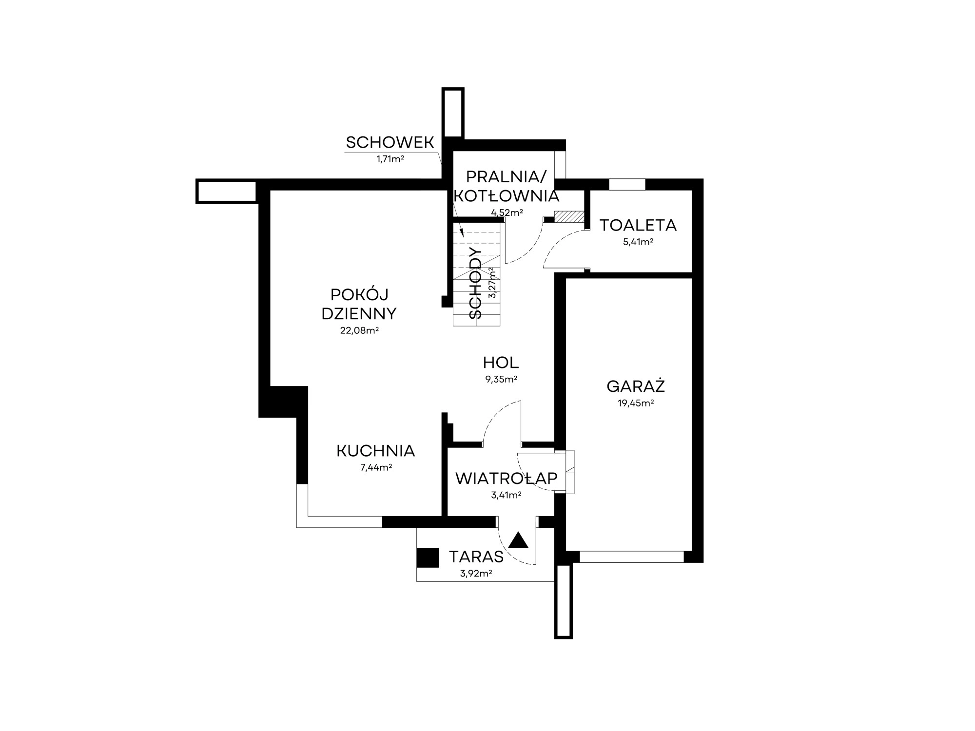 PARTER: salon z kuchnią, wc, kotłownia i GARAŻ z przejściem do domu + 3 miejsca postojowe zewnętrzne