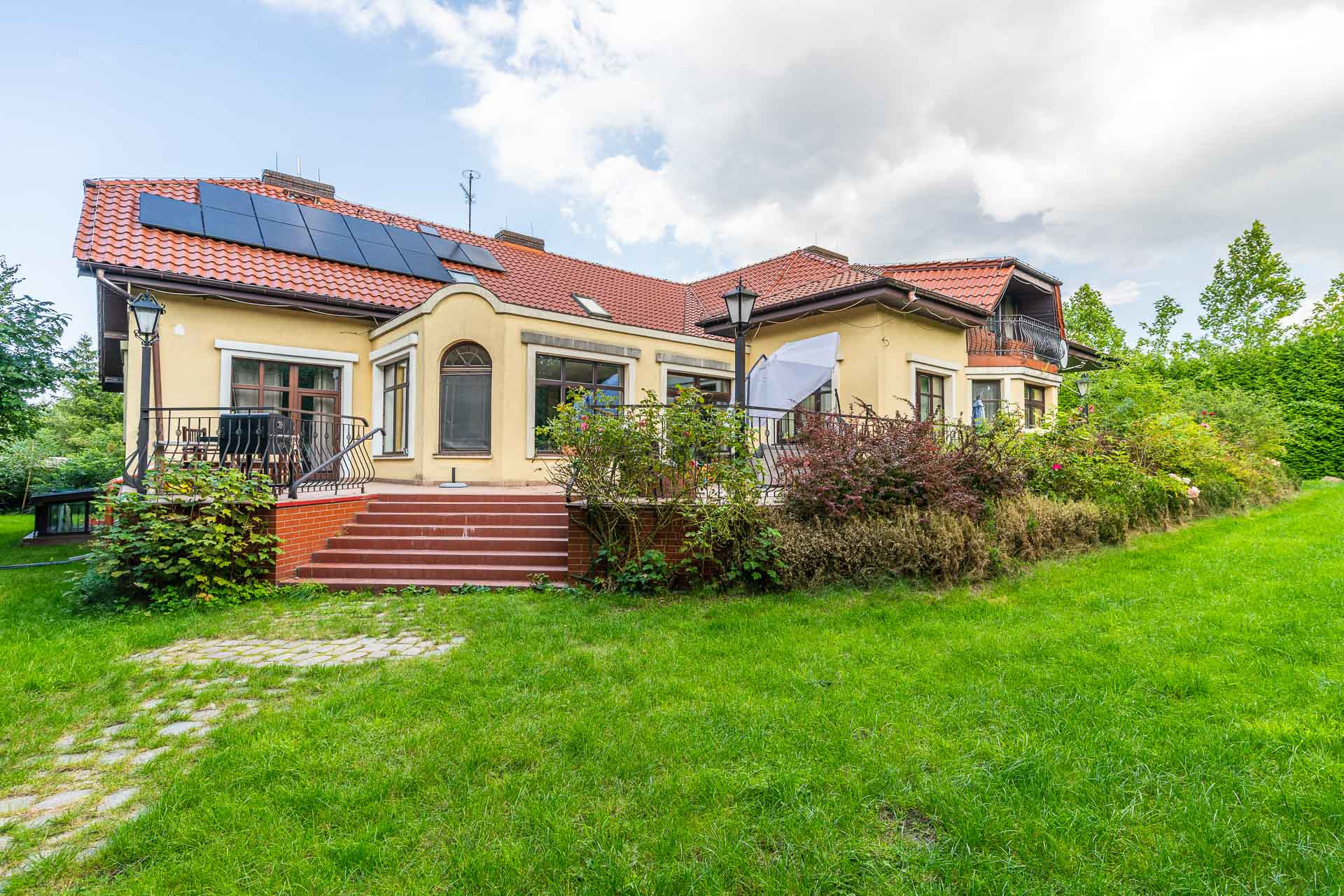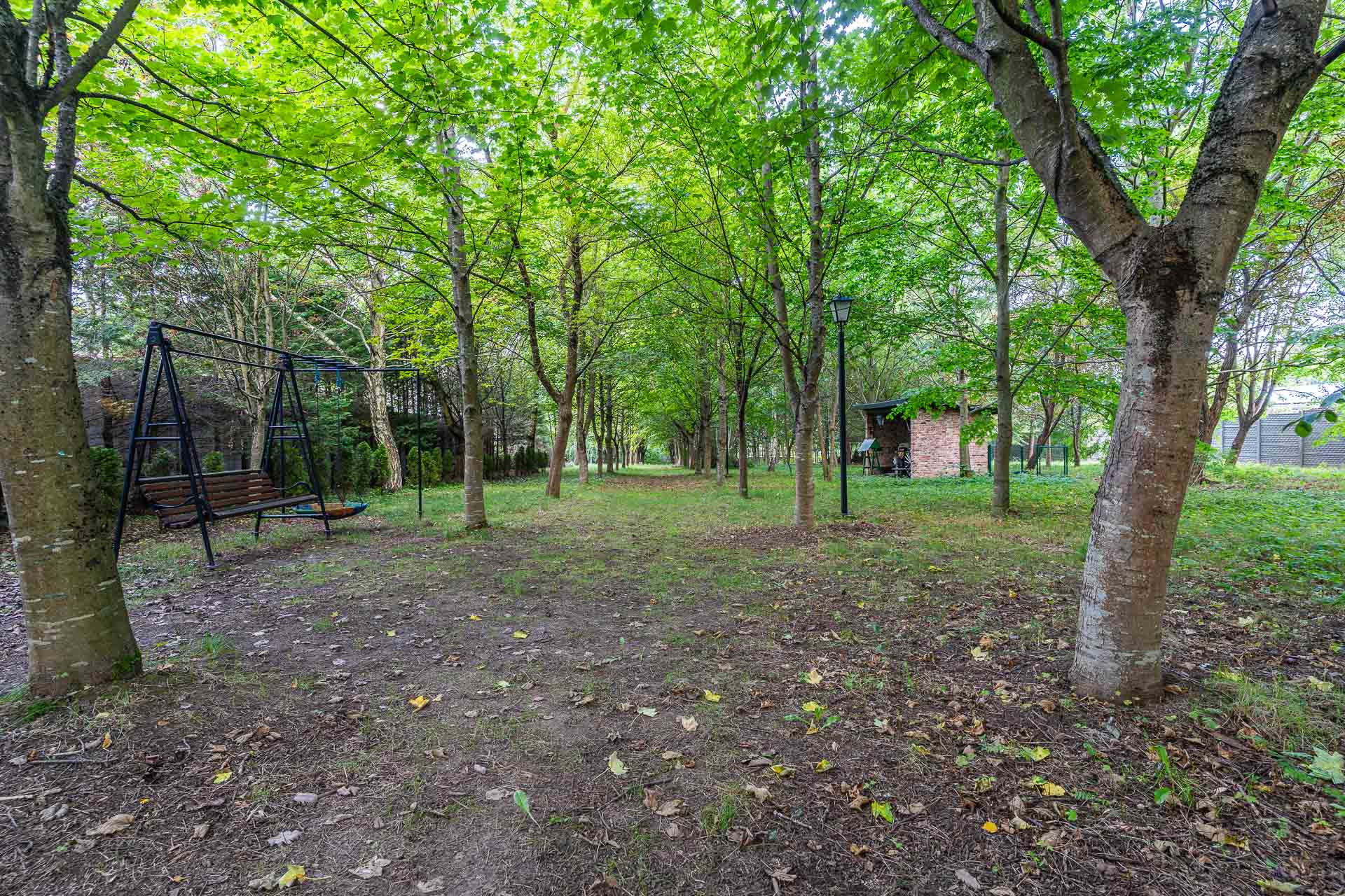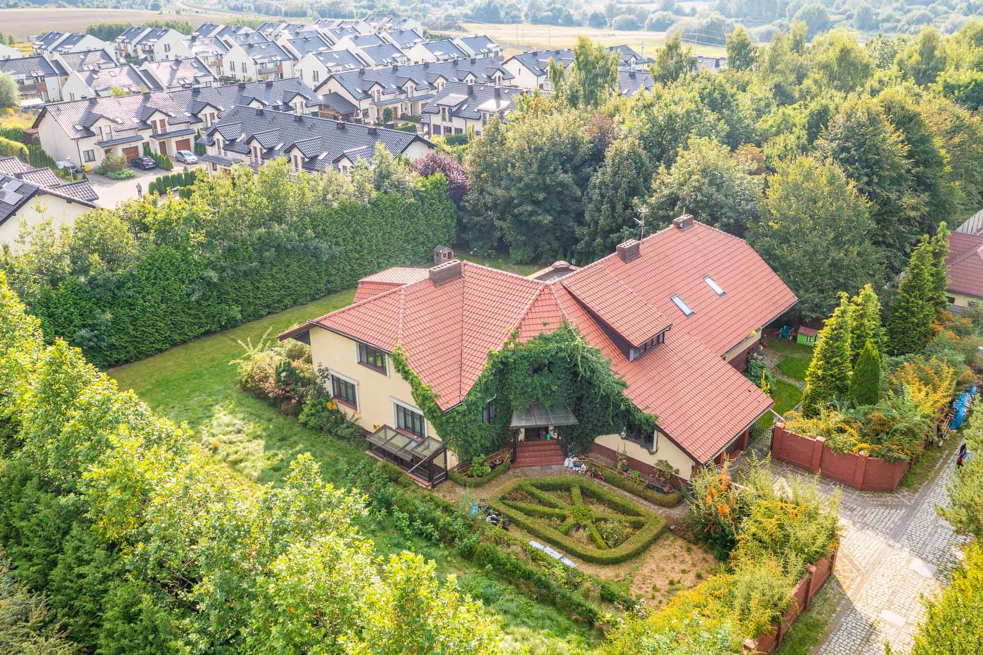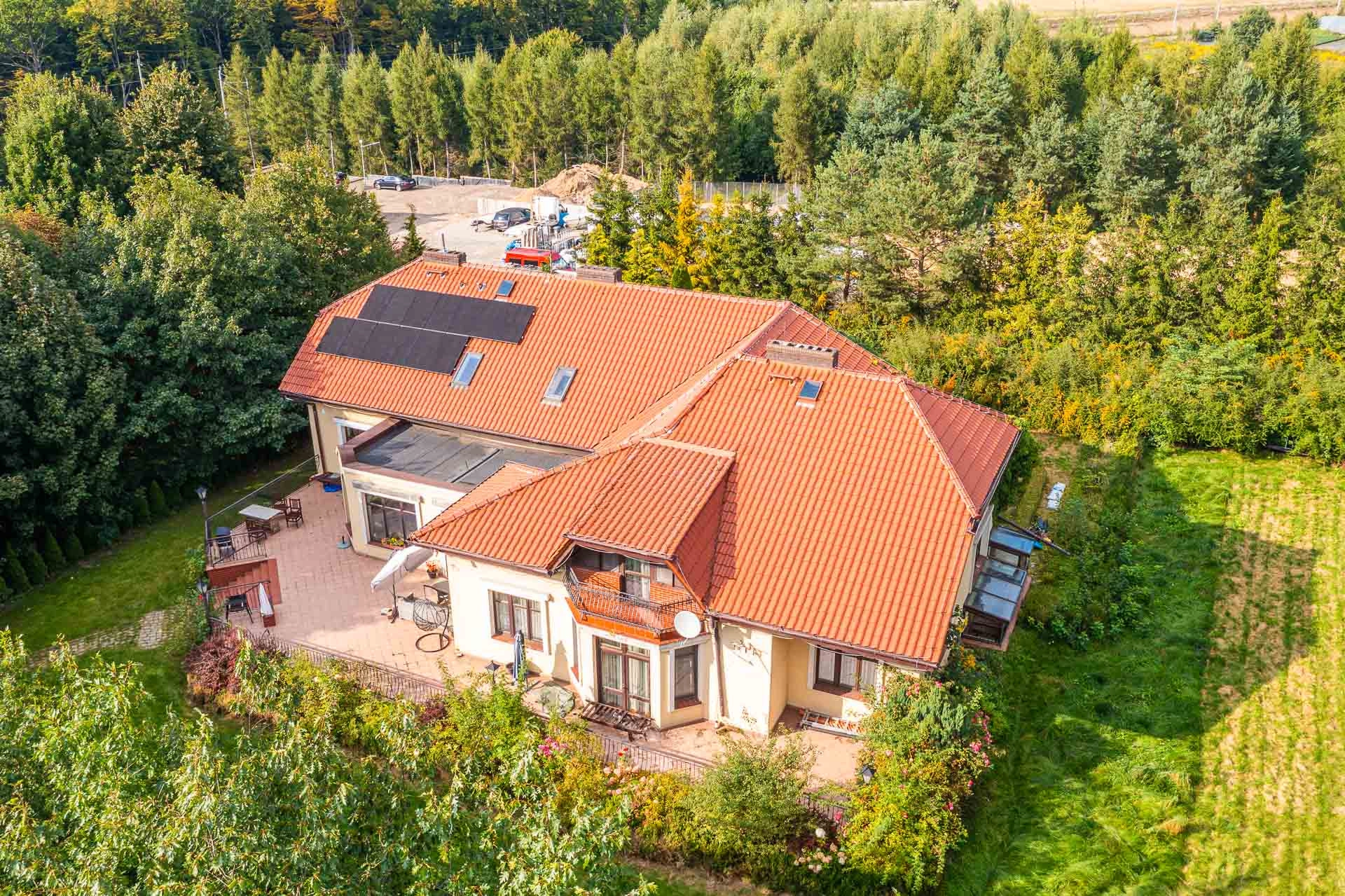 Wyjątkowy duży dom posadowiony na nieruchomości o powierzchni ok. 7,7 tys. m2. Dom podzielony na dwie niezależne funkcyjnie części, które mogą być odpowiednie albo dla dwóch rodzin albo dla wielopokoleniowej rodziny. Jedna z nich (tak jak dzisiaj może być przeznaczona na wynajem). Z domu wyjście n przestronny ogród, który na powierzchni ok. 4 tys. z m2 wygląda jak park z regularnie posadzonymi drzewami.