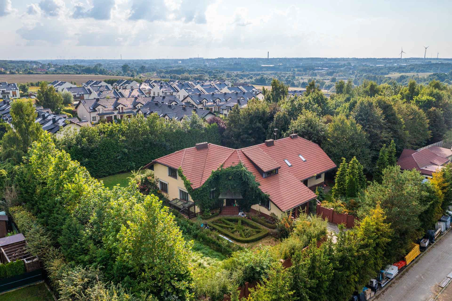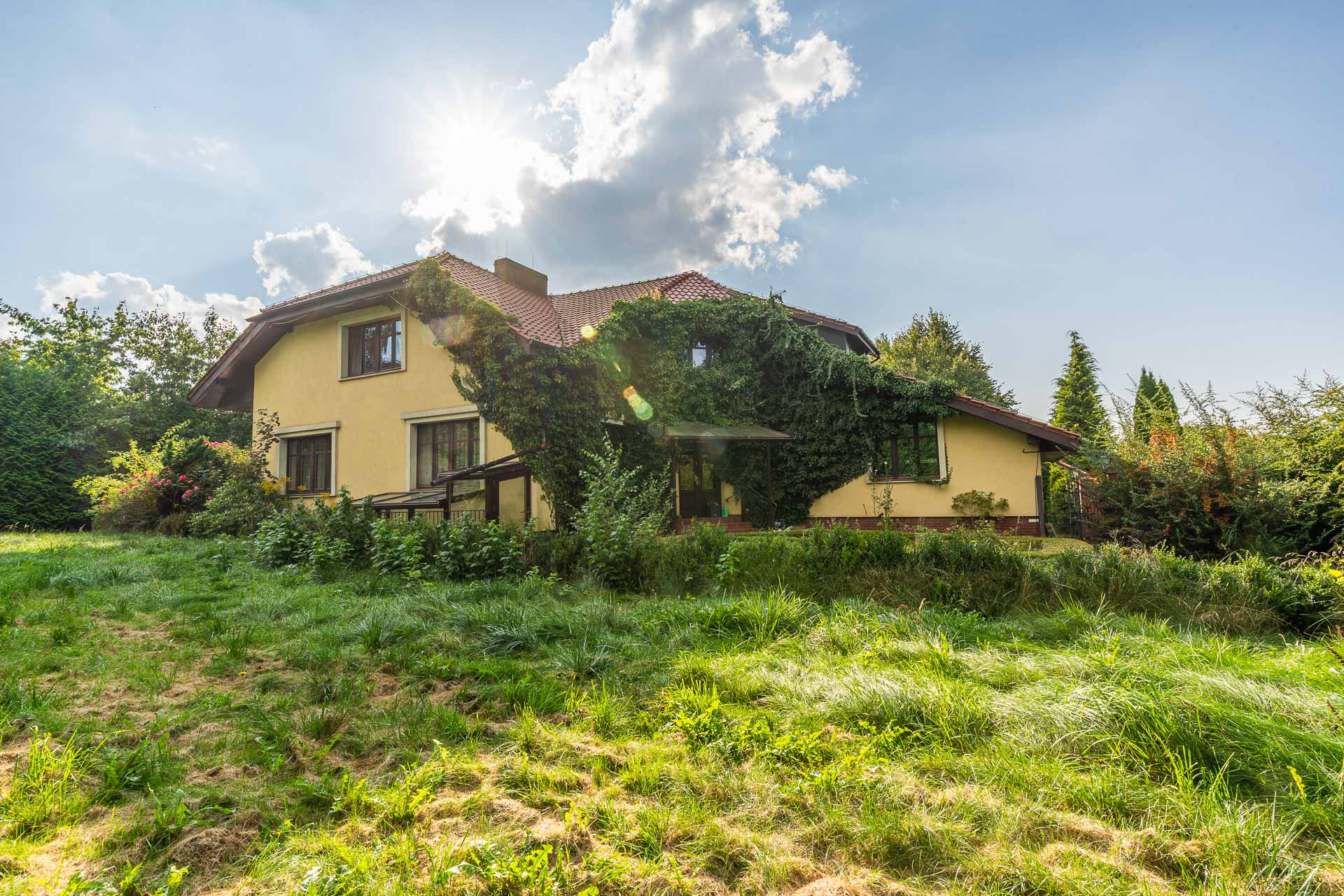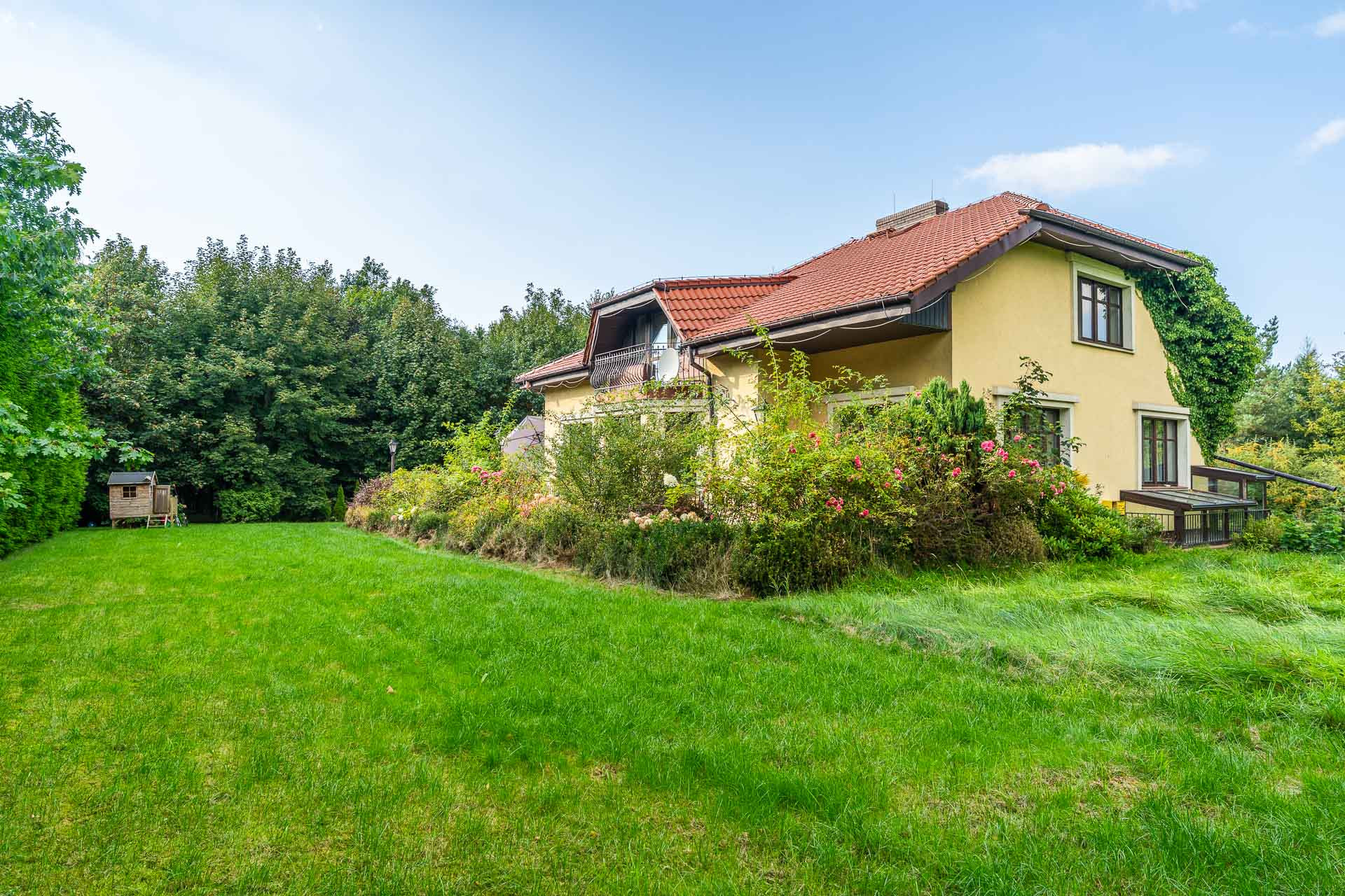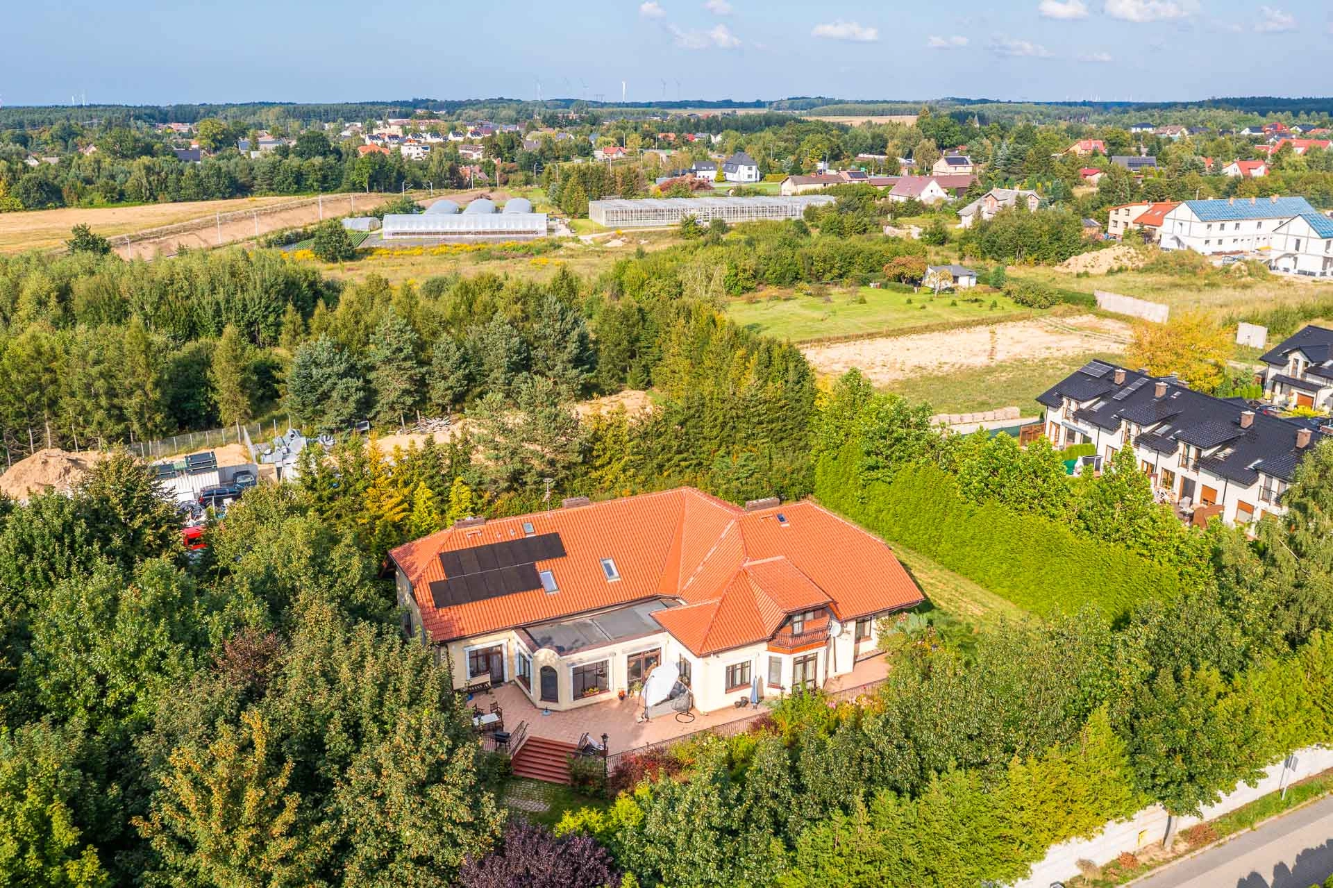 Wyjątkowy duży dom posadowiony na nieruchomości o powierzchni ok. 7,7 tys. m2. Dom podzielony na dwie niezależne funkcyjnie części, które mogą być odpowiednie albo dla dwóch rodzin albo dla wielopokoleniowej rodziny. Jedna z nich (tak jak dzisiaj może być przeznaczona na wynajem). Z domu wyjście n przestronny ogród, który na powierzchni ok. 4 tys. z m2 wygląda jak park z regularnie posadzonymi drzewami.
