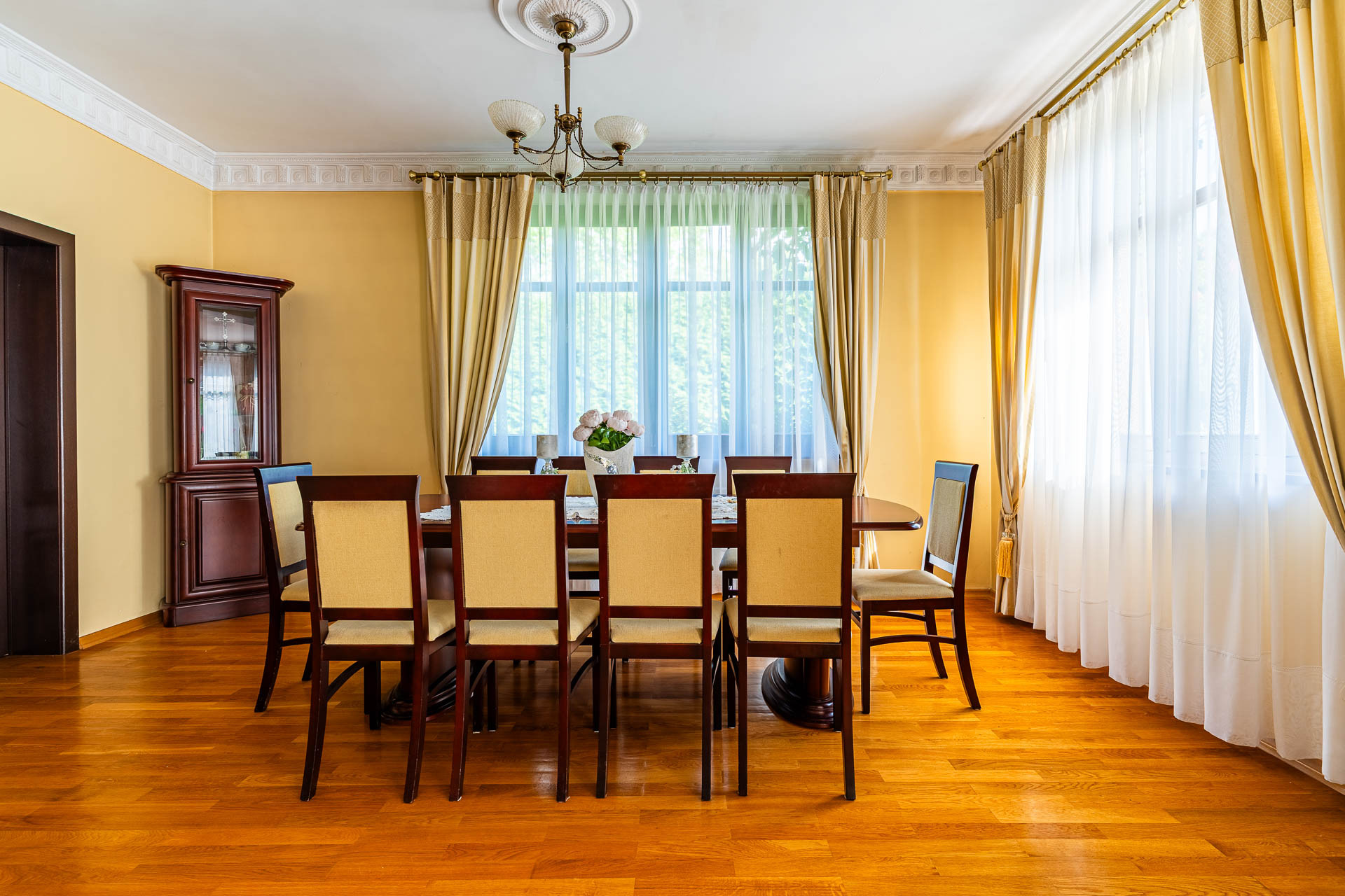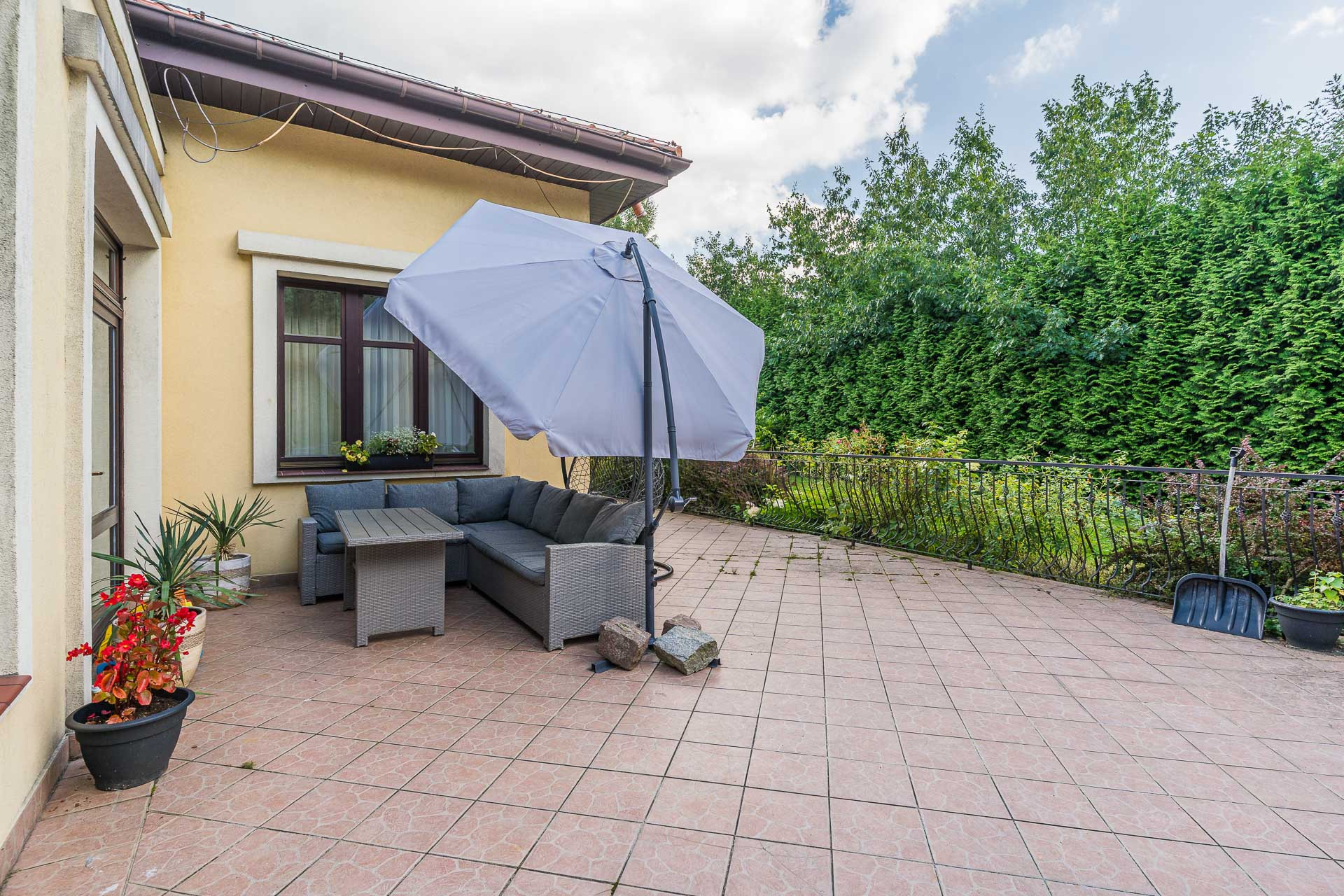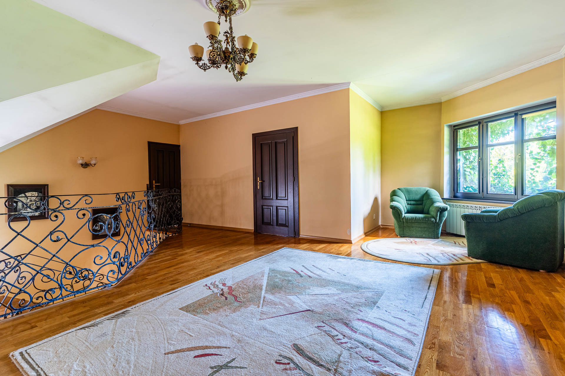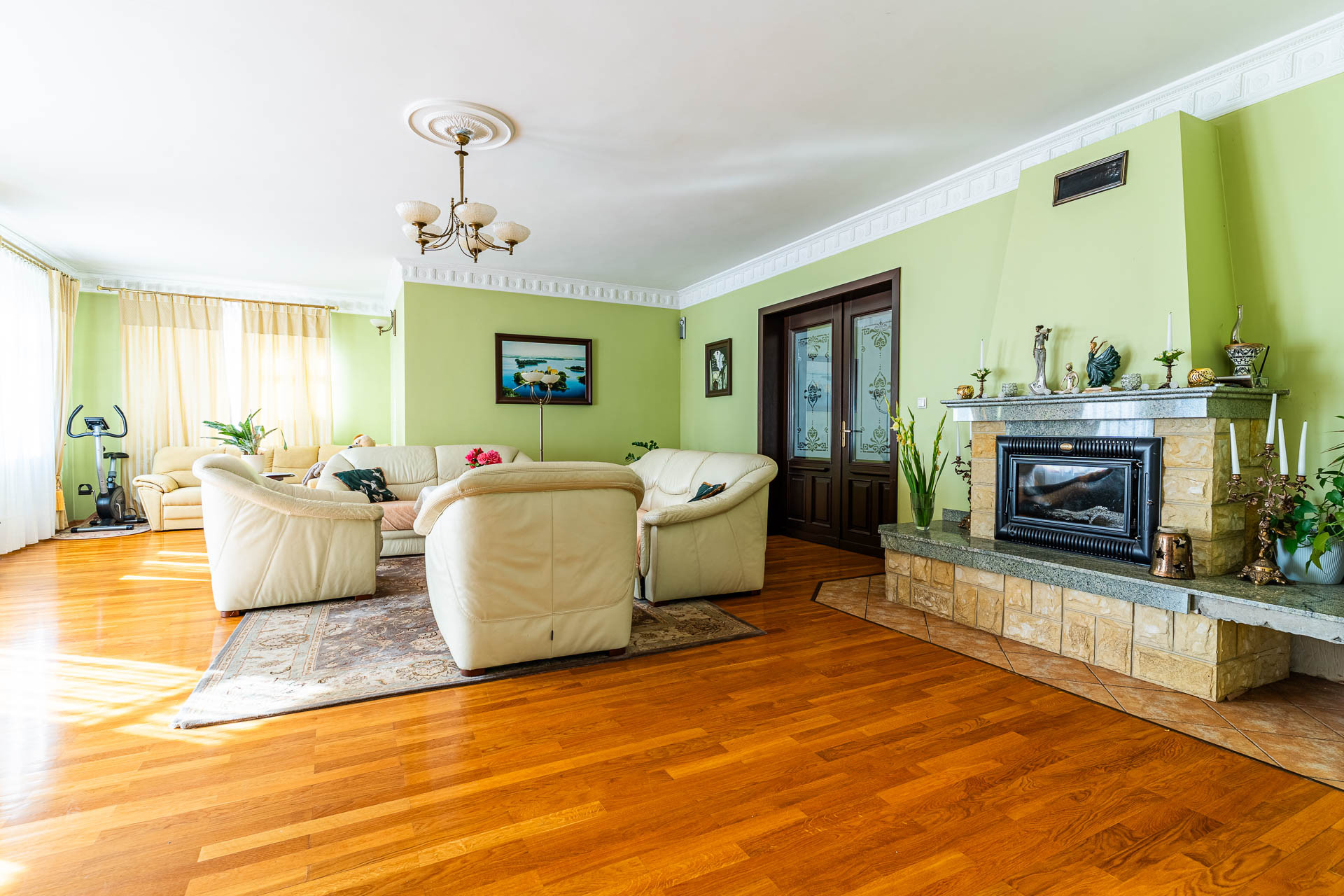 Wyjątkowy duży dom posadowiony na nieruchomości o powierzchni ok. 7,7 tys. m2. Dom podzielony na dwie niezależne funkcyjnie części, które mogą być odpowiednie albo dla dwóch rodzin albo dla wielopokoleniowej rodziny. Jedna z nich (tak jak dzisiaj może być przeznaczona na wynajem). Z domu wyjście n przestronny ogród, który na powierzchni ok. 4 tys. z m2 wygląda jak park z regularnie posadzonymi drzewami.