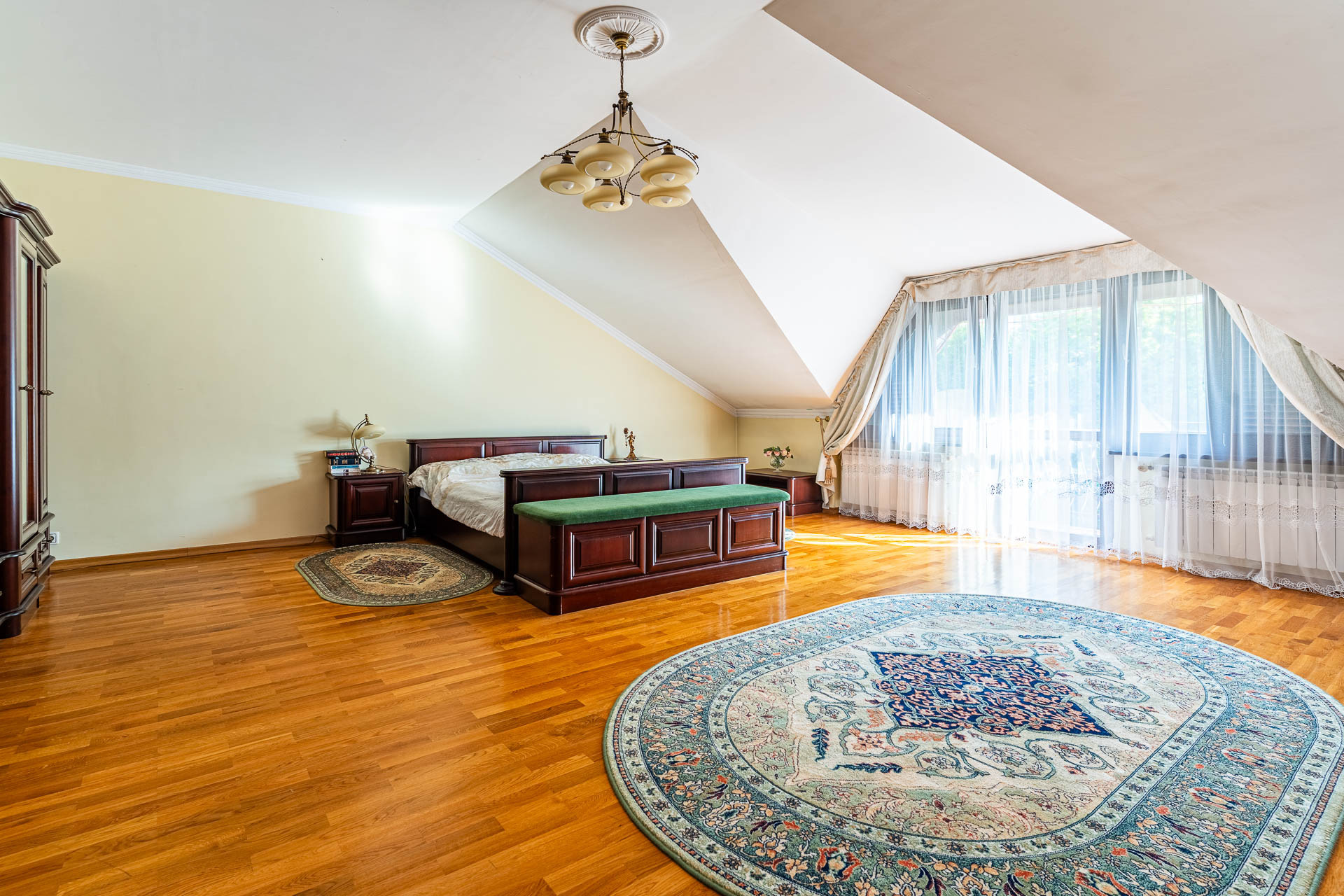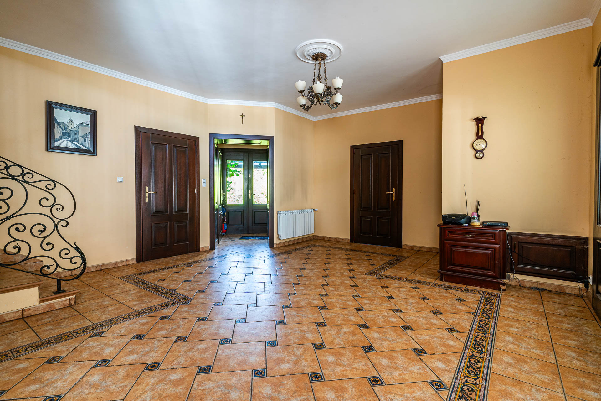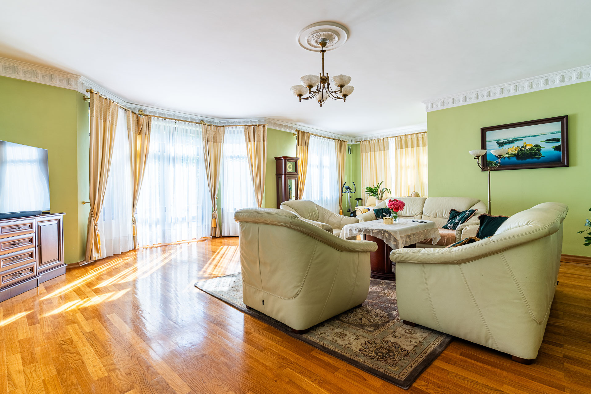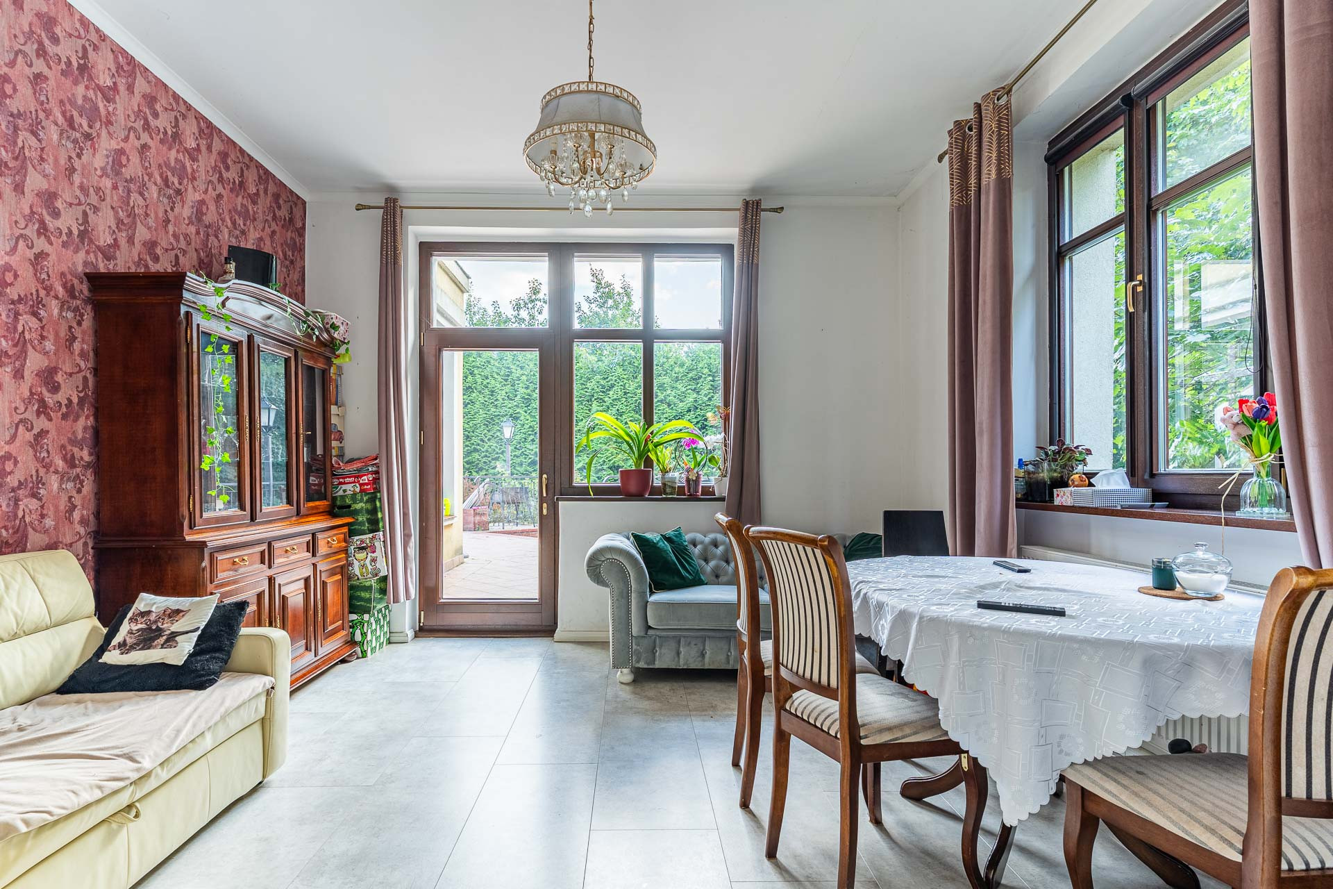 Wyjątkowy duży dom posadowiony na nieruchomości o powierzchni ok. 7,7 tys. m2. Dom podzielony na dwie niezależne funkcyjnie części, które mogą być odpowiednie albo dla dwóch rodzin albo dla wielopokoleniowej rodziny. Jedna z nich (tak jak dzisiaj może być przeznaczona na wynajem). Z domu wyjście n przestronny ogród, który na powierzchni ok. 4 tys. z m2 wygląda jak park z regularnie posadzonymi drzewami.