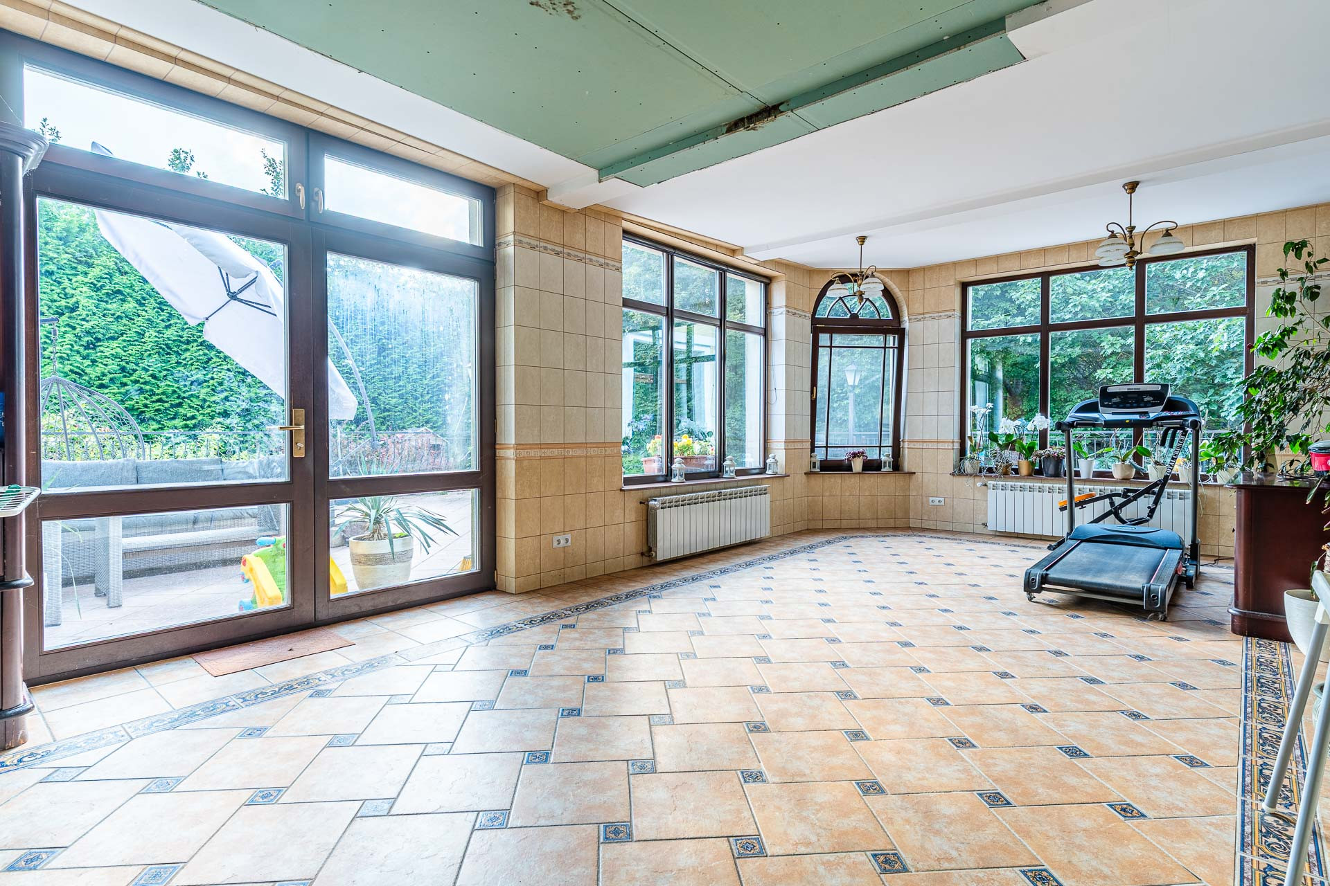 W większej części domu znajduje się duża zadaszona strefa rekreacyjno-wypoczynkowa, która wymaga odpowiedniej adaptacji. Znaleźć można w niej duży ogród zimowy z wyjściem na taras i miejscem pod wewnętrzny basen (około 85 m2), saunę, łazienkę z prysznicem i część gospodarczą.